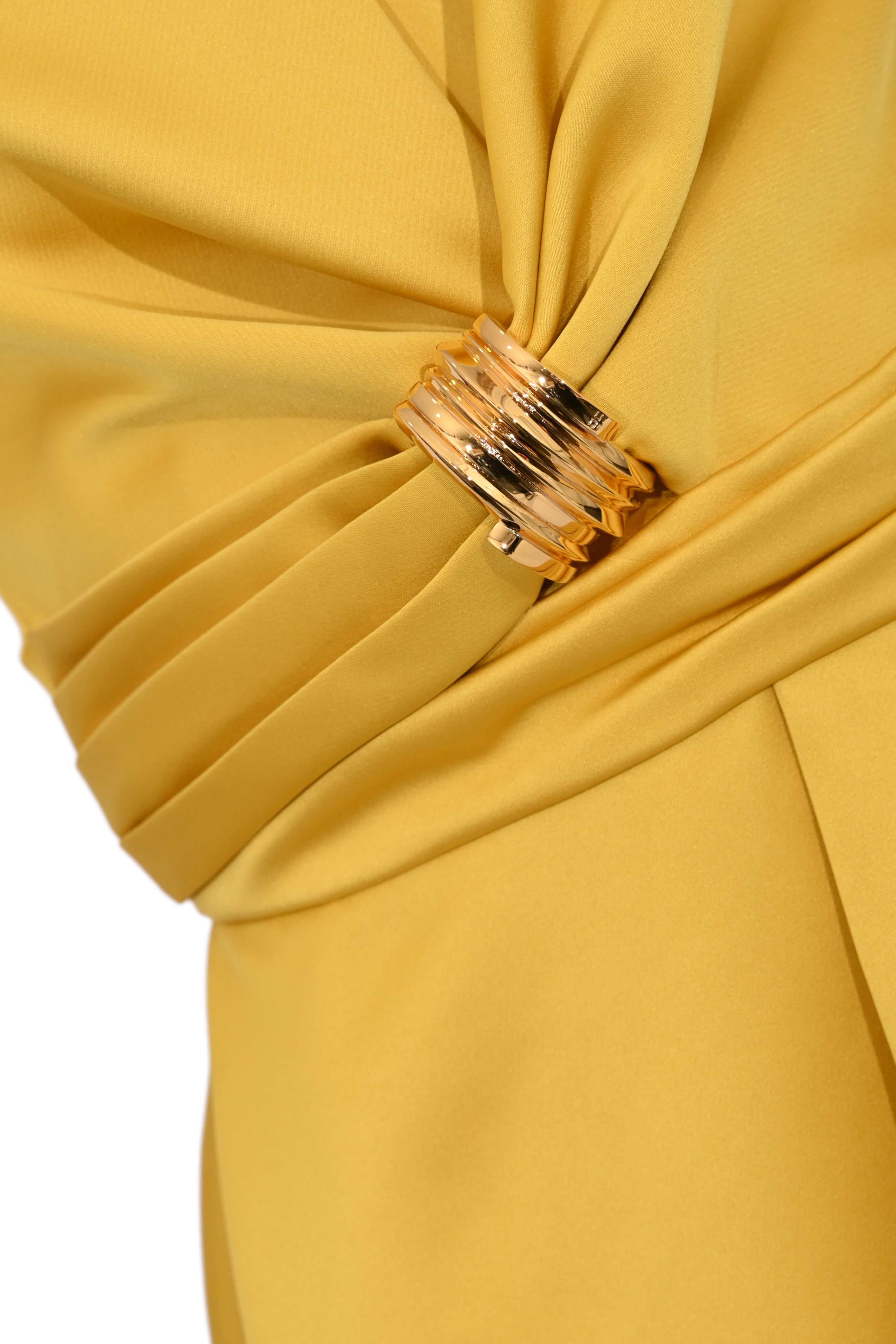 - Dettagli: drappeggio centrale sul busto con elemento gioiello dorato, punto vita definito, gonna svasata