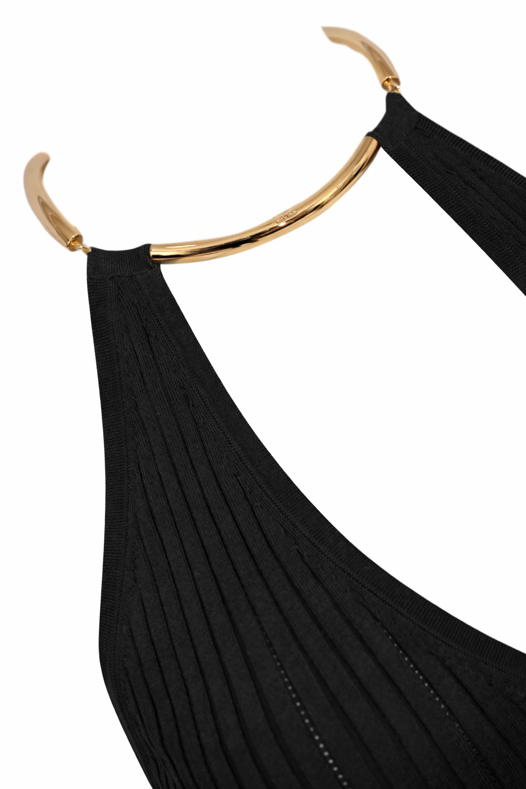 - Dettagli: lavorazione a costine, dettaglio gioiello metallico, linea aderente