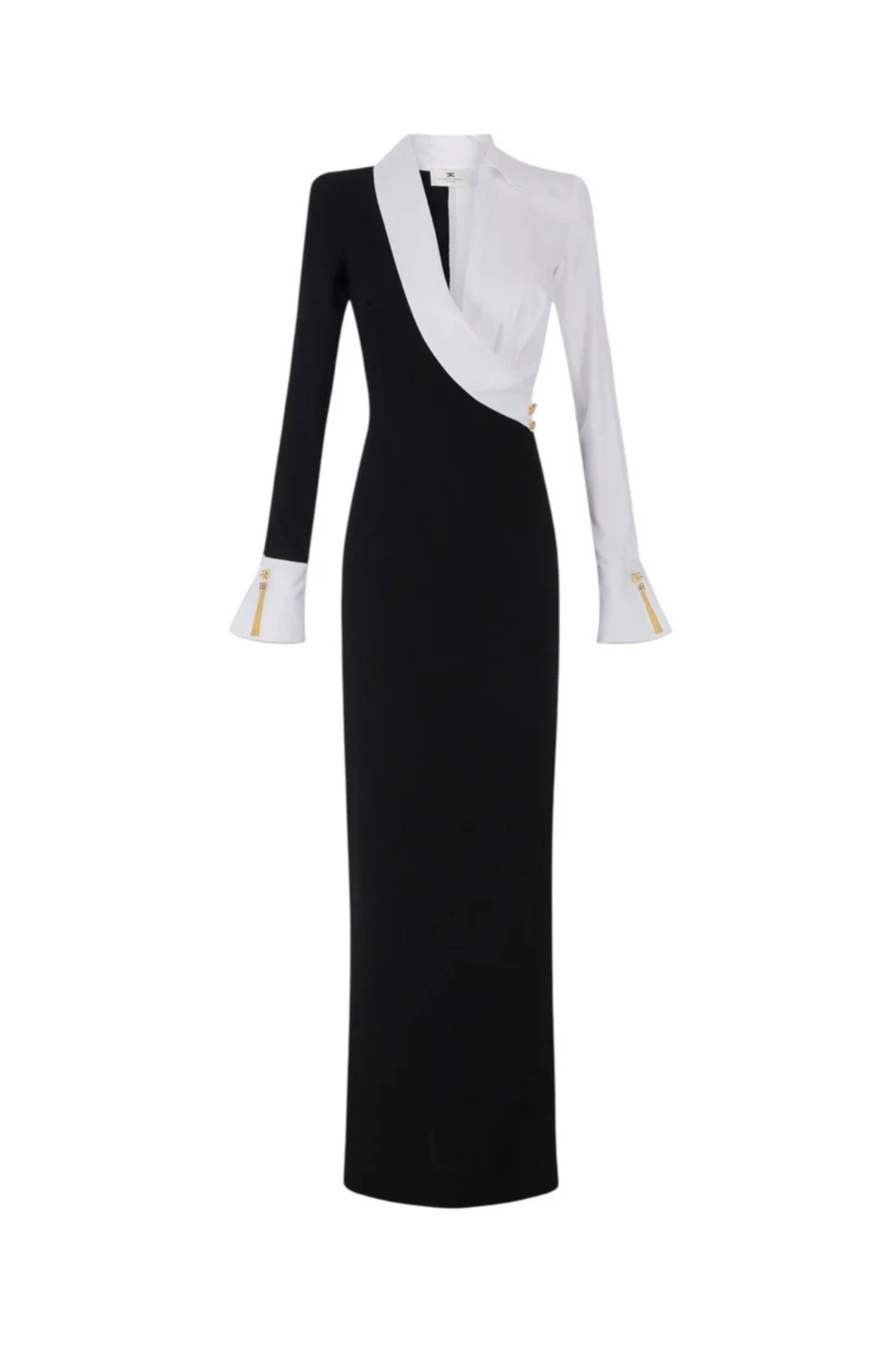 - Dettagli: Taglio asimmetrico con pannello bianco incrociato sul busto, linea aderente, inserti con zip dorate sui polsini