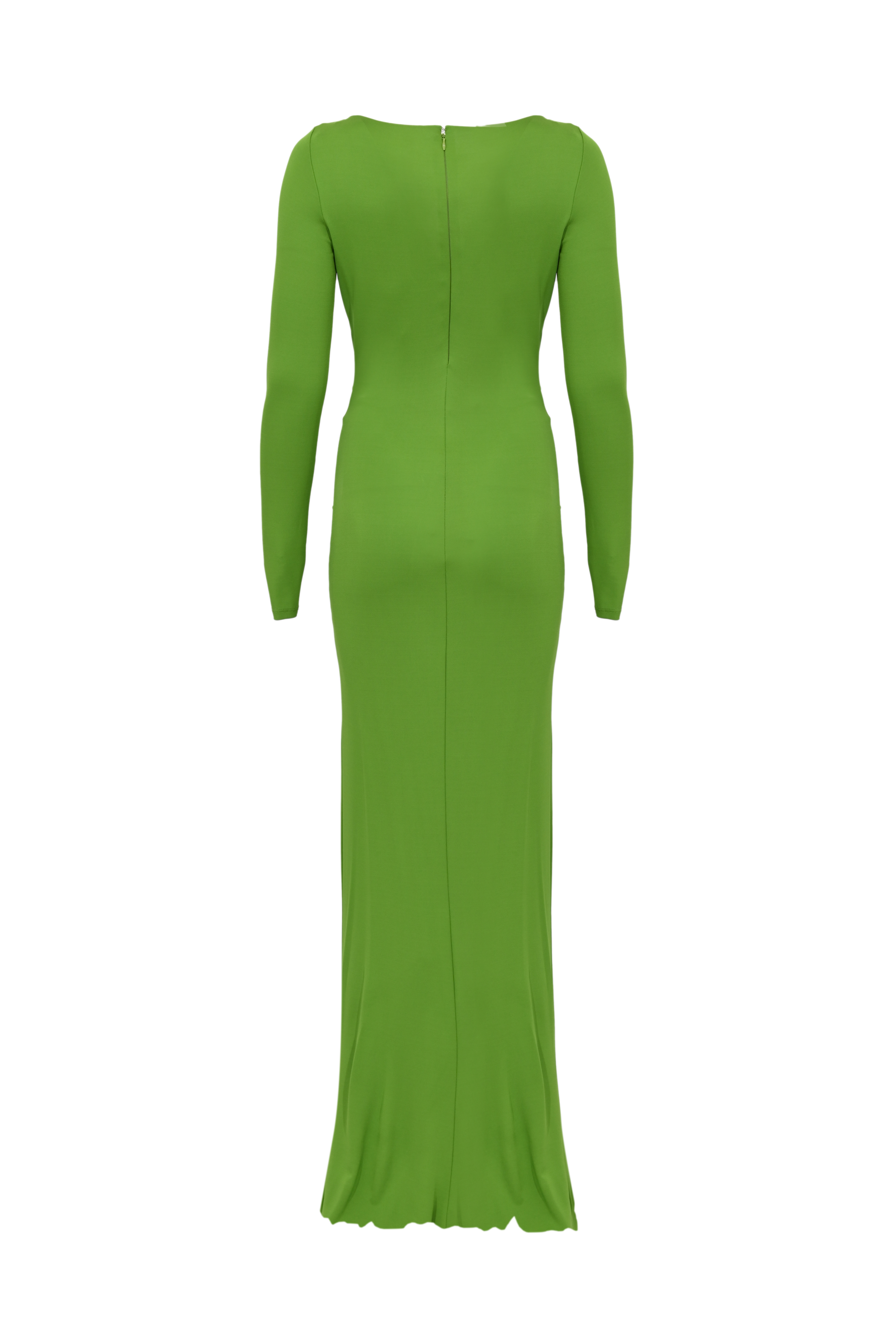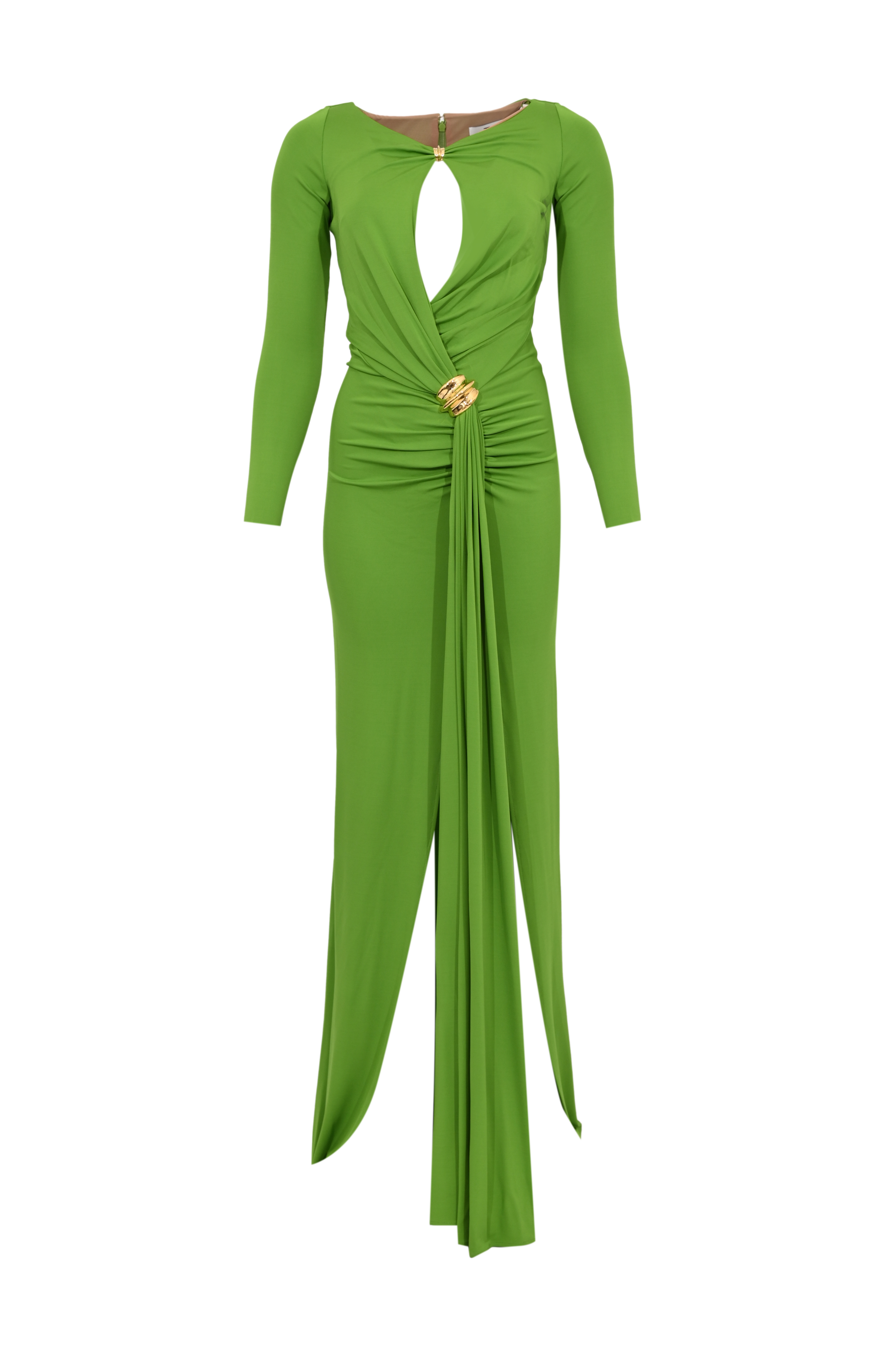 - Dettagli: drappeggio centrale con dettaglio gioiello dorato, apertura frontale, fondo asimmetrico con pannello fluido