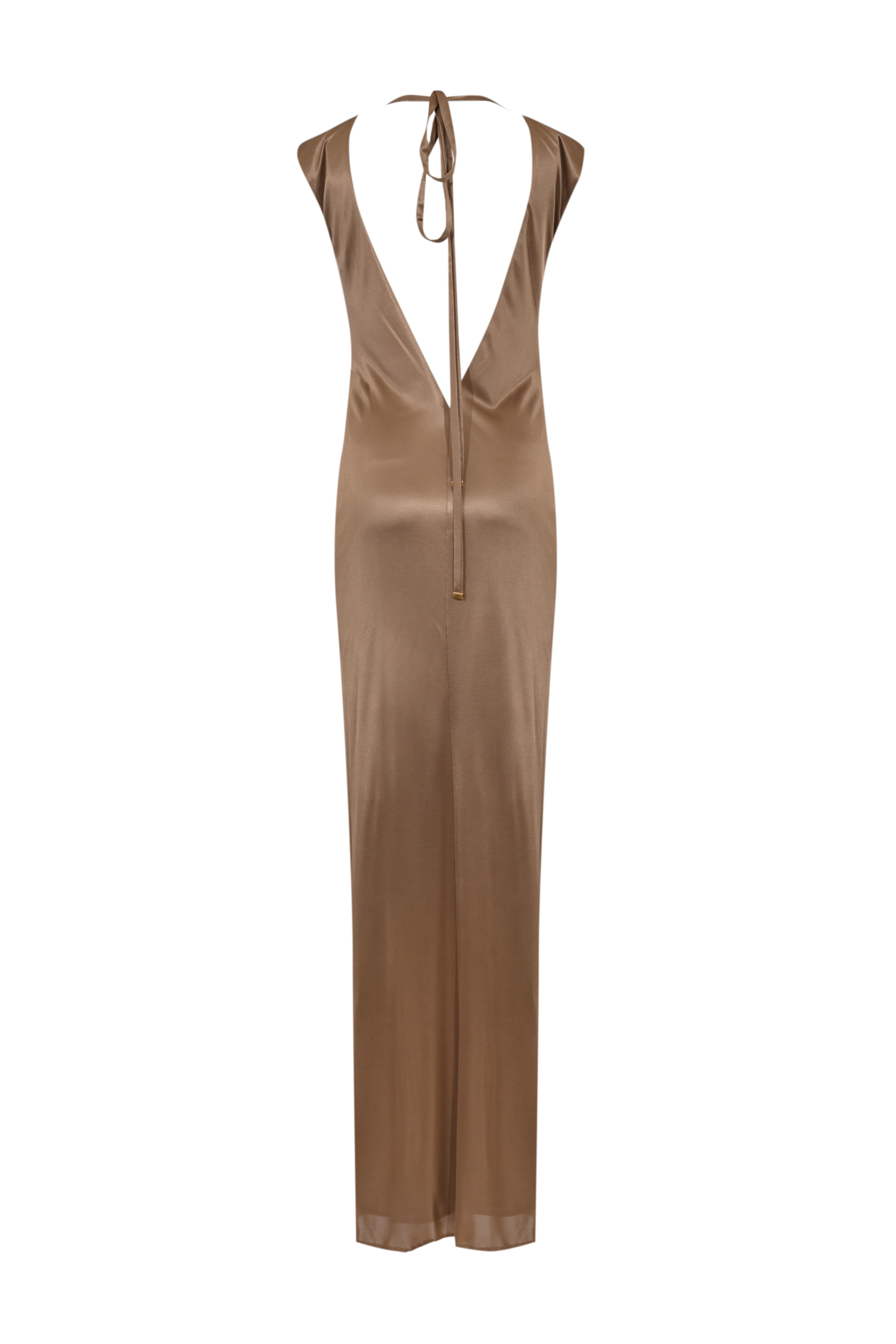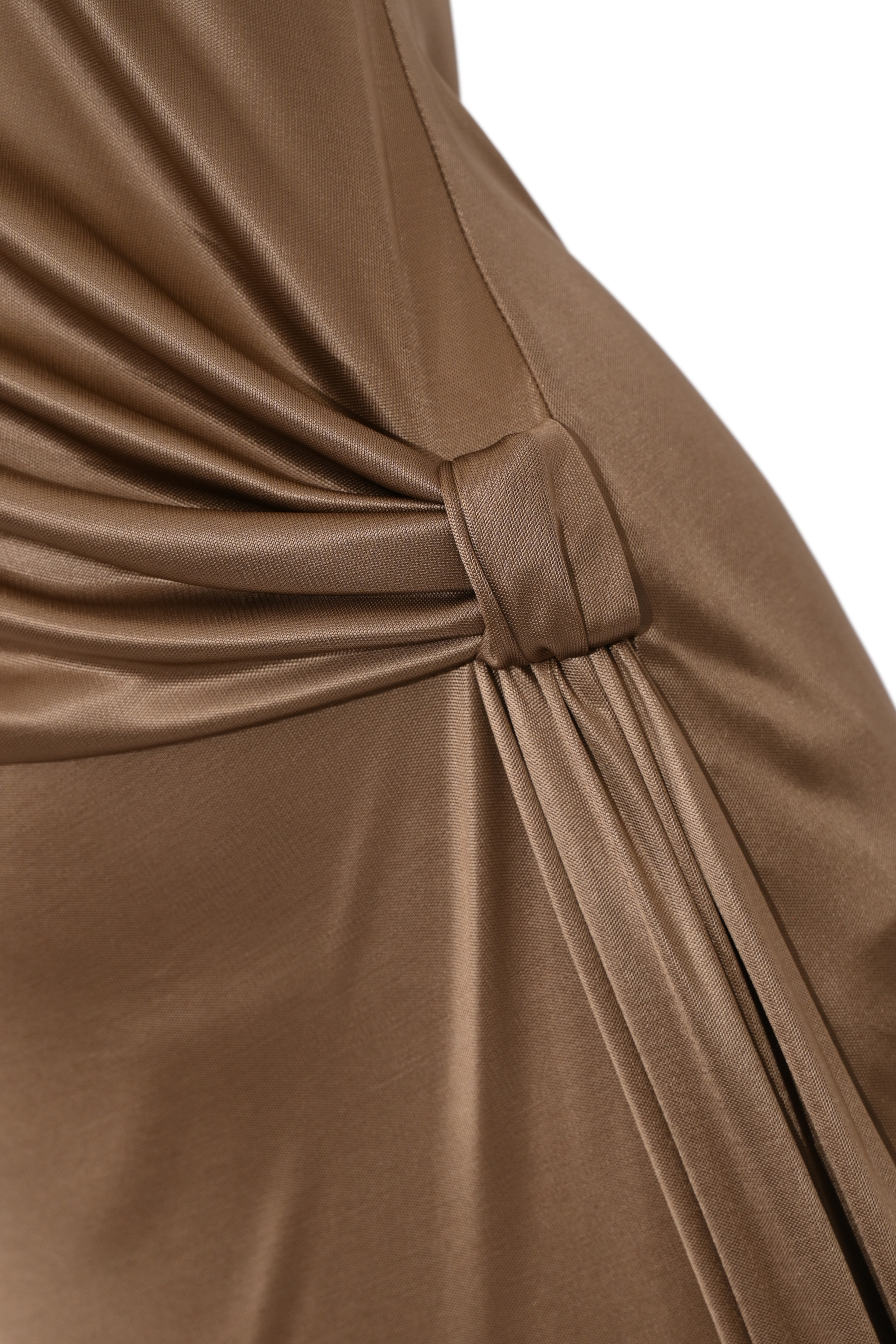 - Dettagli: drappeggio laterale con nodo, dettaglio gioiello sulla spalla, schiena scoperta, linea fluida