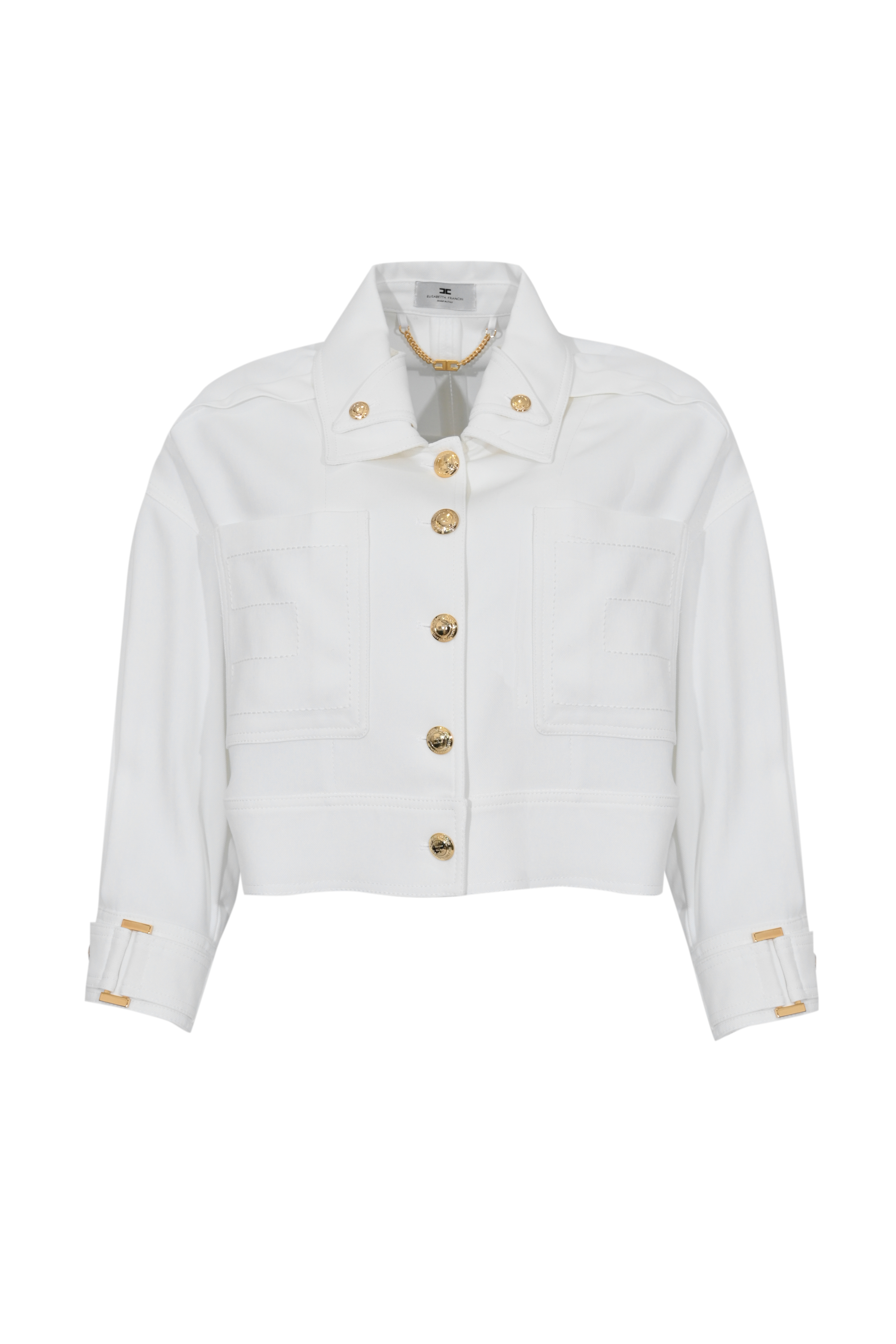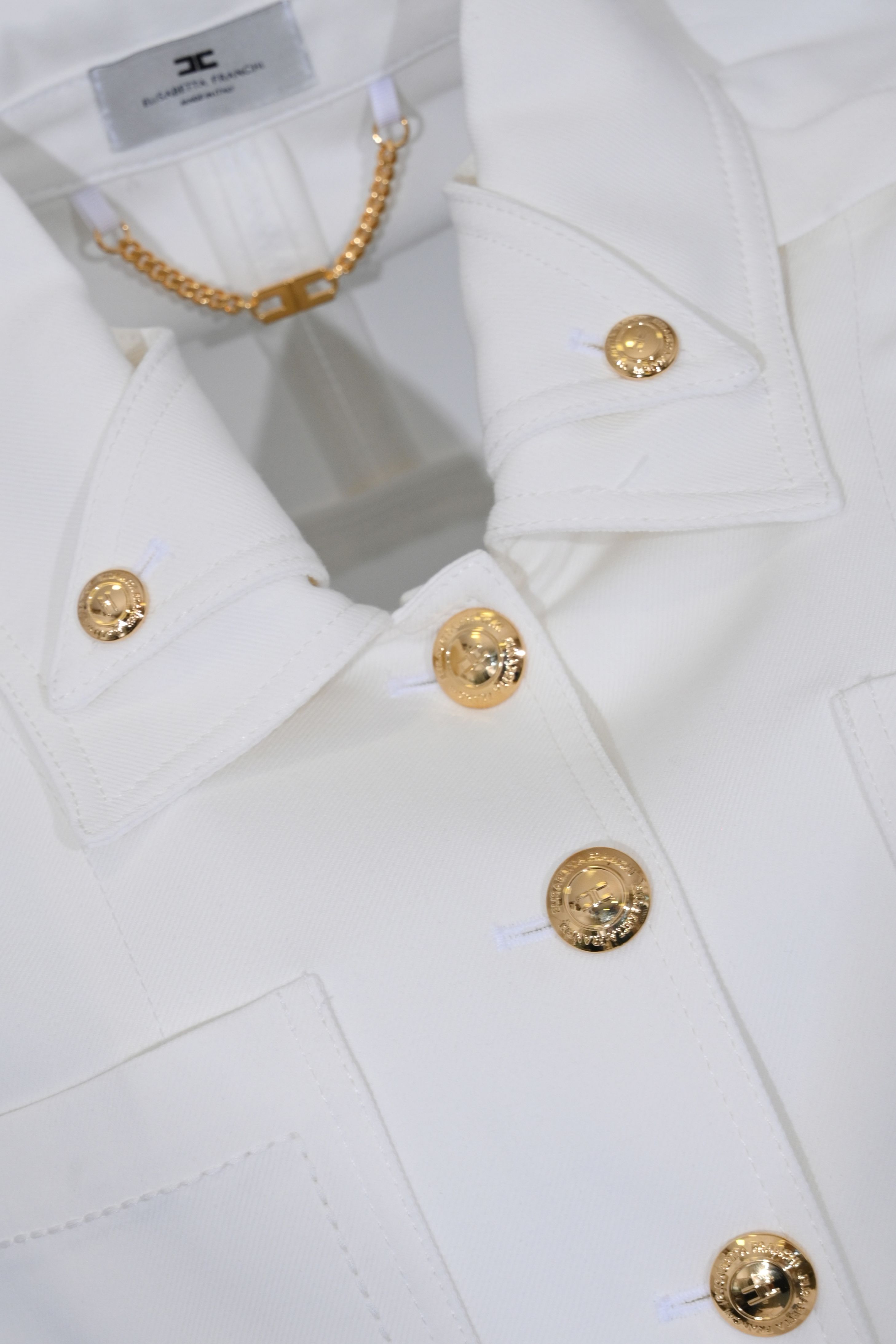 - Dettagli: bottoni gioiello dorati con logo, catena decorativa sul collo, impunture tono su tono