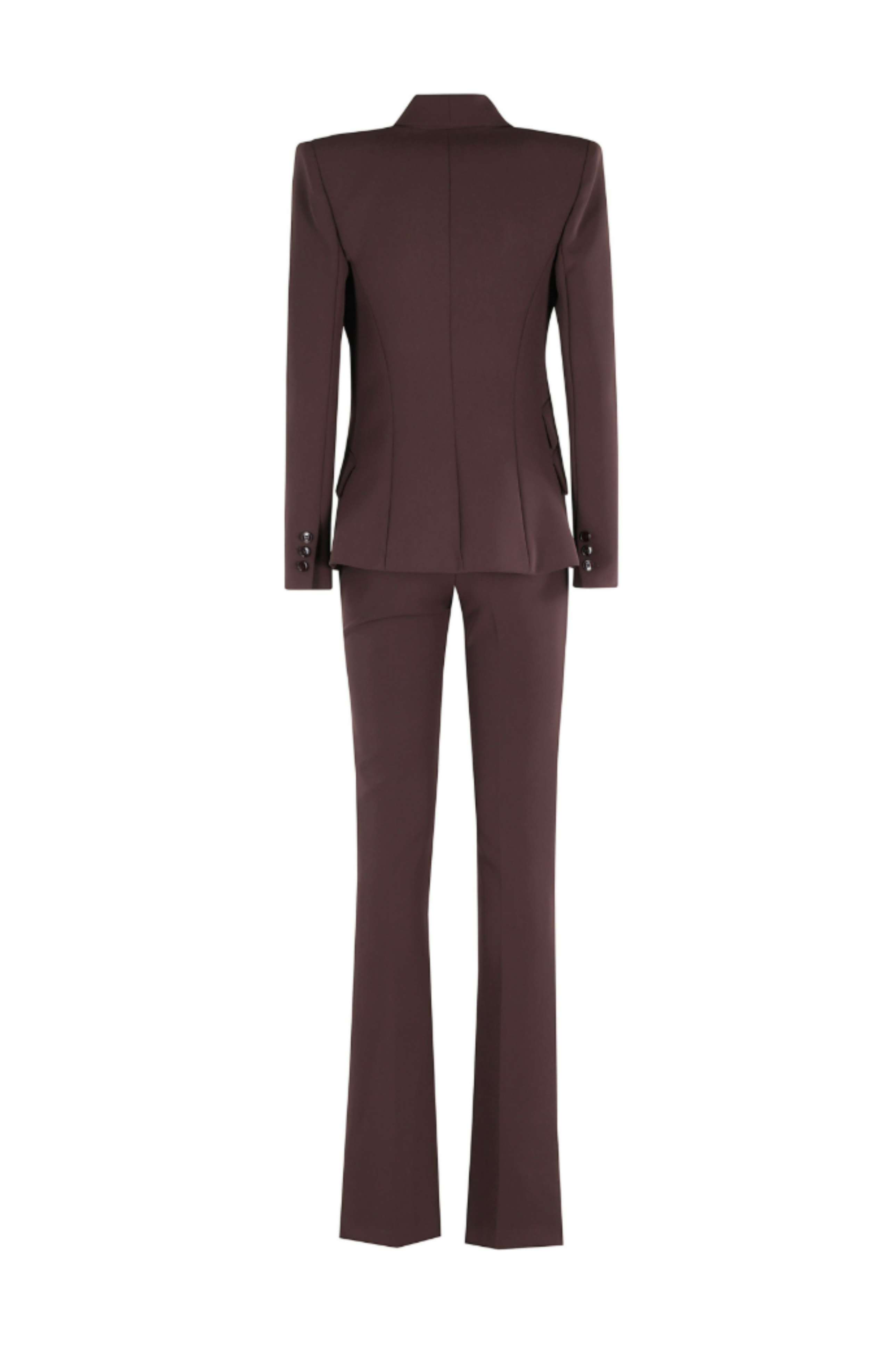- Dettagli: Pantalone a vita alta con piega stirata e fondo leggermente svasato, giacca sagomata con spalle definite