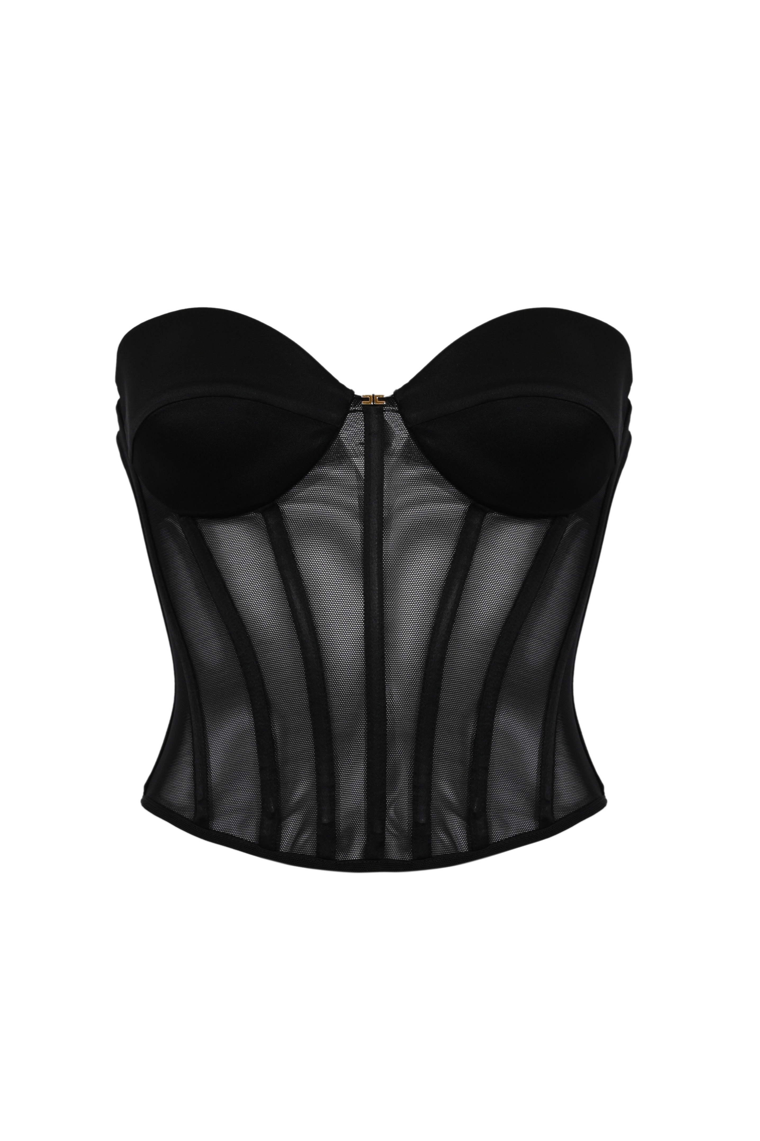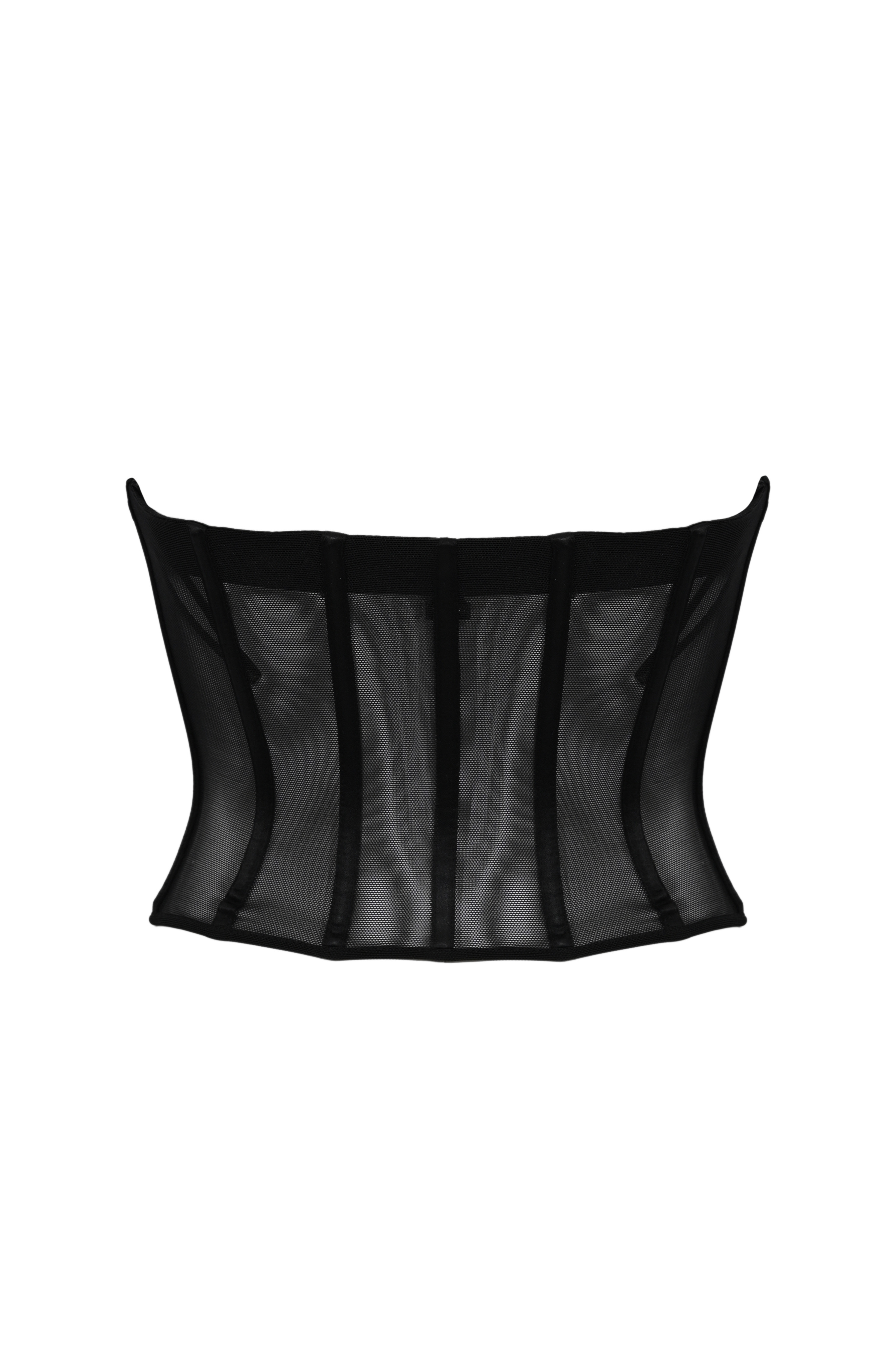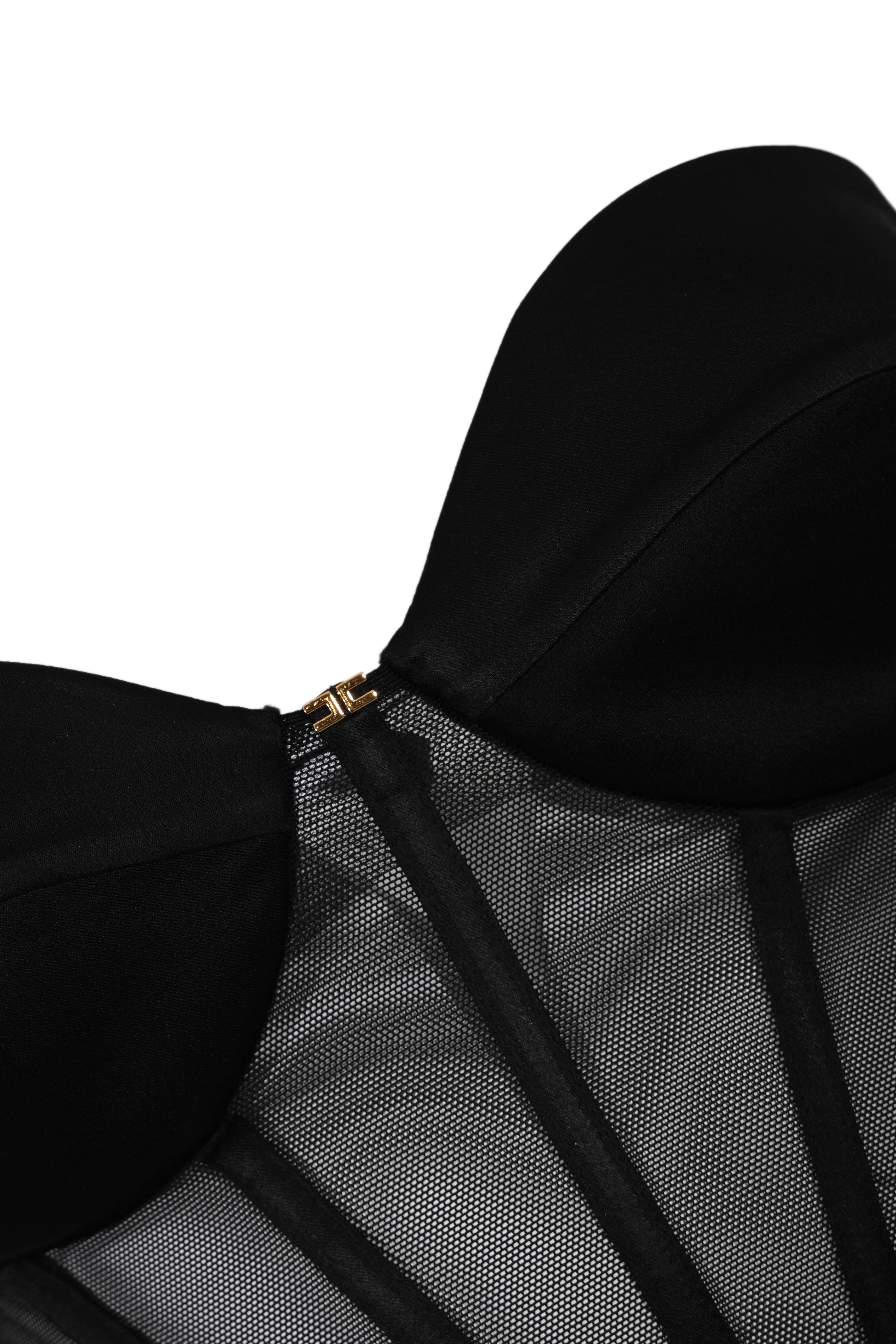 - Dettagli: struttura a bustier con stecche verticali, coppe in satin, inserto centrale in tulle, logo metallico dorato sul davanti
