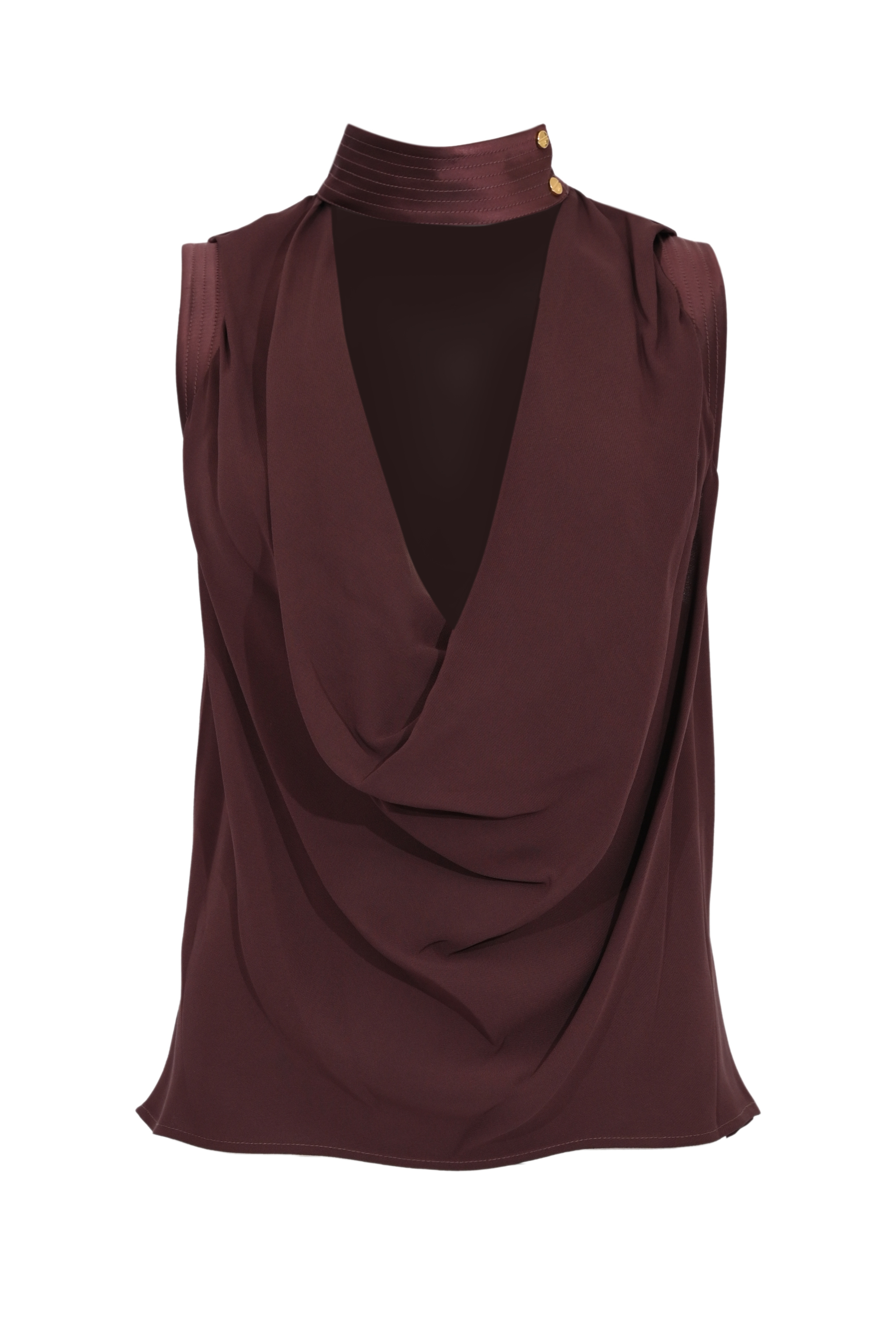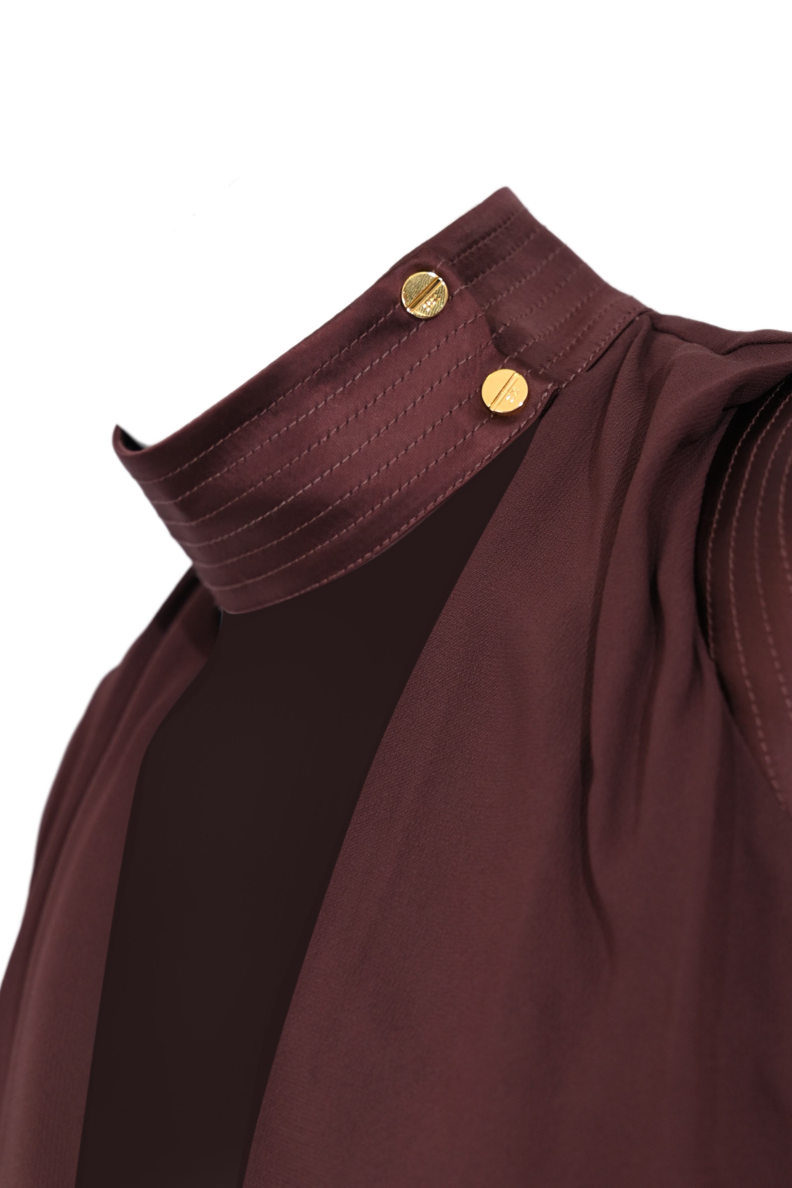 - Dettagli: scollo drappeggiato, colletto strutturato con bottoni gioiello