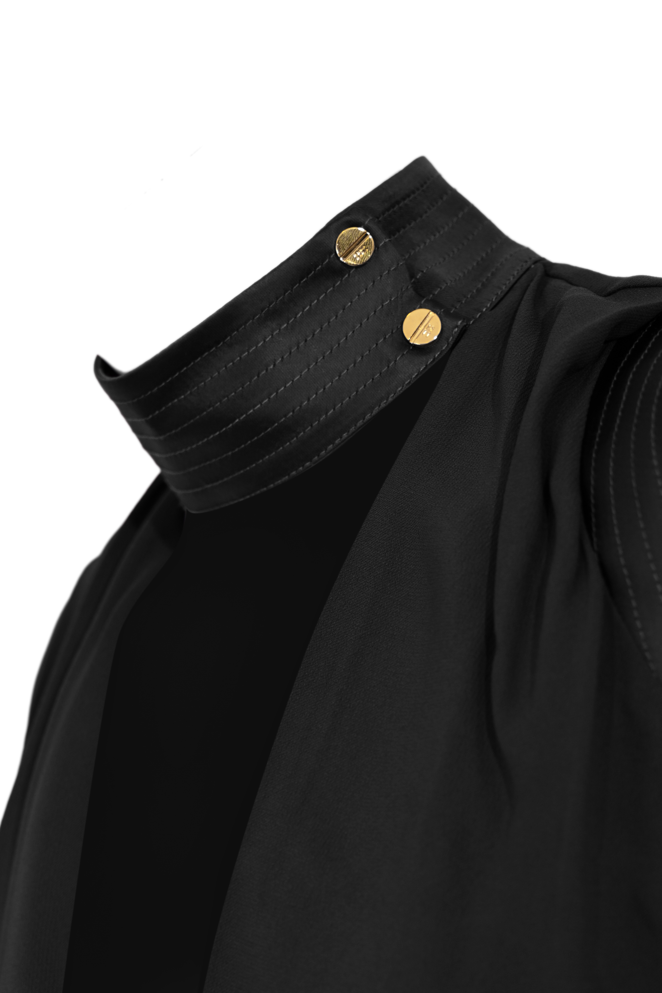 - Dettagli: scollo drappeggiato, colletto strutturato con bottoni gioiello