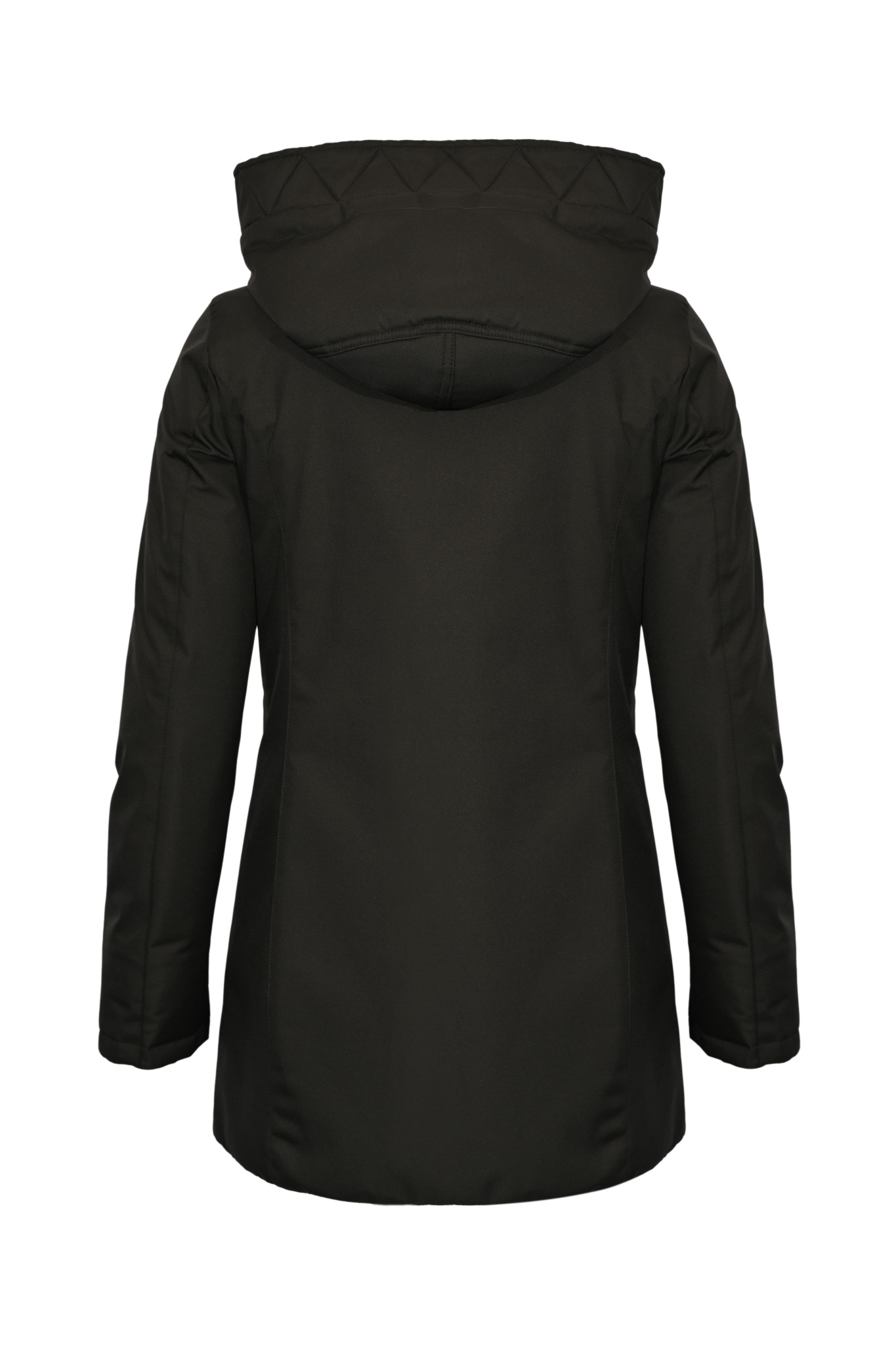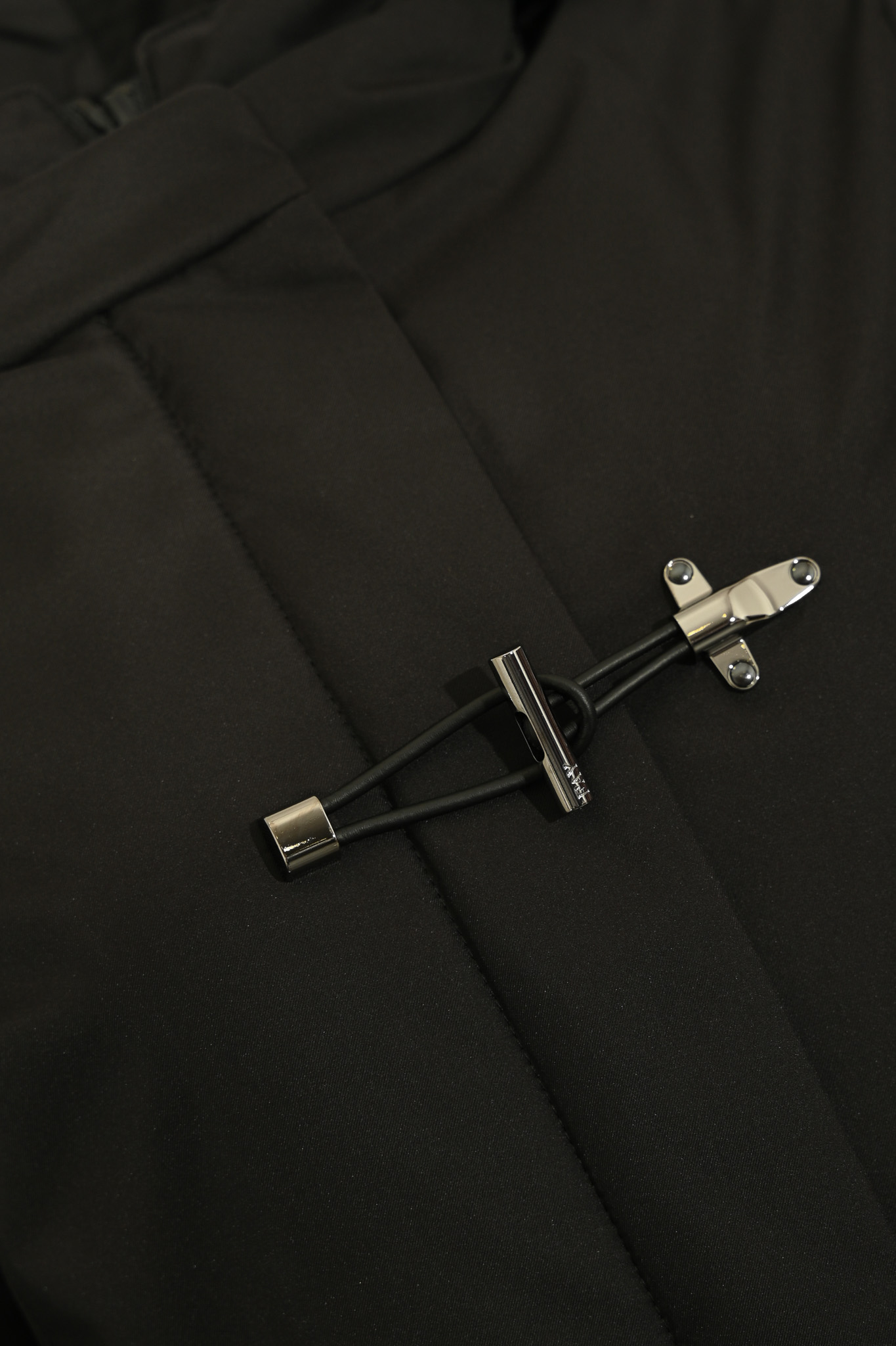 - Dettagli: cappuccio con impunture geometriche, chiusura con gancio a barra iconico, cuciture sagomate, taglio leggermente svasato, stile urbano e raffinato