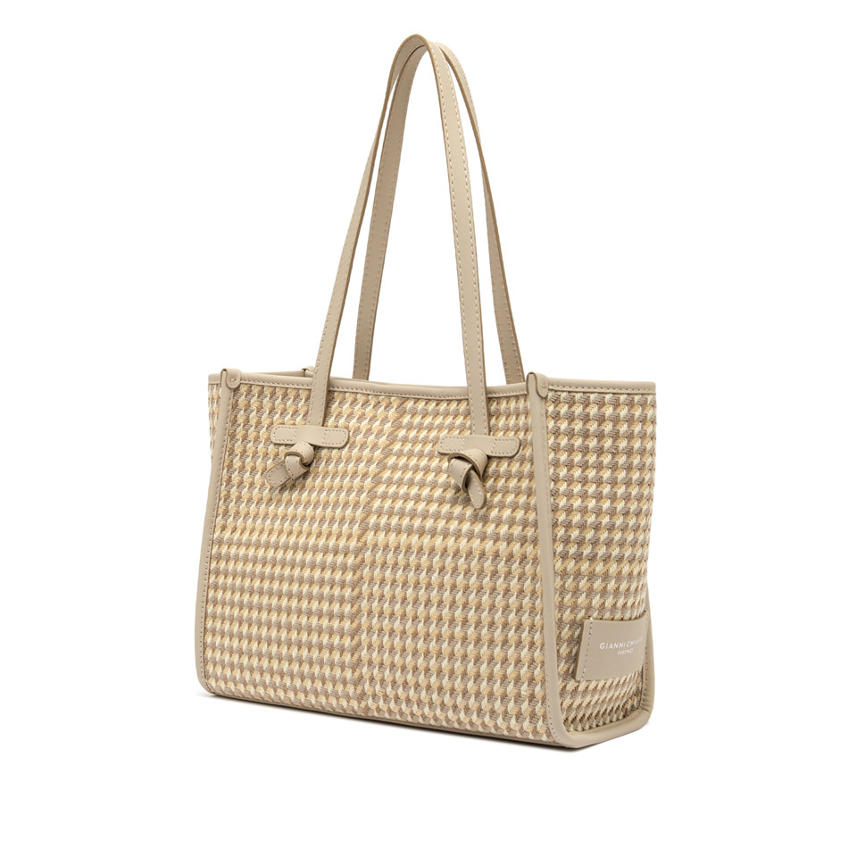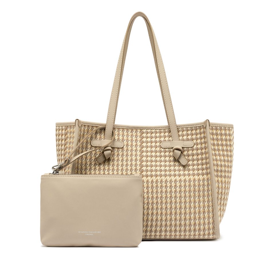 - Dettagli: trama pied de poule, profili e manici in pelle, logo Gianni Chiarini Firenze, pochette coordinata