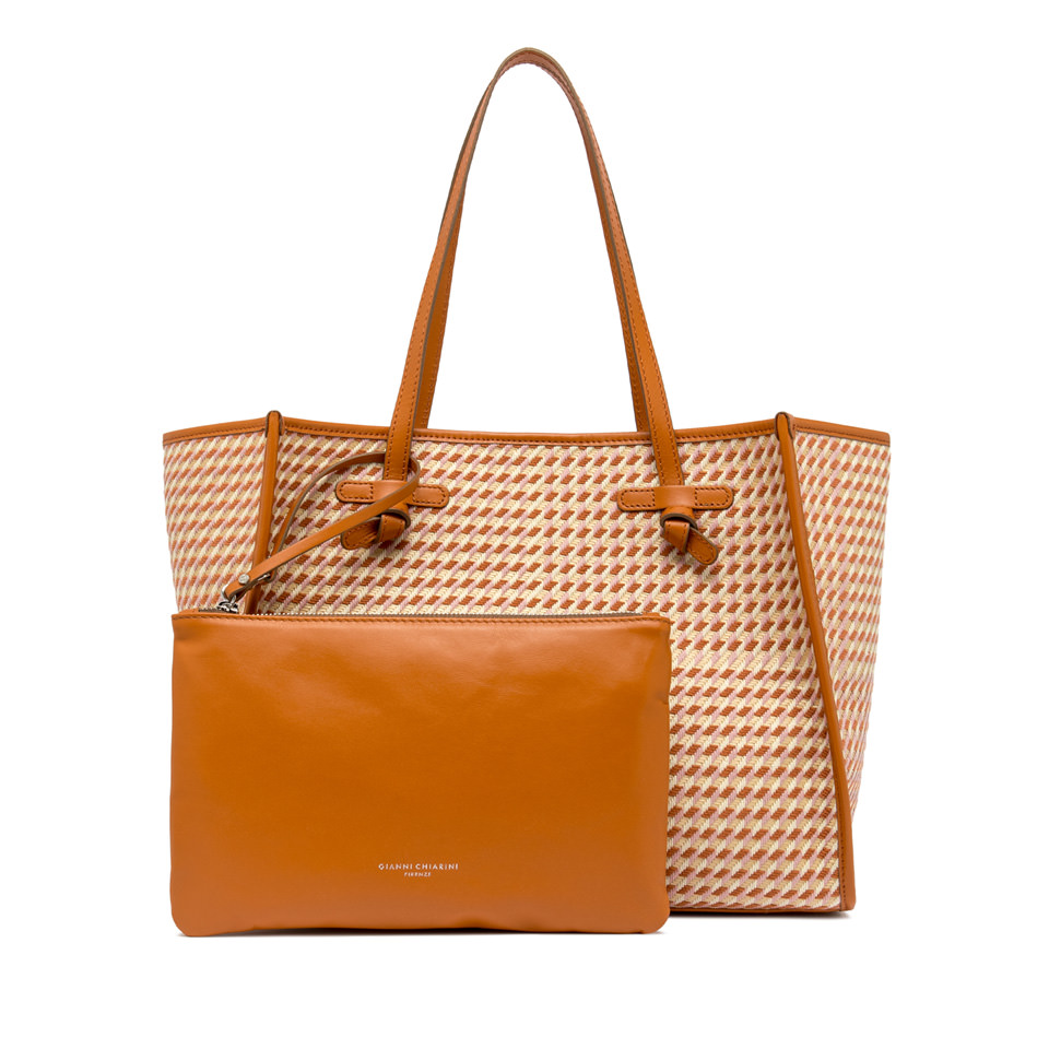 - Dettagli: trama pied de poule, profili e manici in pelle, logo laterale Gianni Chiarini Firenze, pochette coordinata