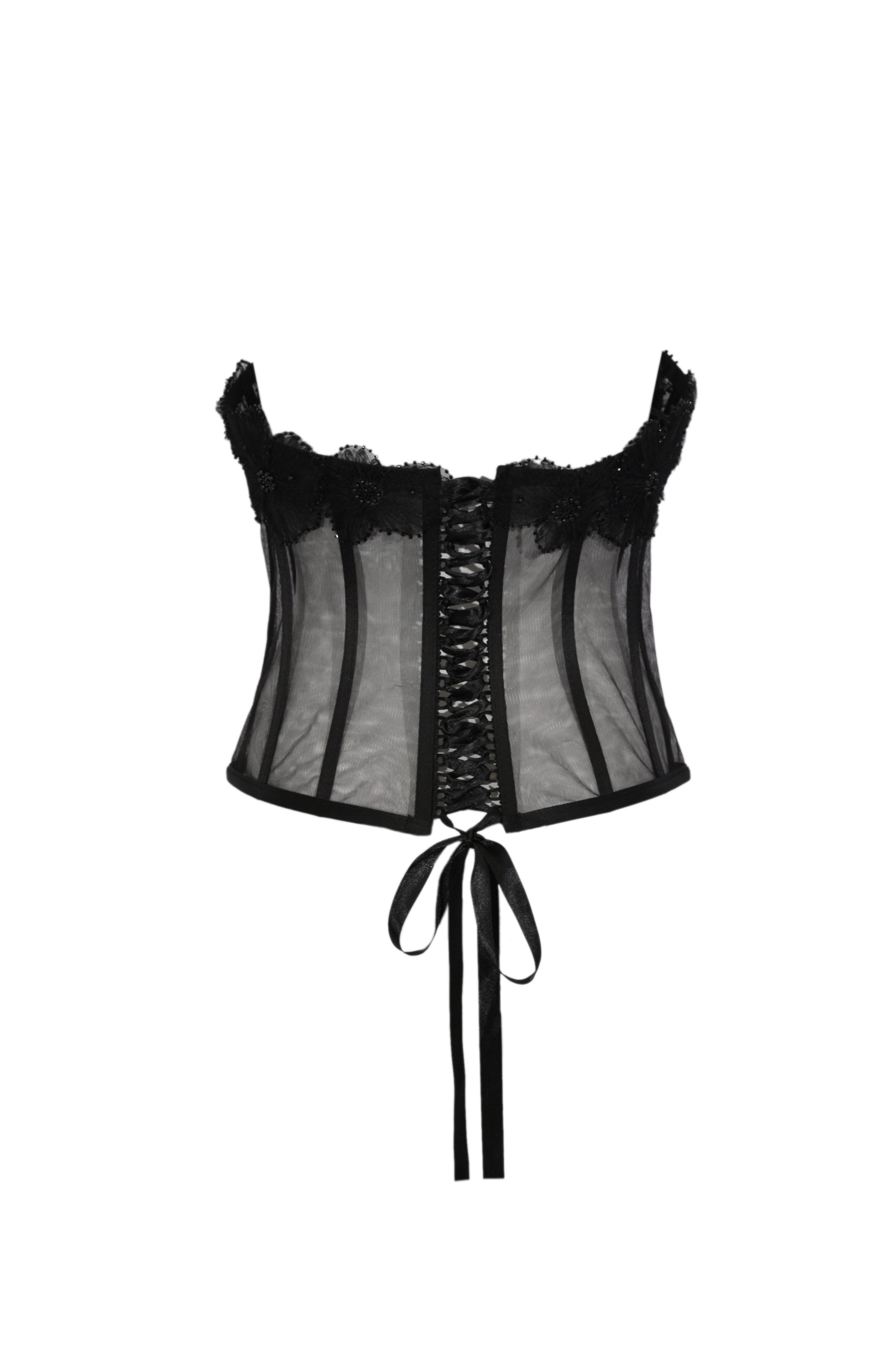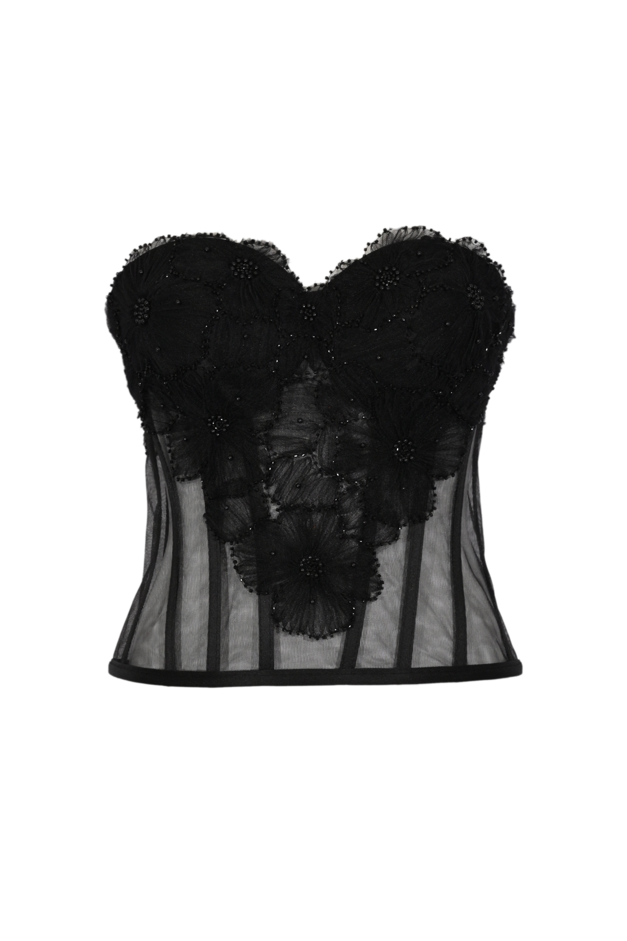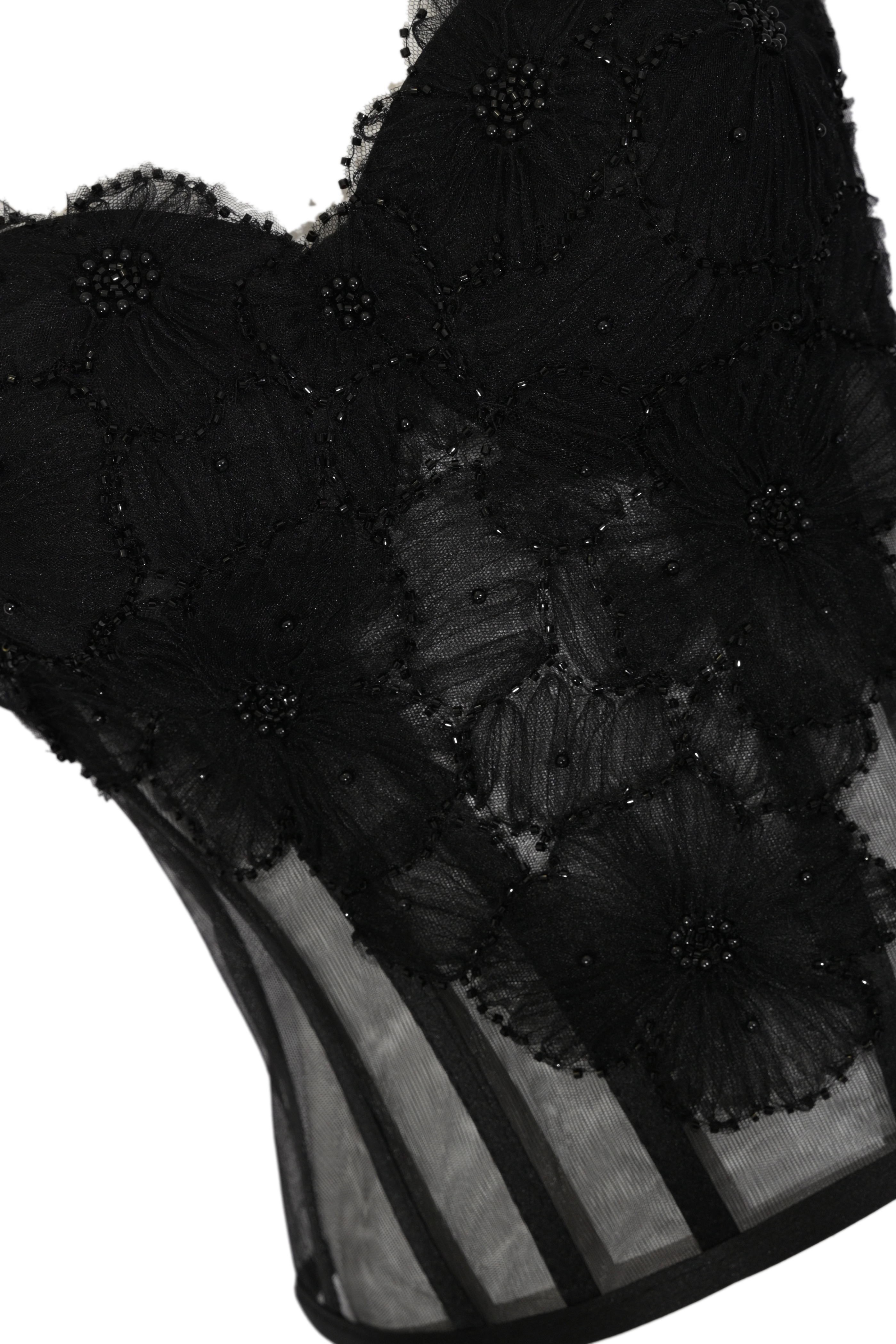 - Dettagli: struttura steccata, lavorazione trasparente, ricami floreali in rilievo con perline, profili rifiniti, design corsetto elegante