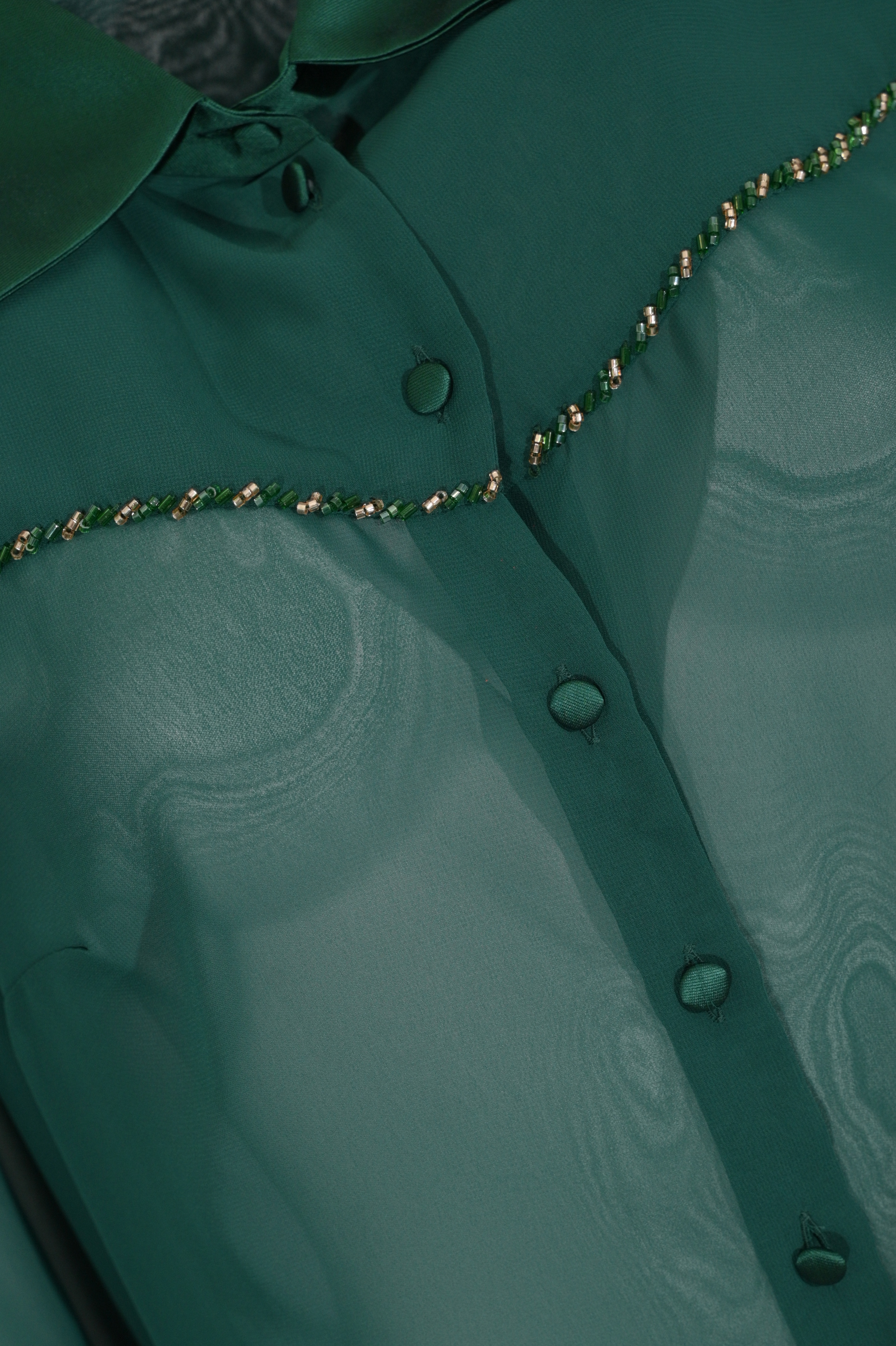 - Dettagli: inserto ricamato con micro perline e dettagli gioiello lungo carré frontale e posteriore, effetto trasparente elegante, linea fluida e morbida, finiture sartoriali curate, tessuto impalpabile che dona movimento, ideale sia per look eleganti che abbinamenti più contemporanei