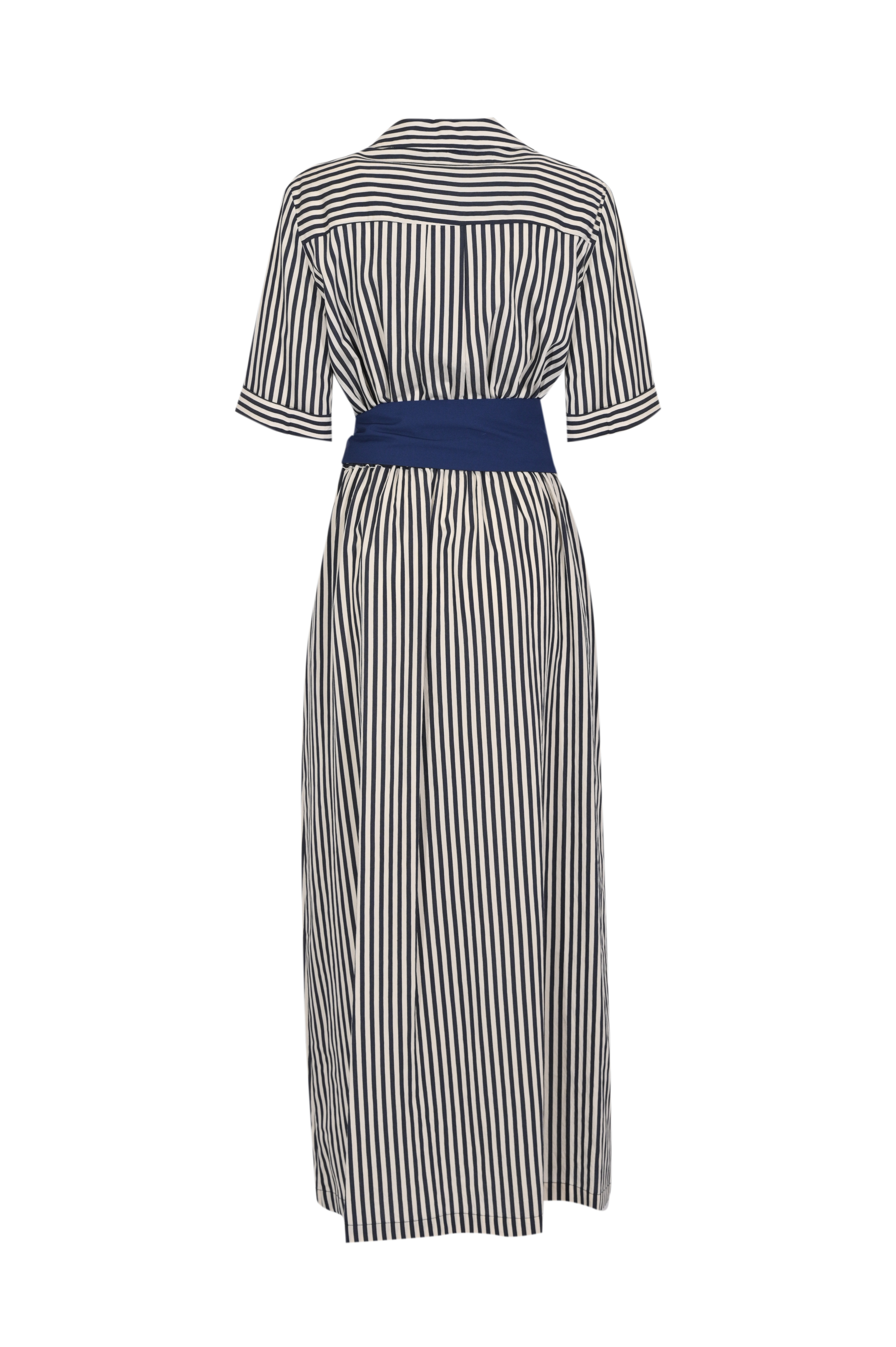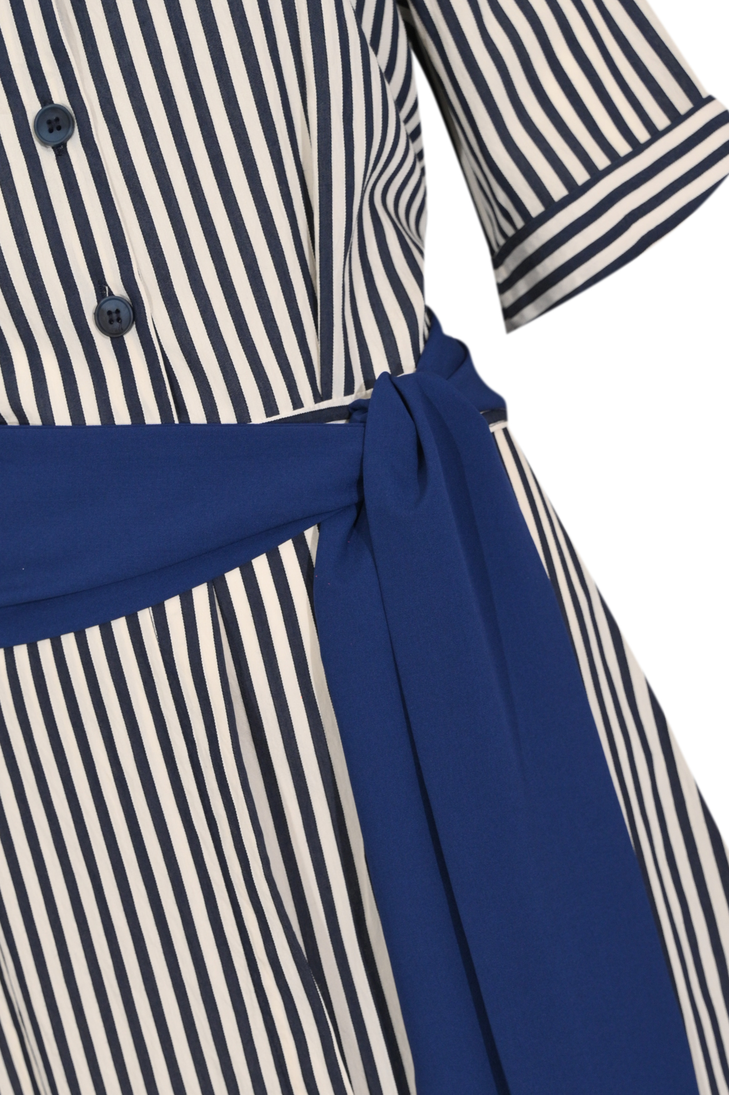 - Dettagli: fusciacca in vita in colore a contrasto annodabile lateralmente che valorizza la silhouette, linea chemisier elegante e versatile, gonna midi leggermente svasata con movimento fluido, stampa a righe che slancia la figura, carrè posteriore con gioco di righe orizzontali per un tocco distintivo