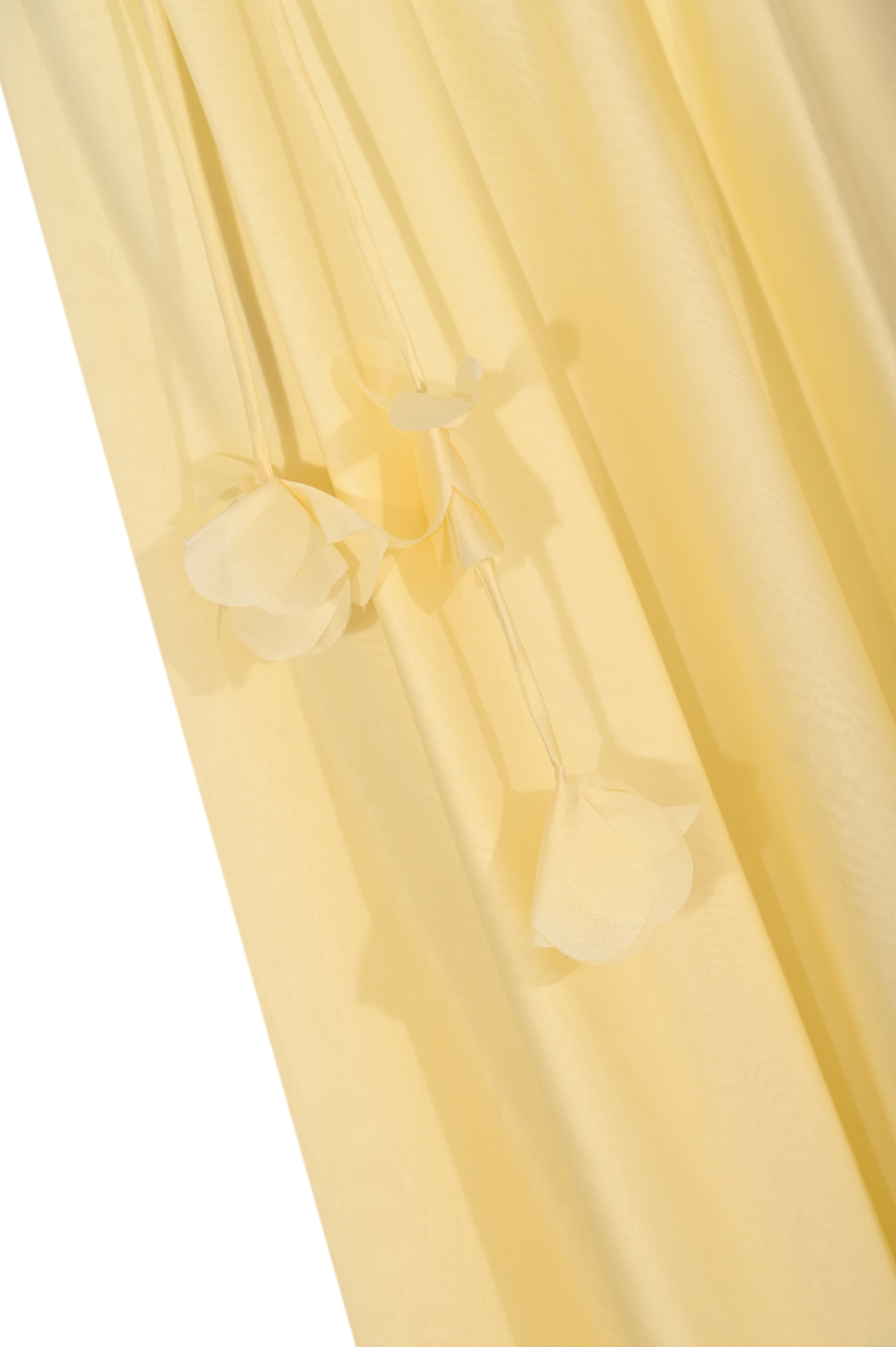 - Dettagli: linea fluida e leggera, applicazioni floreali pendenti sul fianco, effetto trasparenza