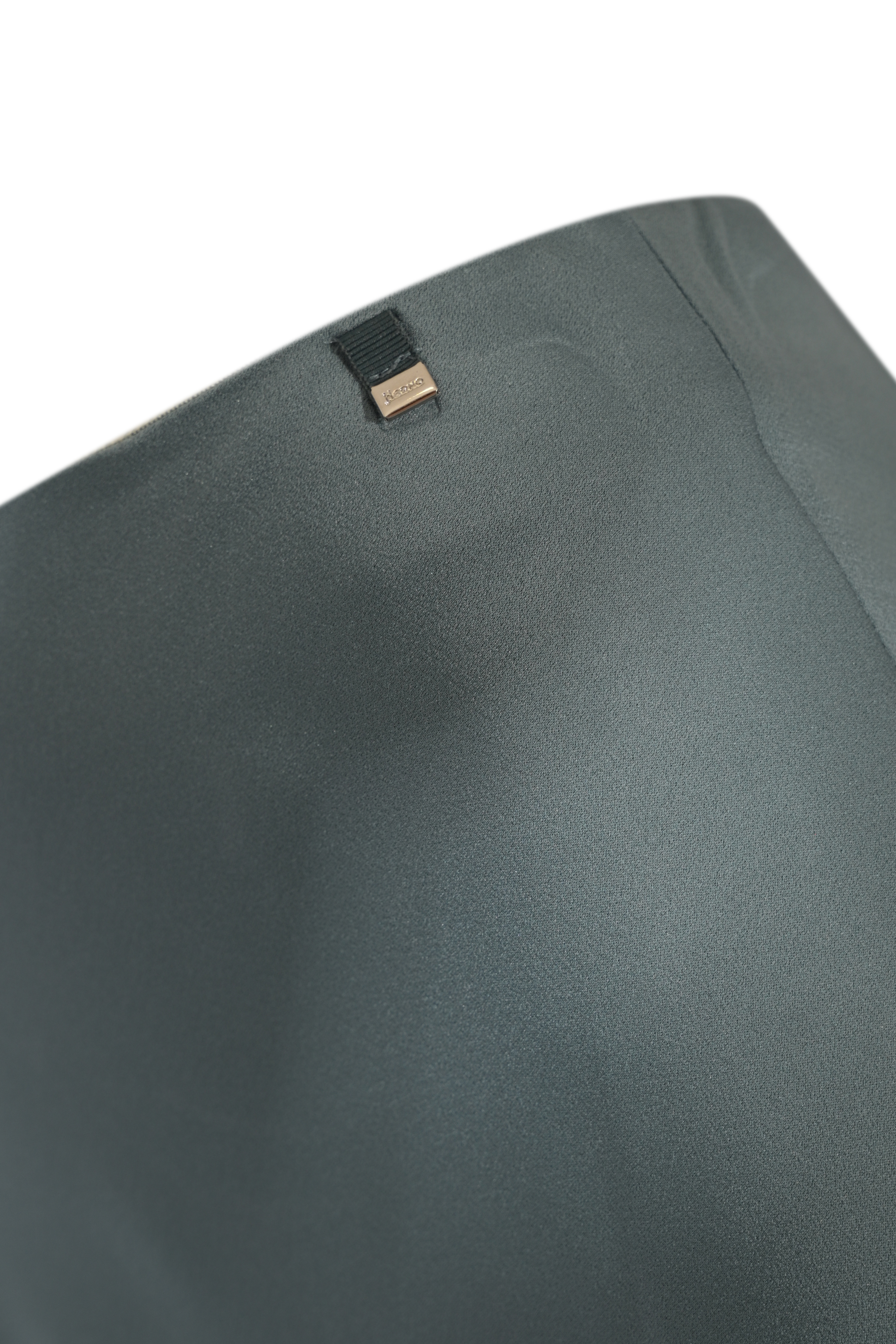 - Dettagli: taglio svasato con drappeggio naturale, caduta fluida, piccolo logo metallico applicato in vita