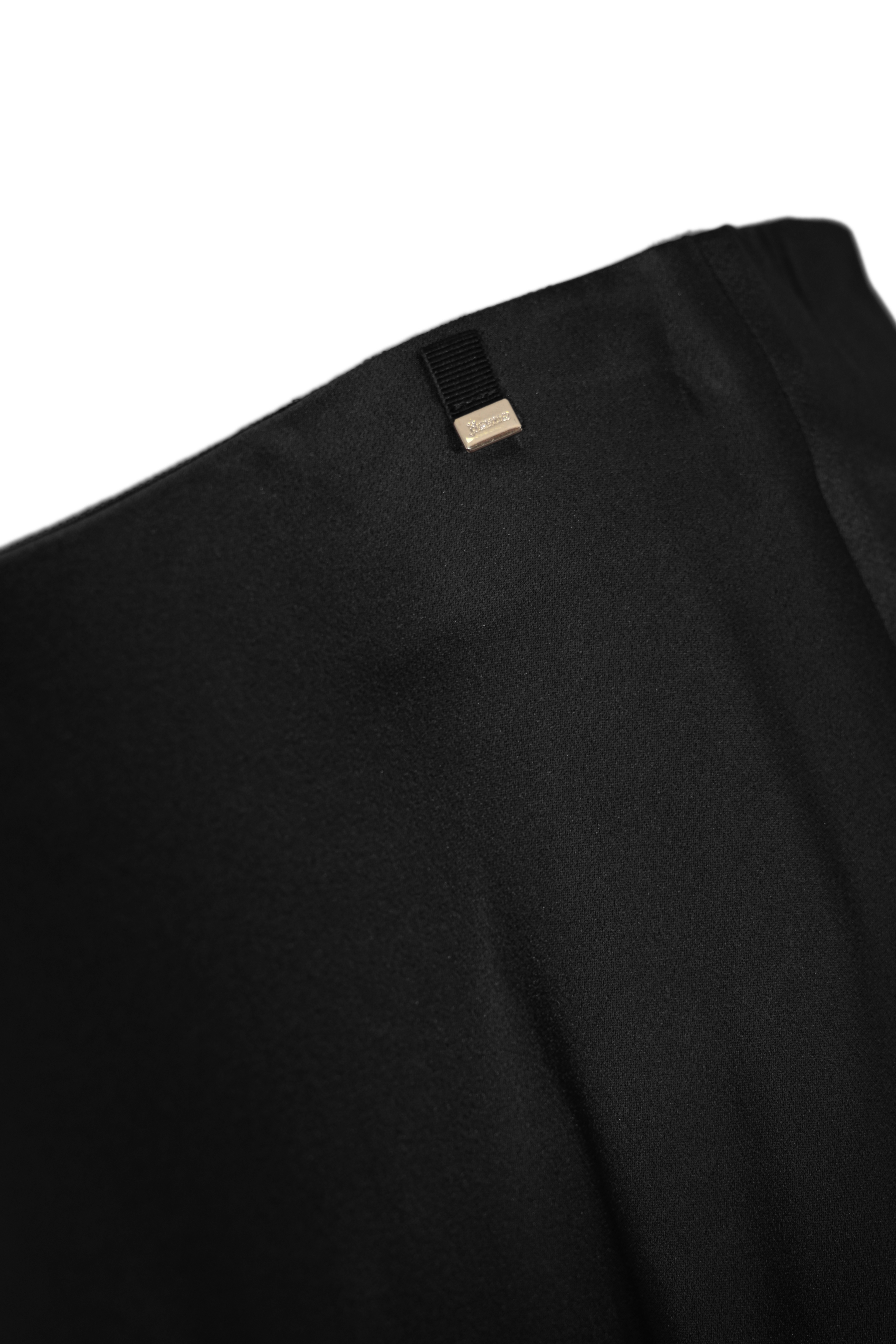 - Dettagli: taglio svasato con drappeggio naturale, caduta fluida, piccolo logo metallico applicato in vita
