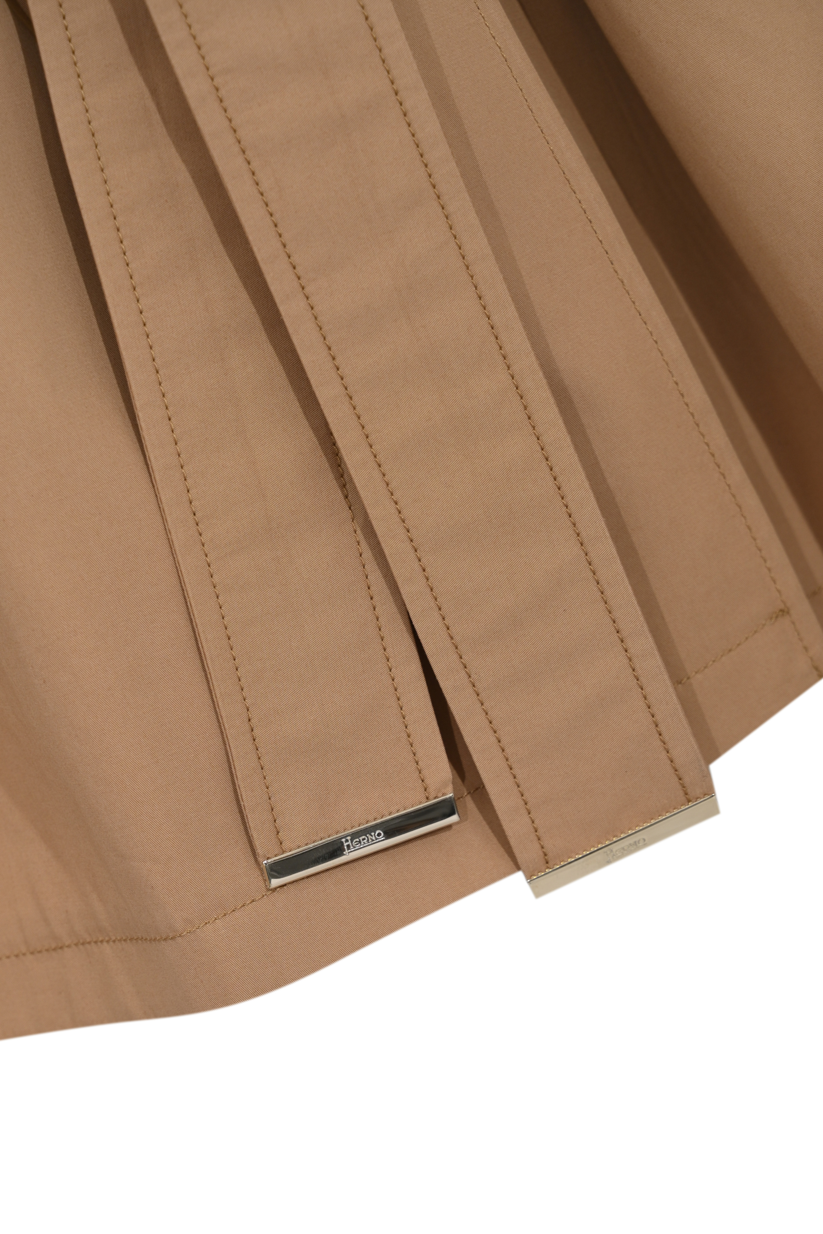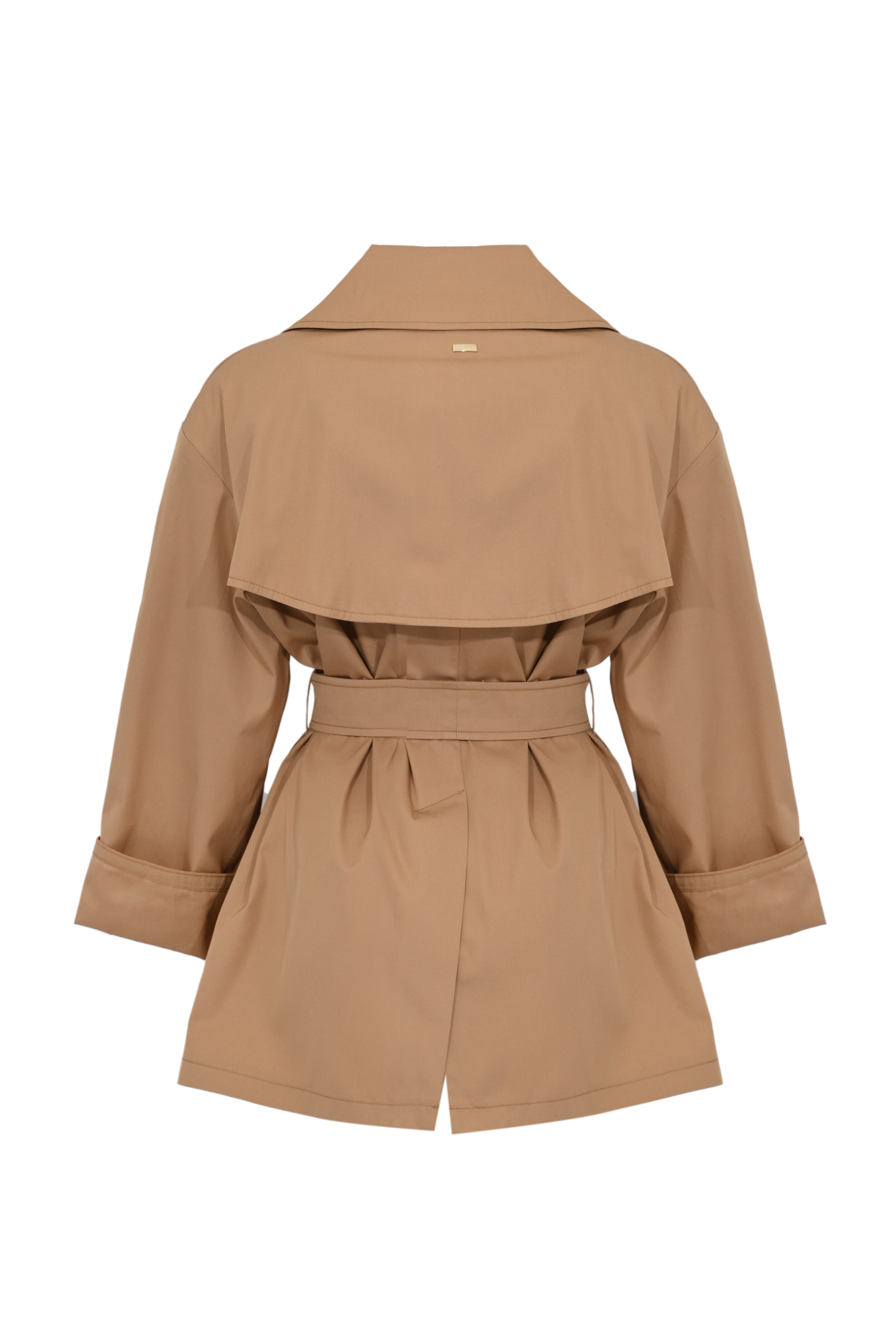 - Dettagli: cintura coordinata con terminali metallici logati, mantellina sul retro, pieghe posteriori