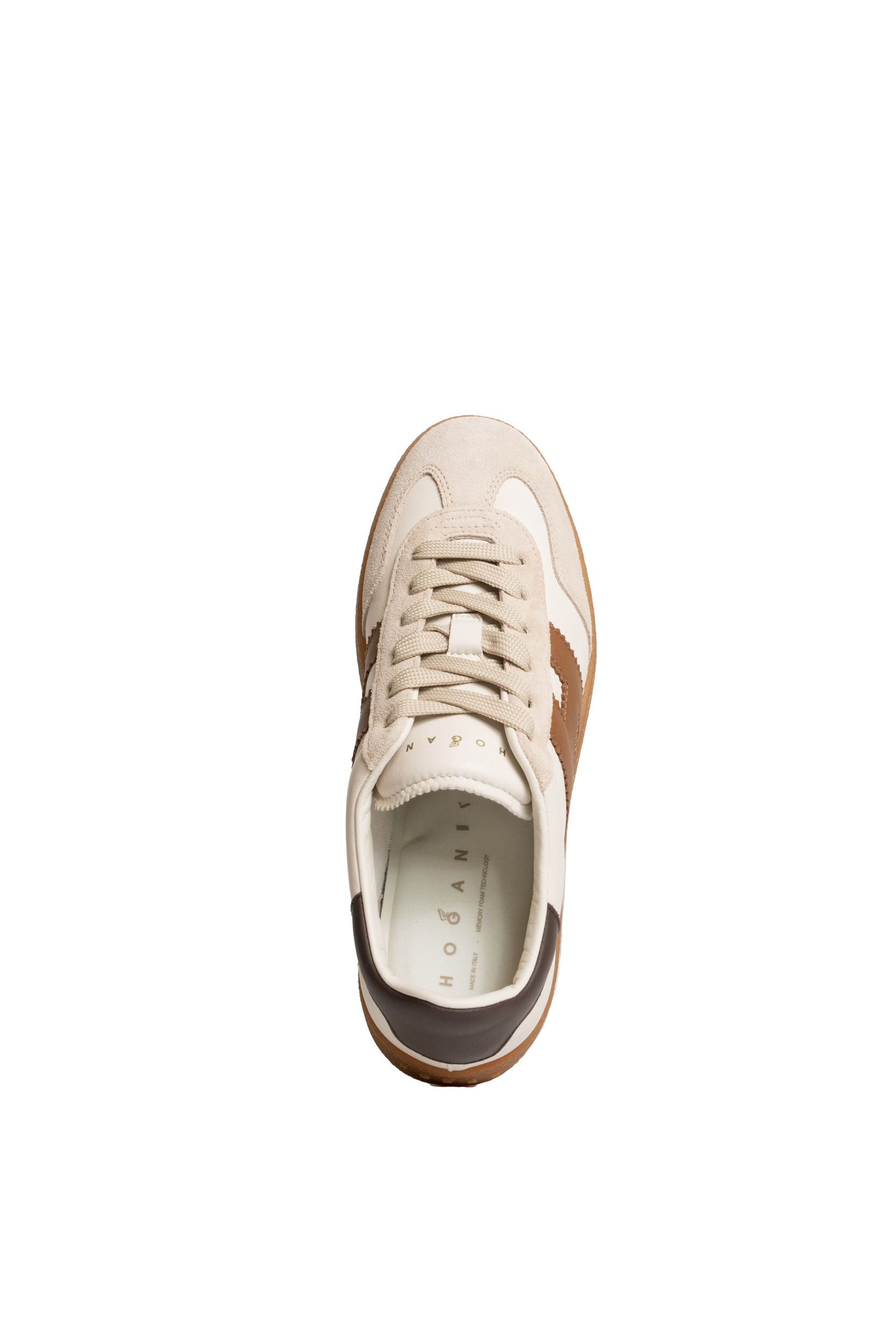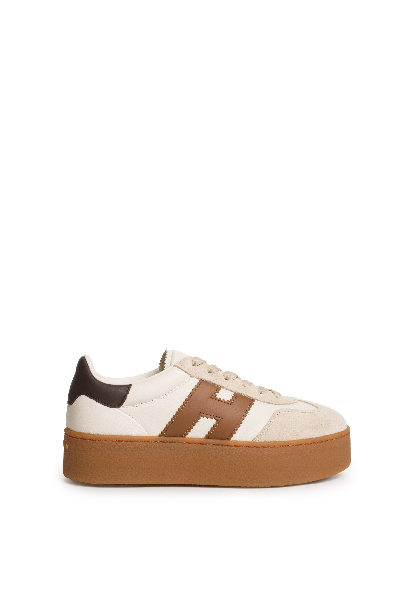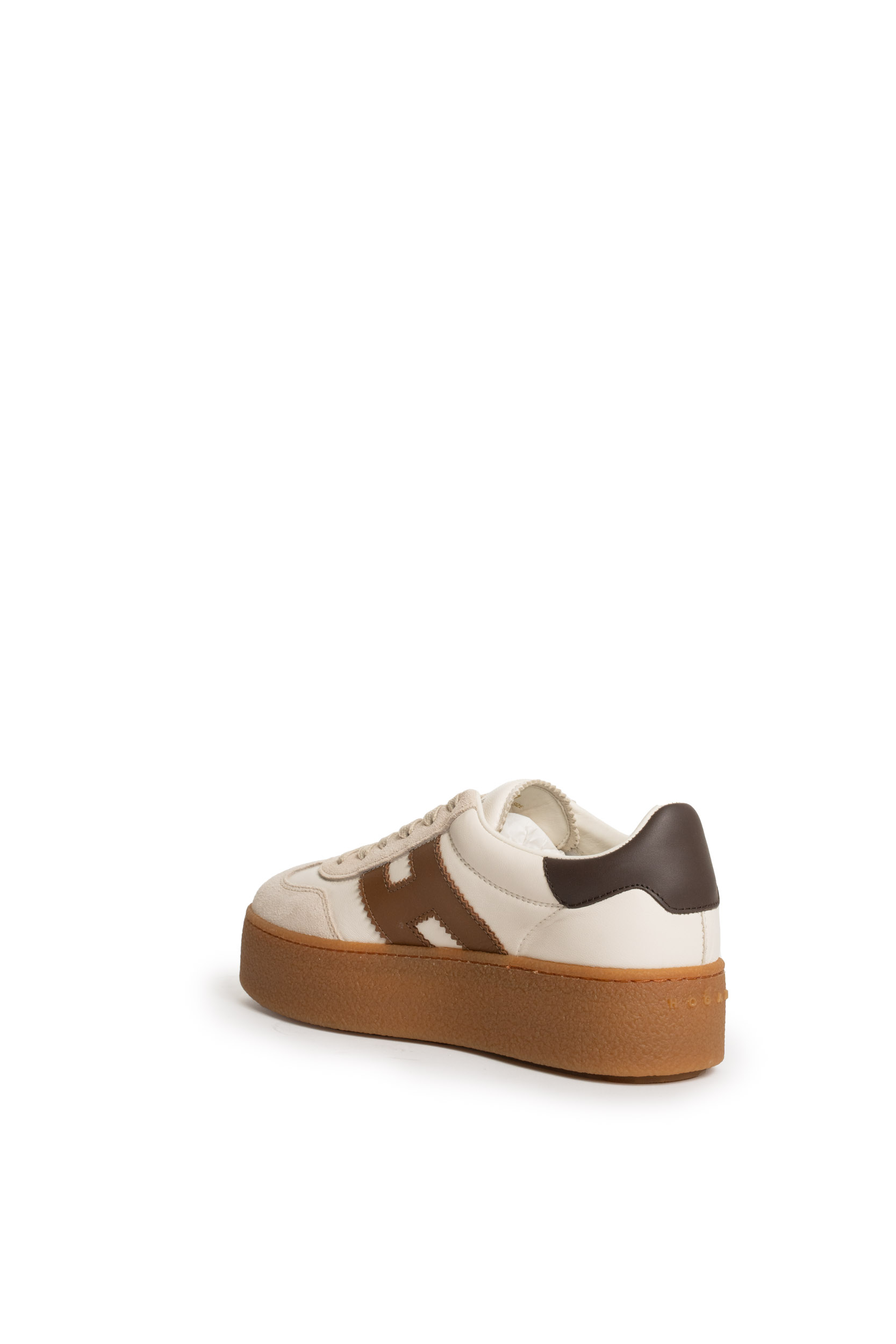 - Tomaia: In pelle liscia color avorio con inserti in suede tono chiaro e iconica H laterale in pelle marrone. Dettaglio posteriore in pelle marrone scuro e profili rifiniti con cuciture a vista.