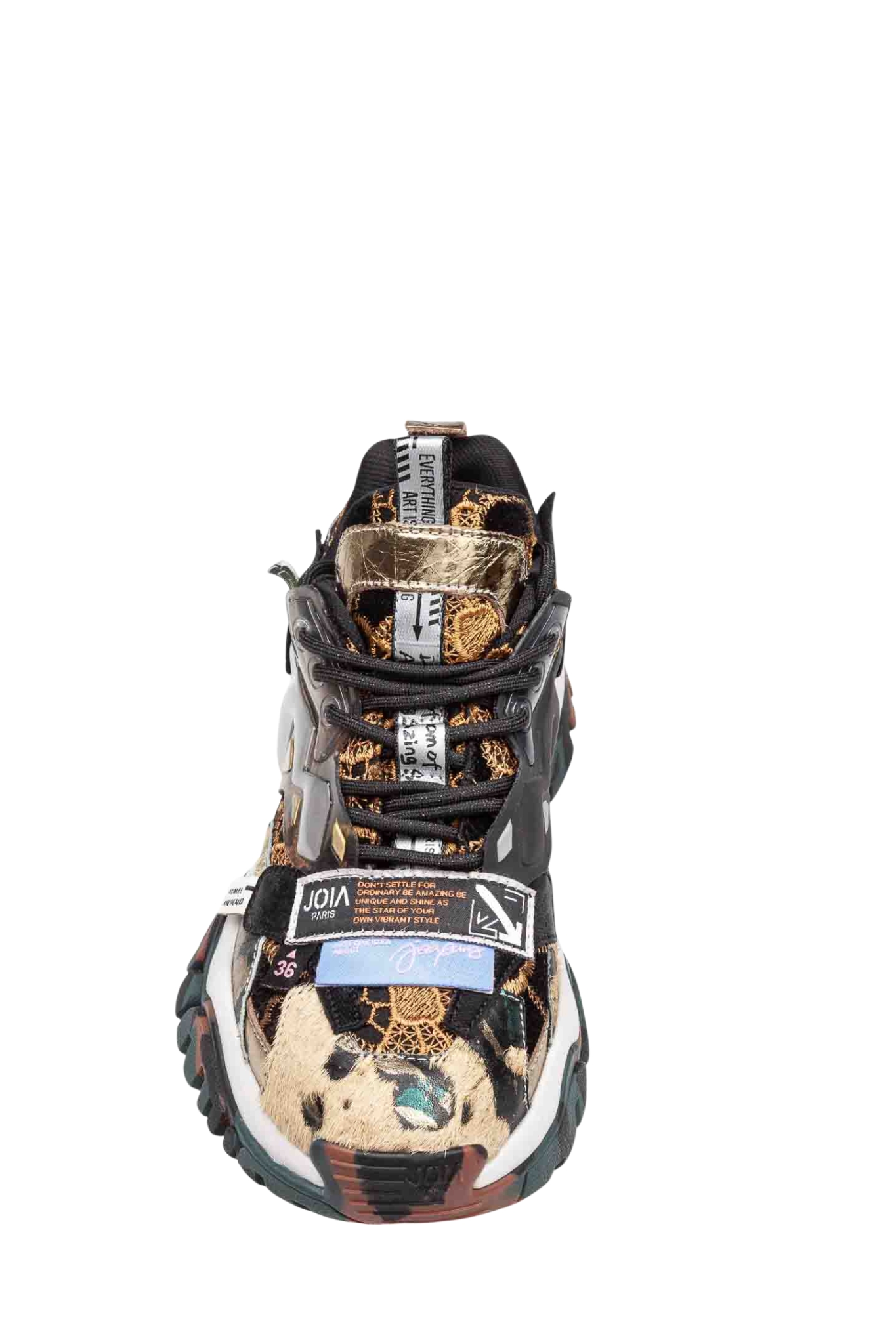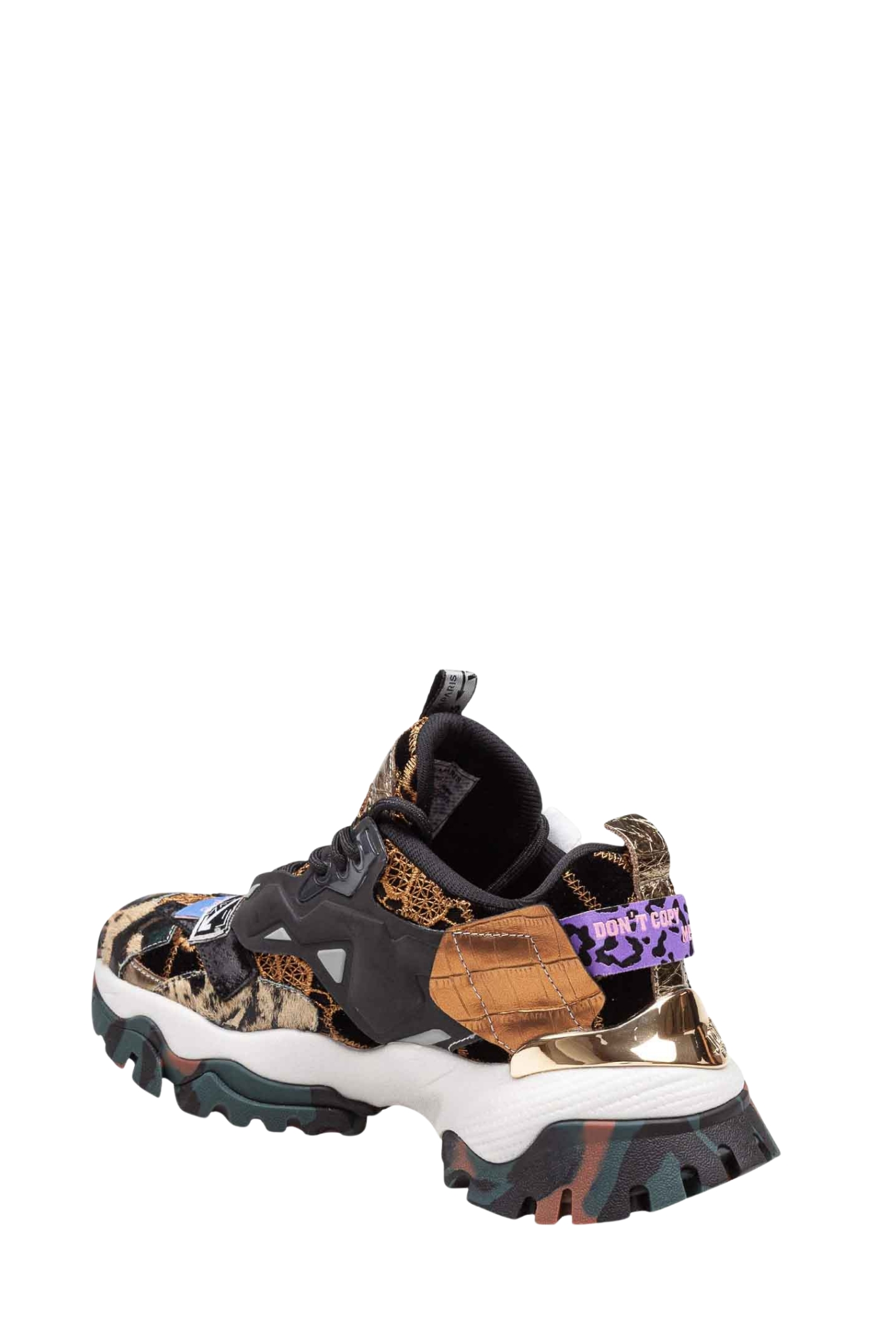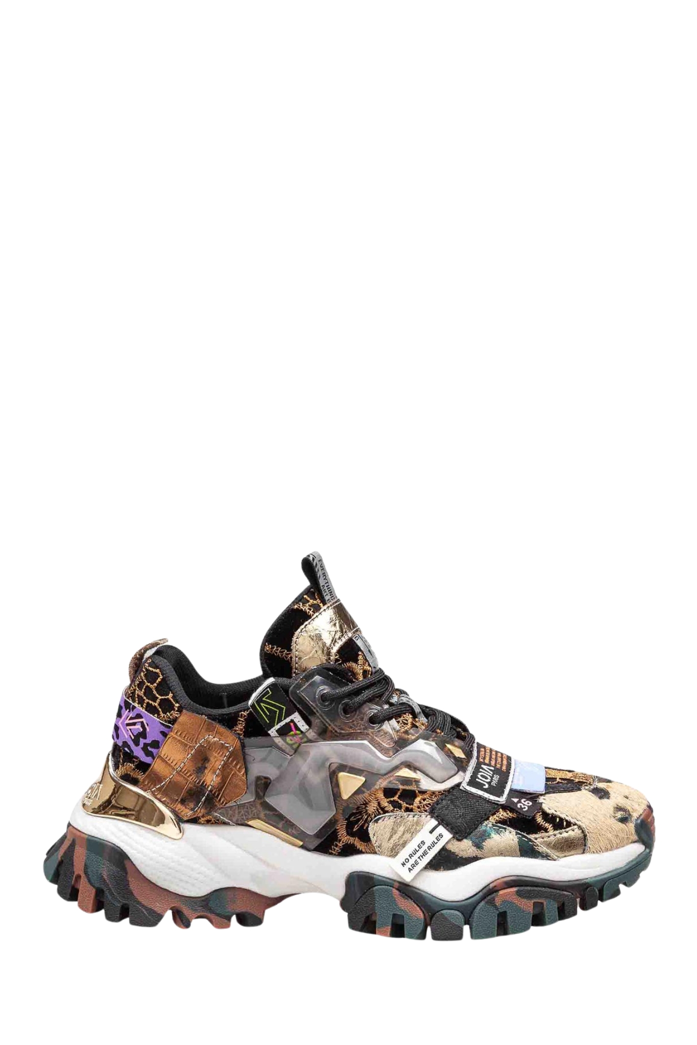 - Tomaia: mix di materiali tra pelle laminata oro, inserti in cavallino stampato animalier e pannelli in rete con dettagli traslucidi