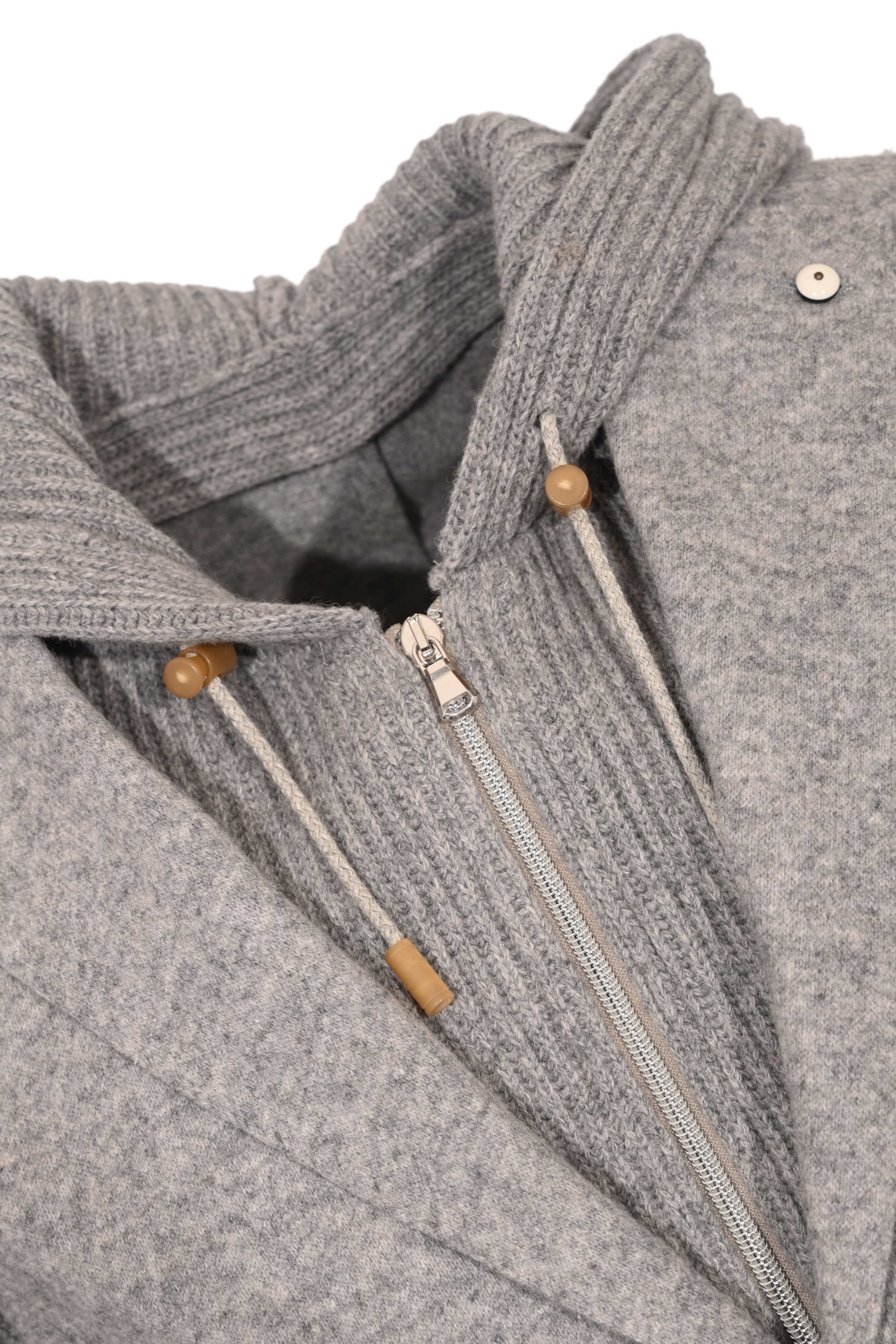 - Dettagli: inserti in maglia su maniche e gilet interno, cappuccio con coulisse e finalini a contrasto