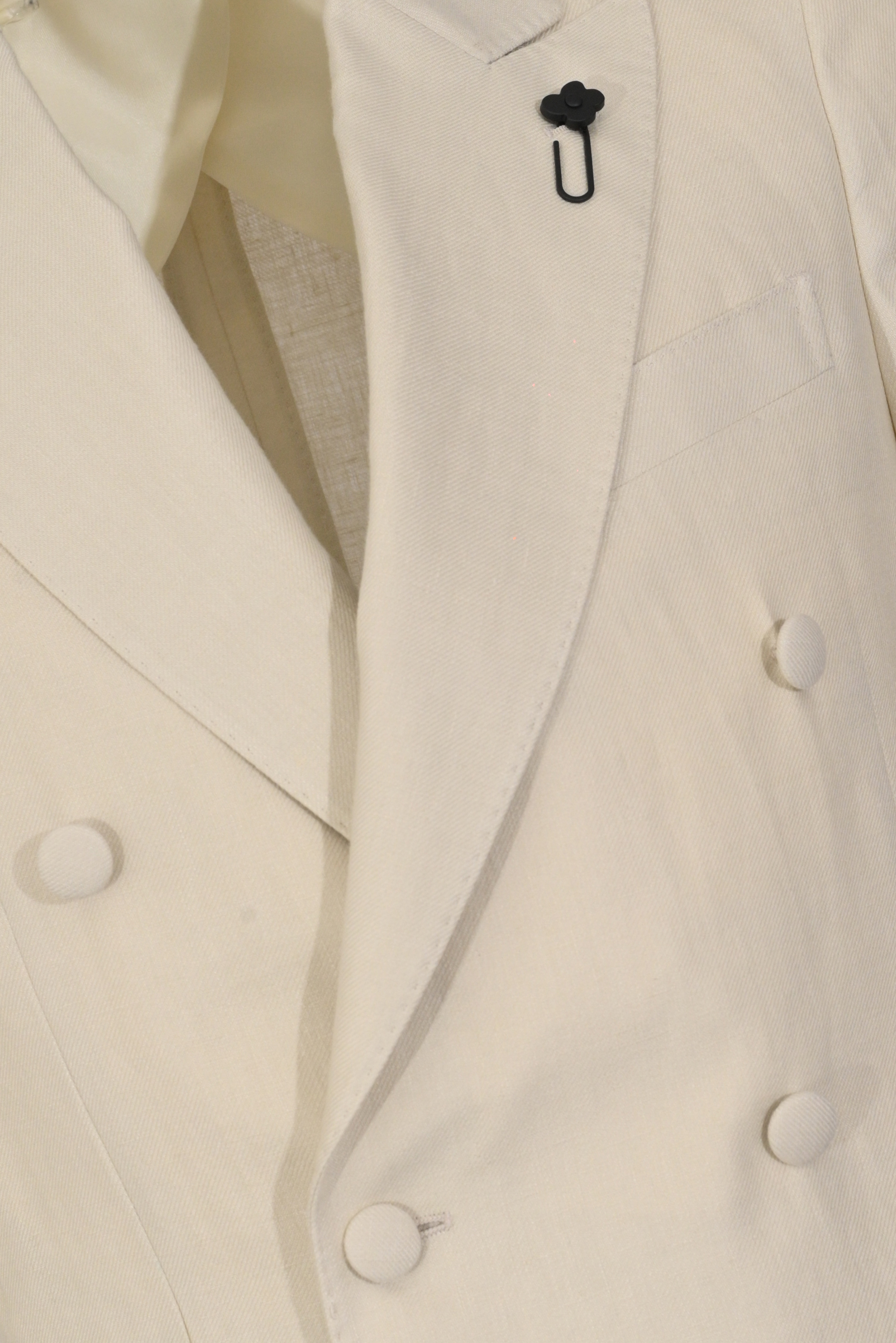 - Dettagli: drop 7 reg, spilla decorativa sul rever, pantalone coordinato con piega centrale