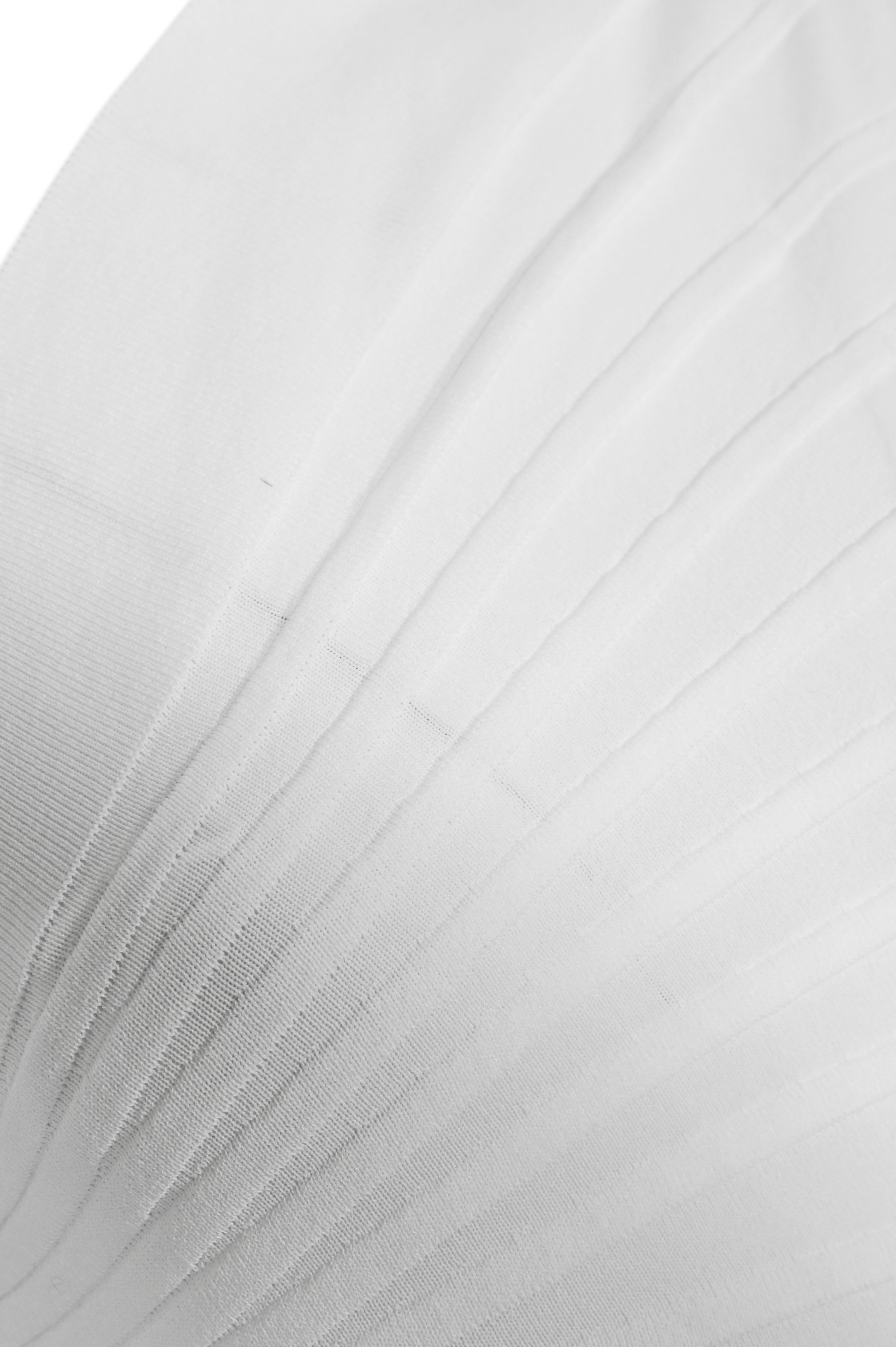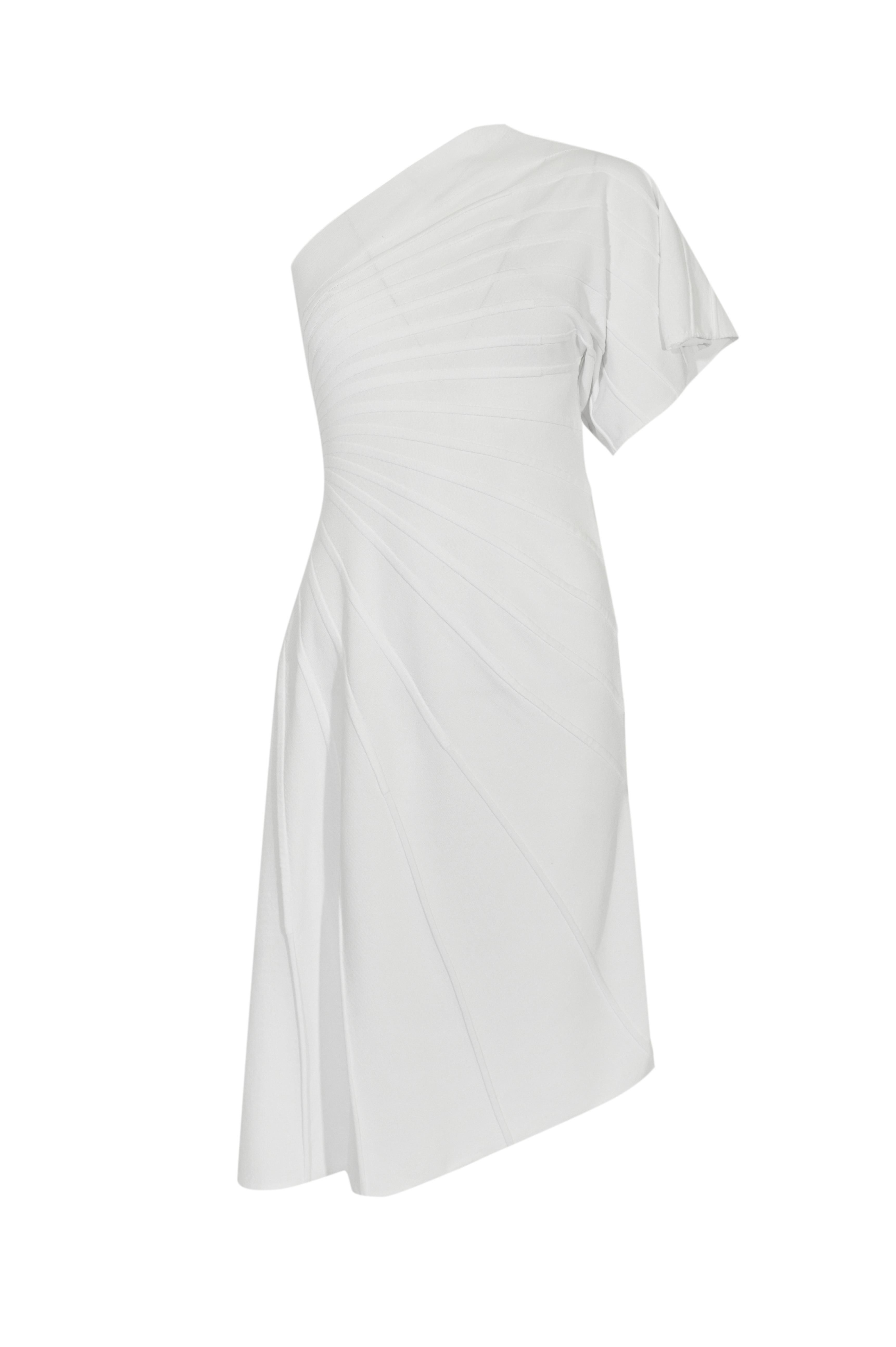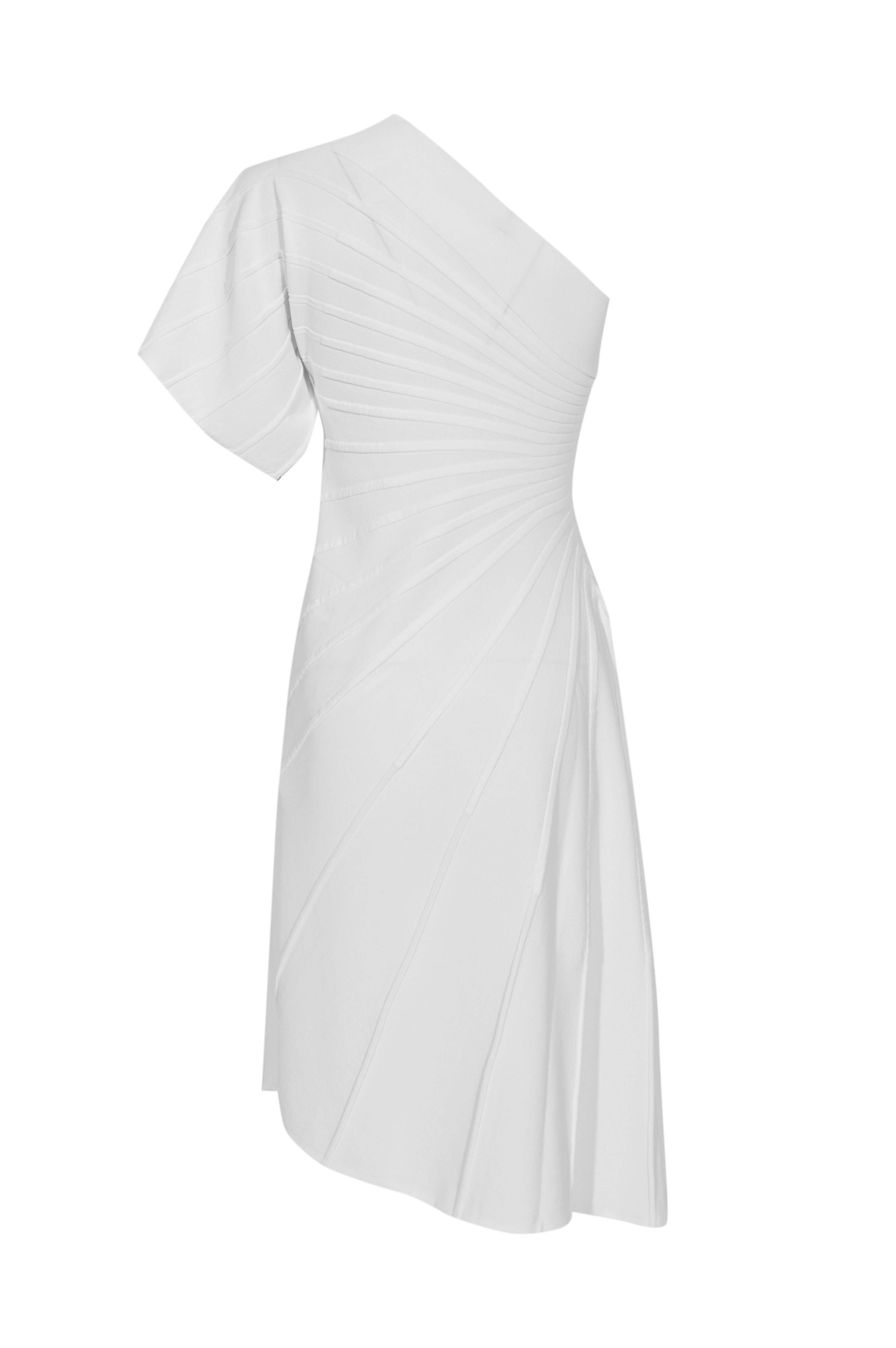 - Dettagli: lavorazione a pieghe radiali, linea aderente sul busto con gonna svasata