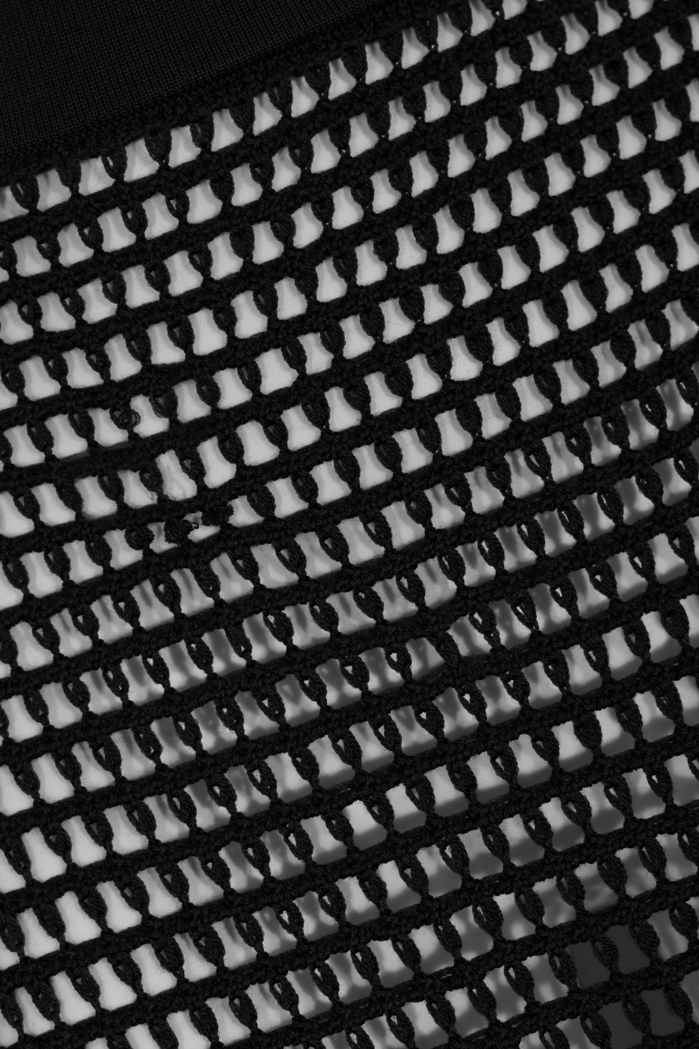 - Dettagli: lavorazione a rete traforata con bordo a coste sul fondo e fascia in vita in maglia compatta