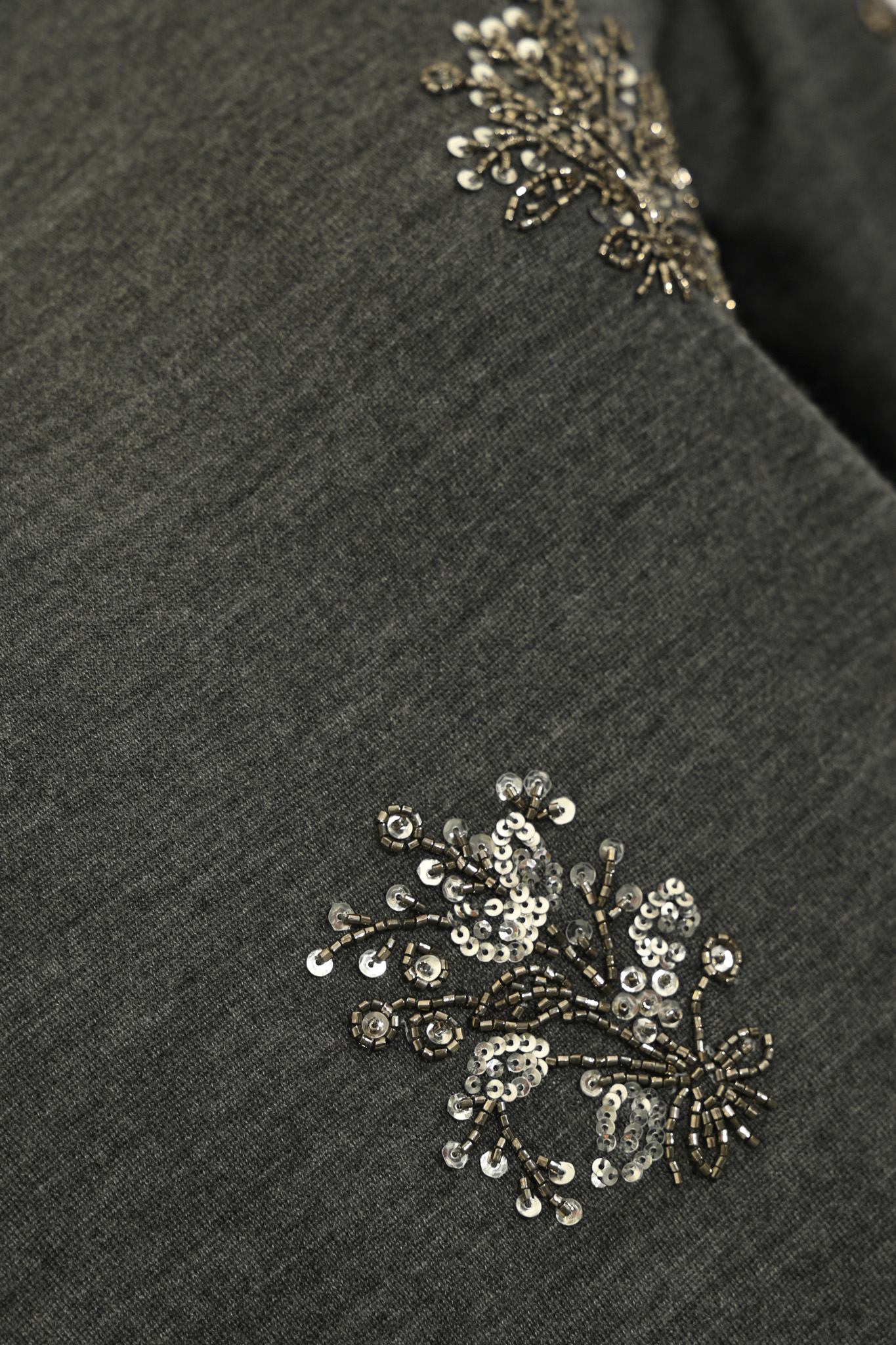 - Dettagli: ricamo gioiello applicato su fronte e maniche con perline e paillettes, fondo e maniche rifiniti a coste sottili