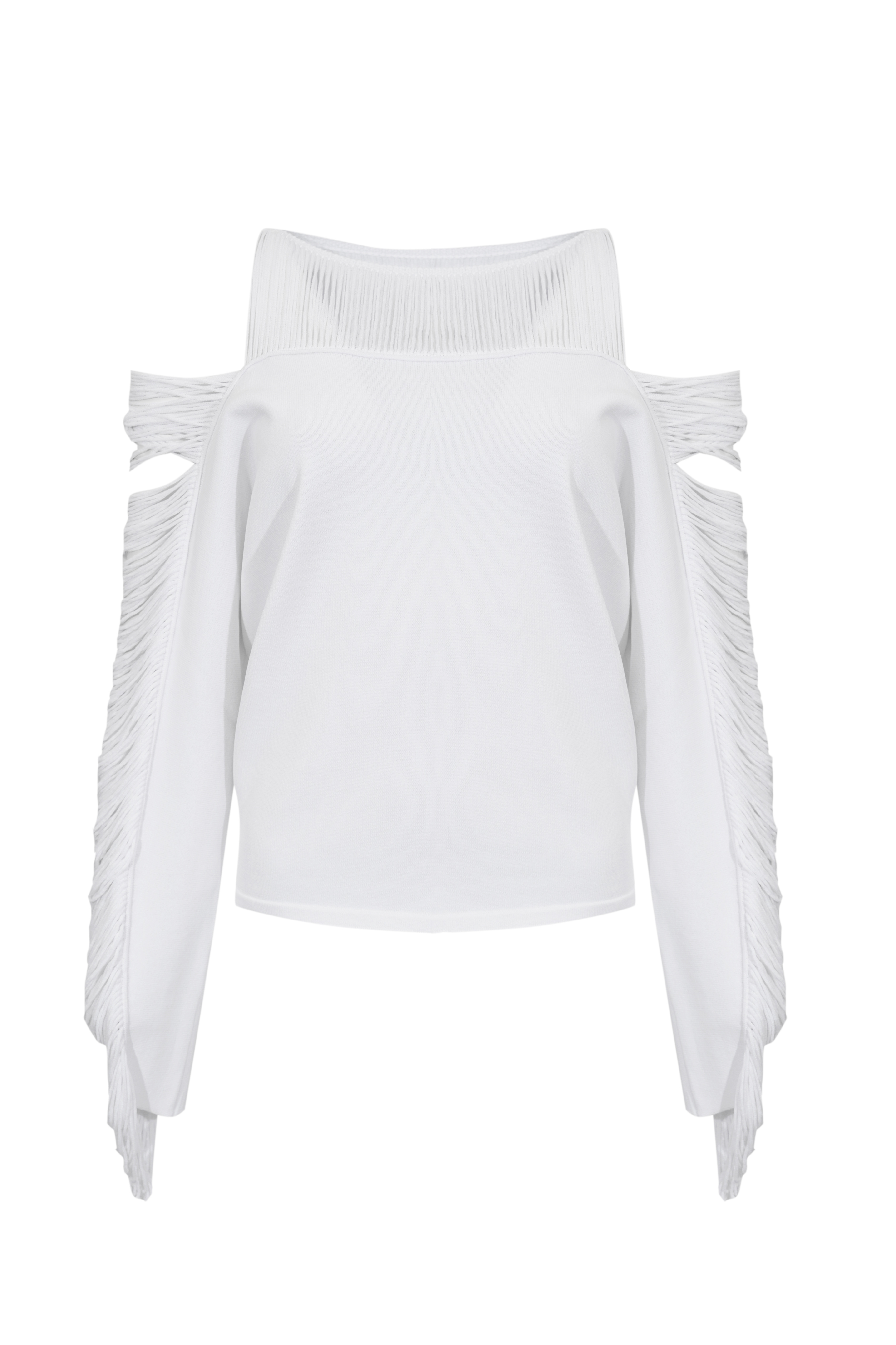 - Dettagli: spalle scoperte con lavorazione cut out, applicazione di fili decorativi su maniche e spalle, finiture a costine