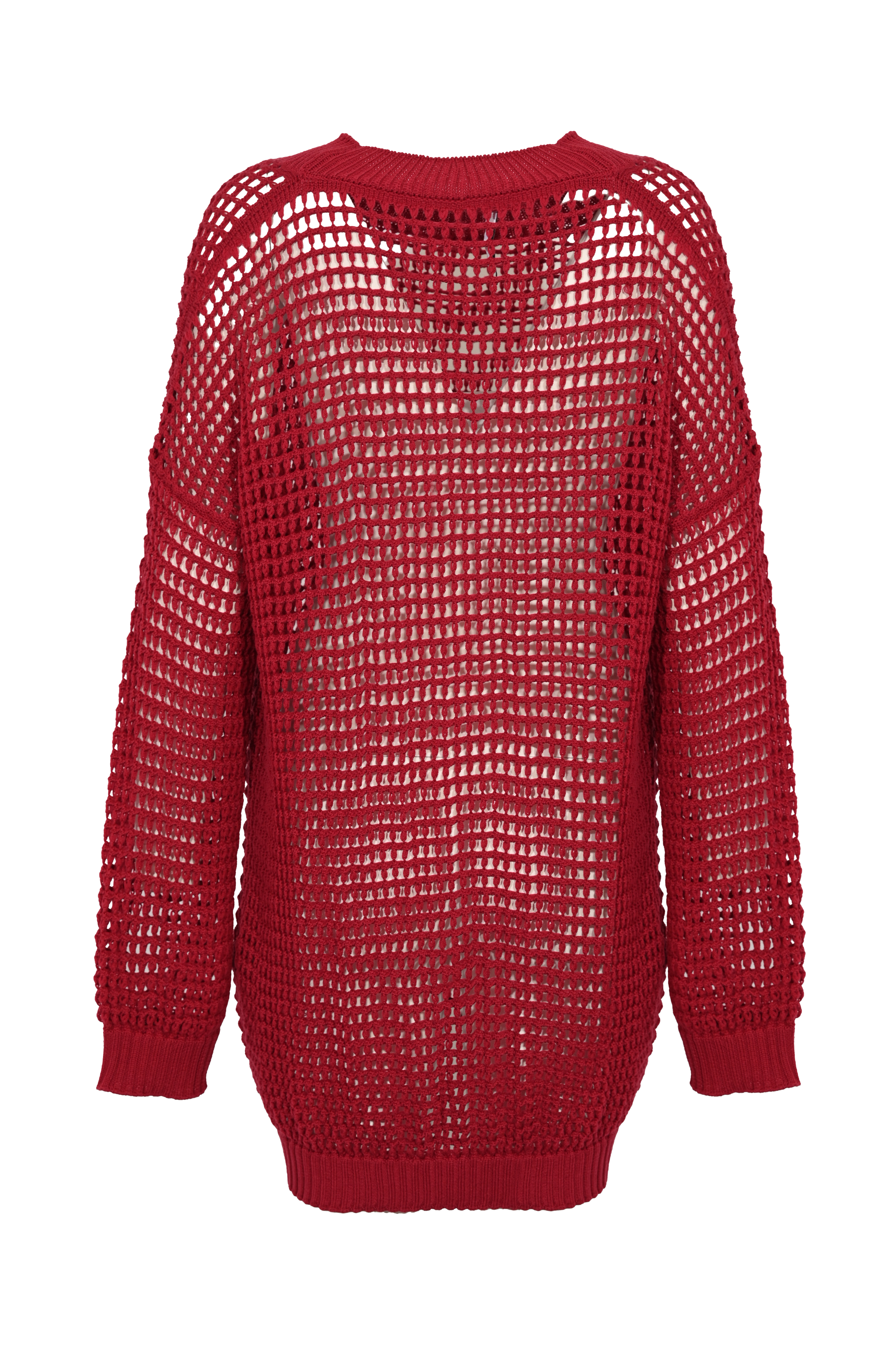 - Dettagli: lavorazione traforata effetto rete, bordi a costine su collo, polsini e fondo, linea morbida e leggermente più lunga sul retro