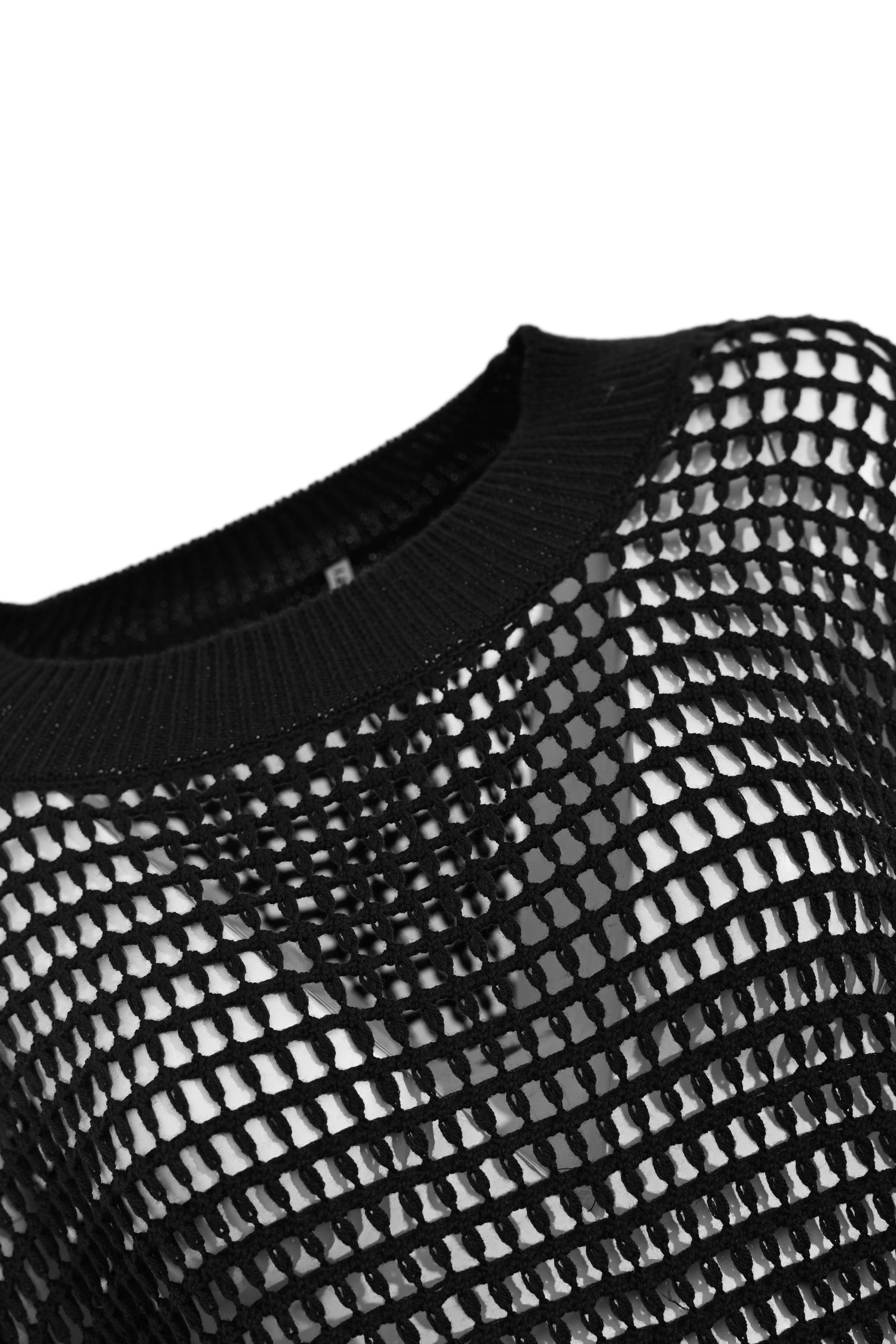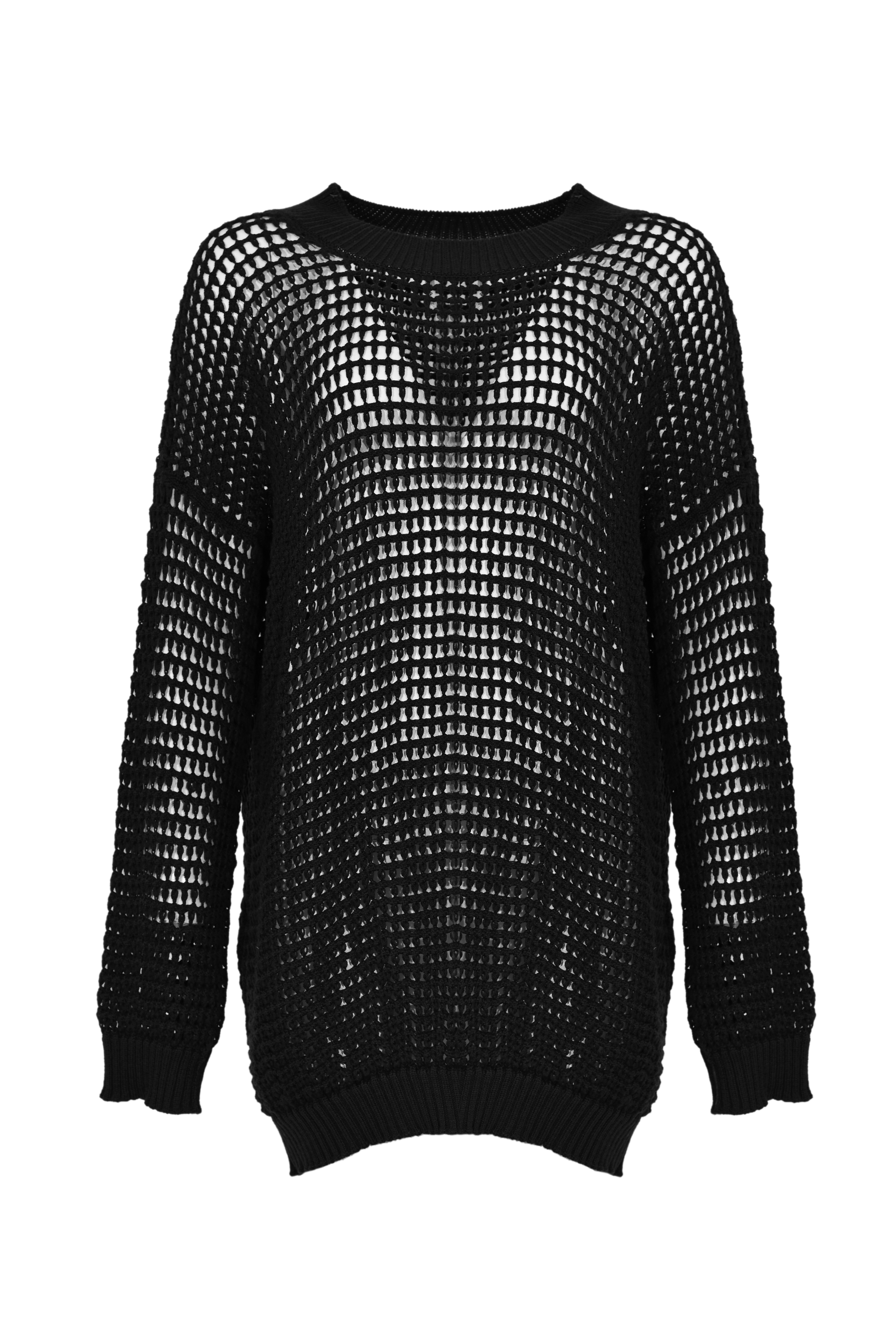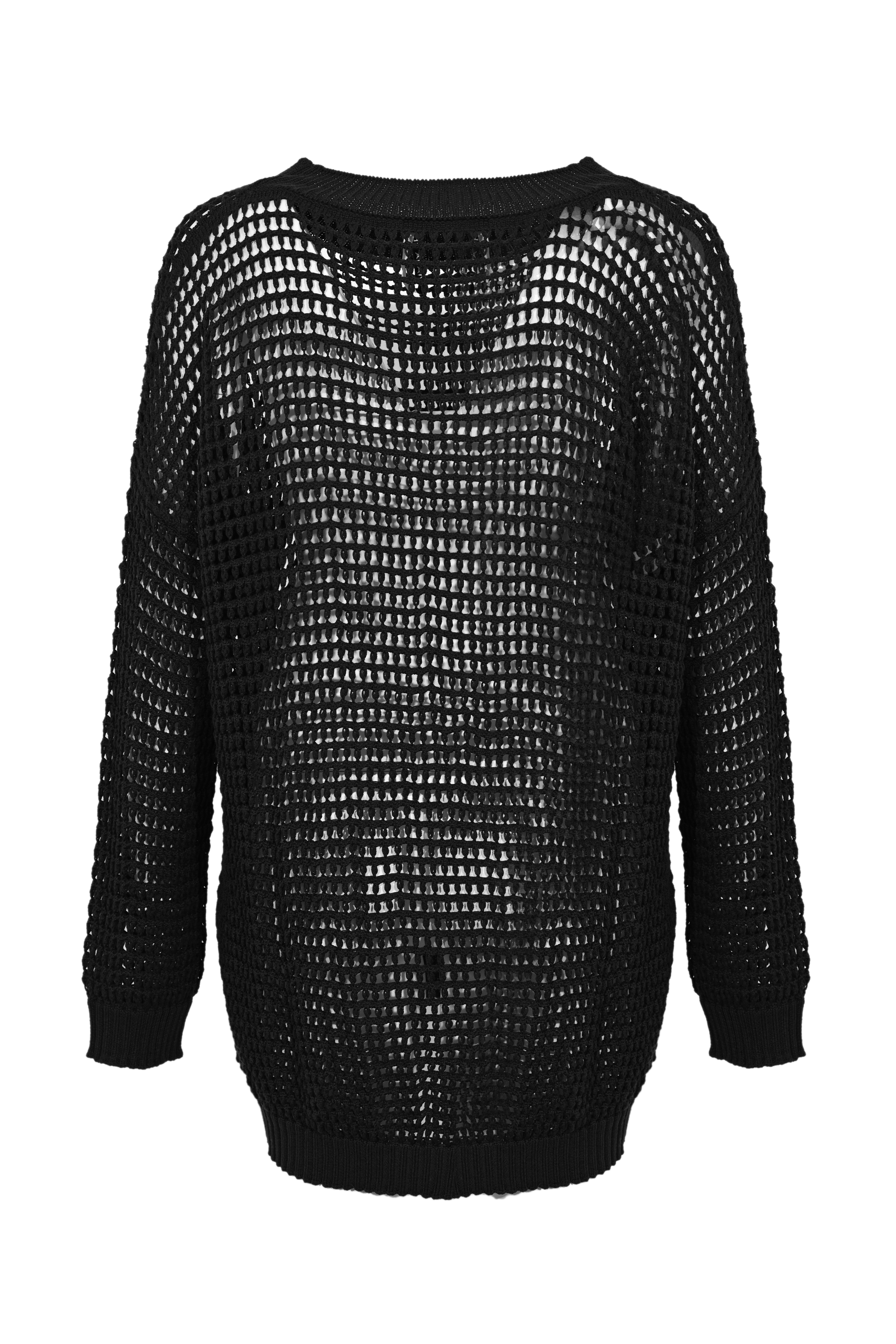 - Dettagli: lavorazione traforata effetto rete, bordi a costine su collo, polsini e fondo, linea morbida e leggermente più lunga sul retro