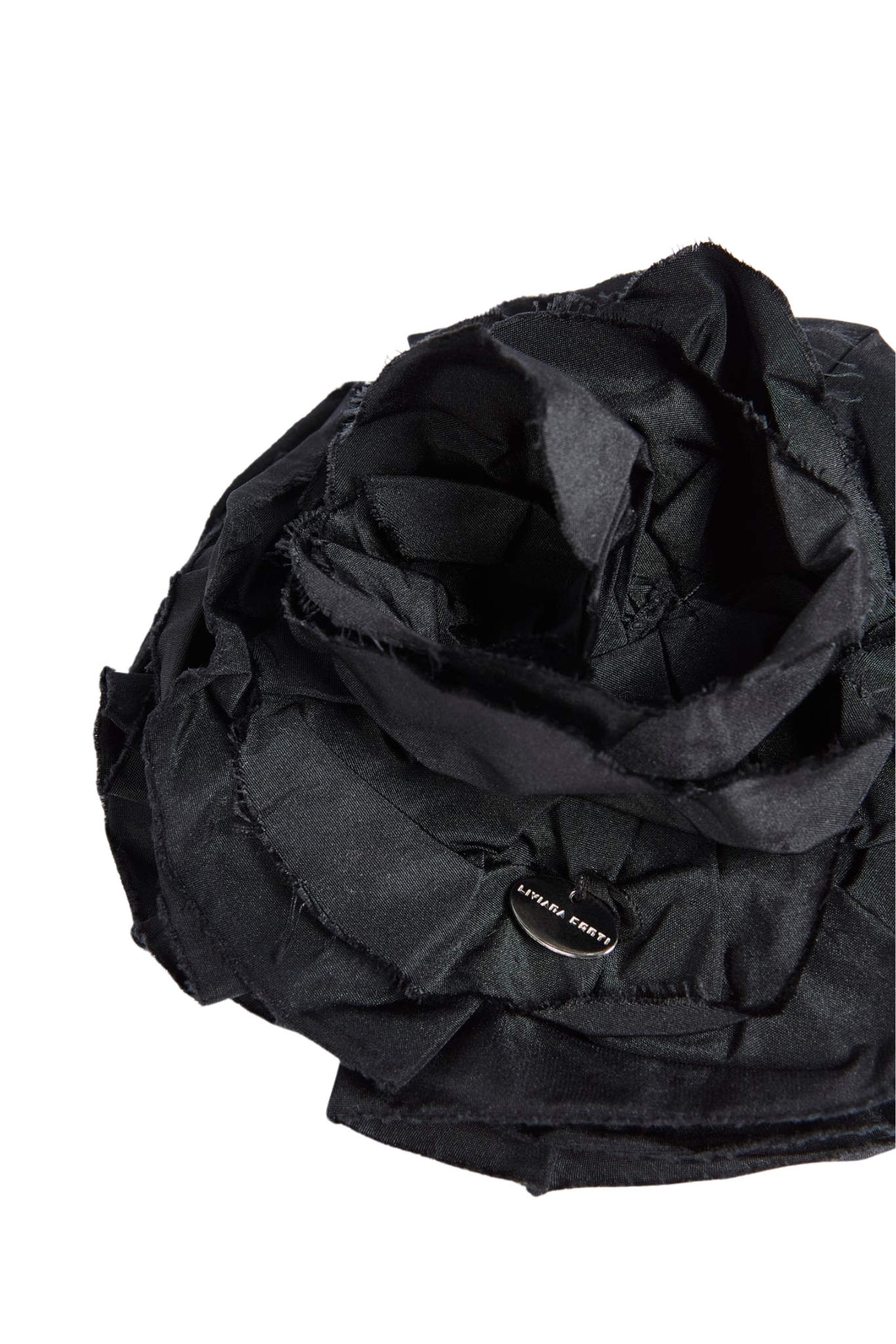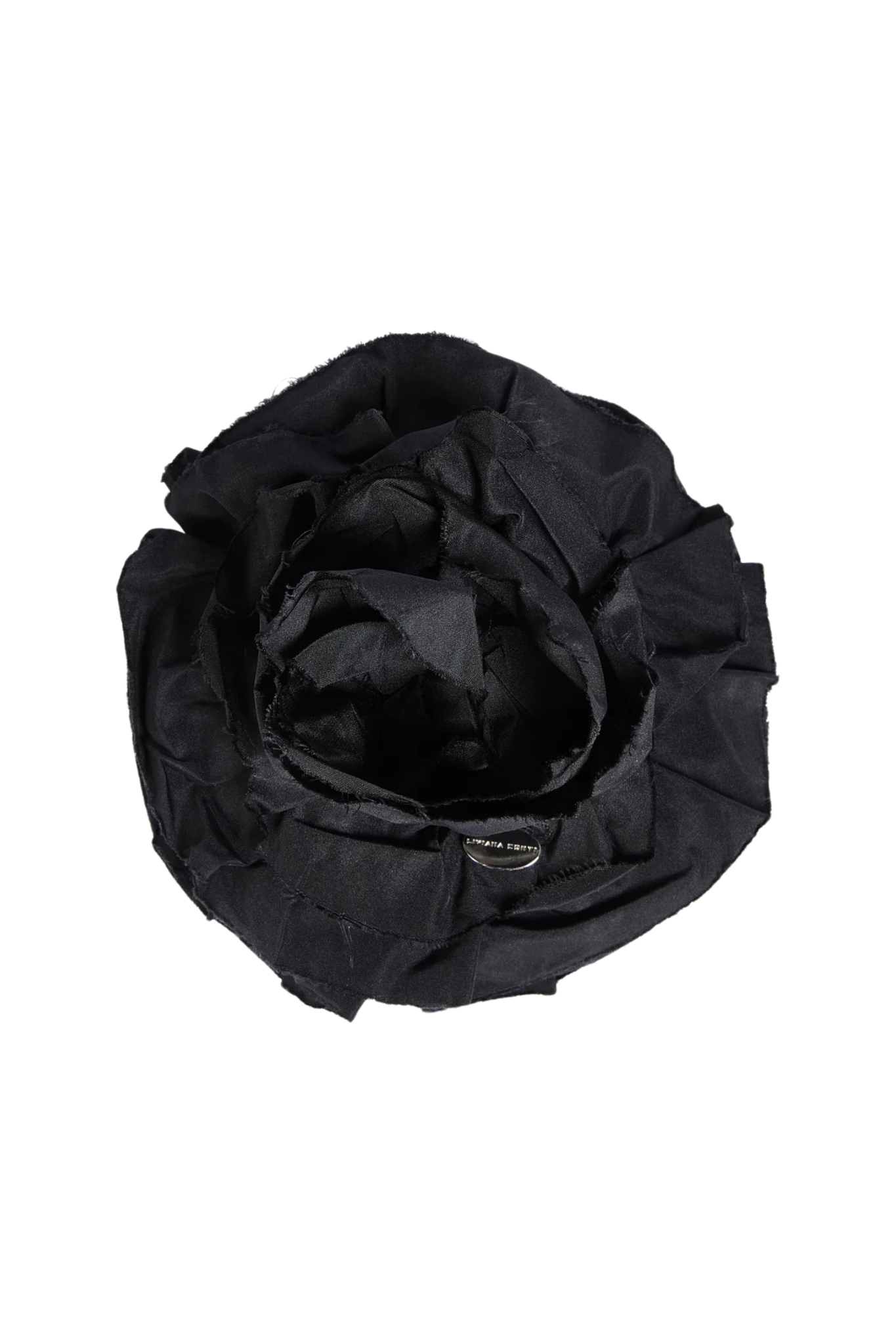 - Dettagli: design a fiore voluminoso, petali sovrapposti in tessuto che creano un effetto materico e sofisticato, stile elegante e scenografico, piccolo elemento metallico con logo applicato