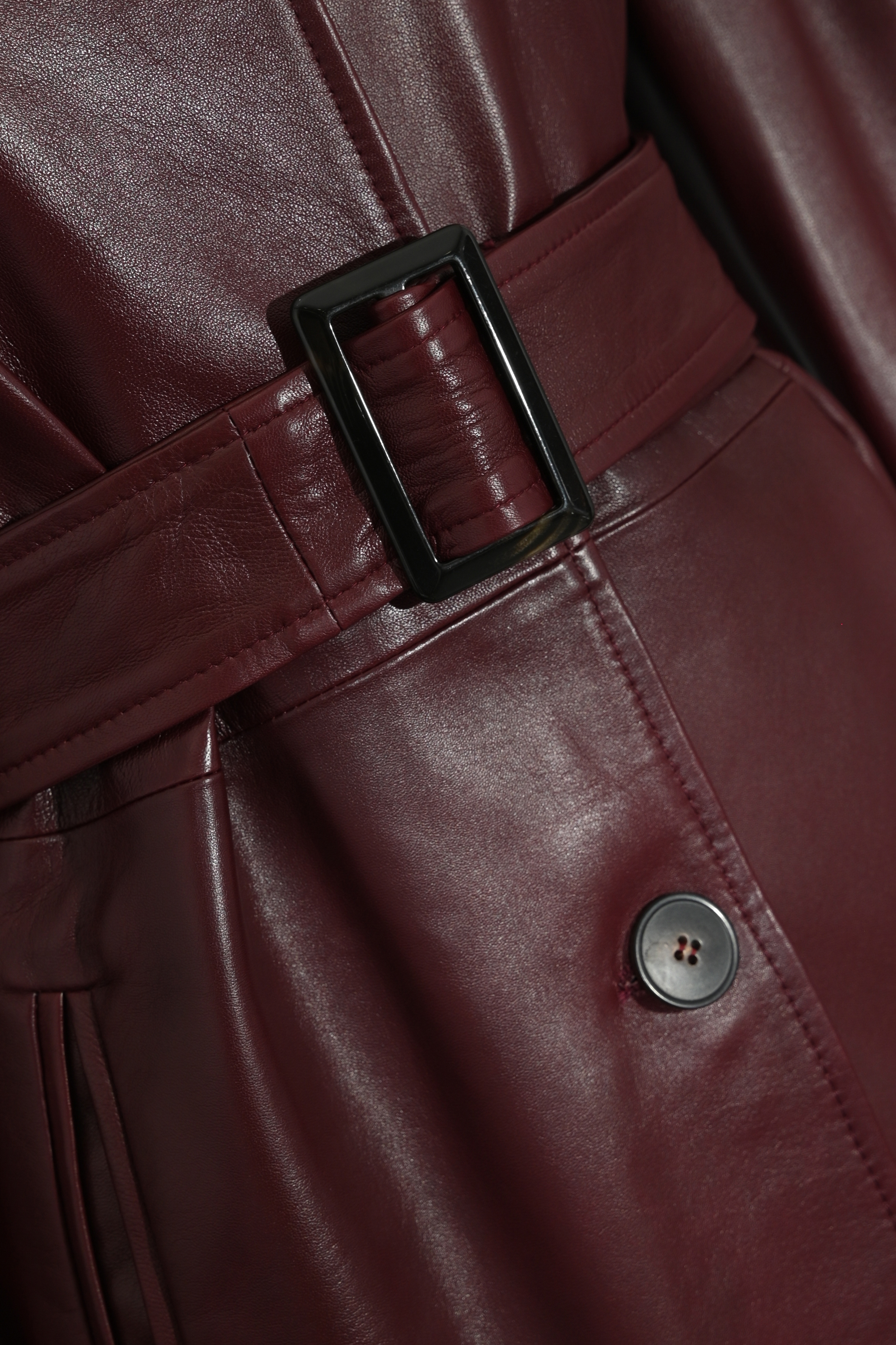 - Dettagli: cintura coordinata con fibbia rettangolare, cuciture a vista, effetto lucido, lunghezza media