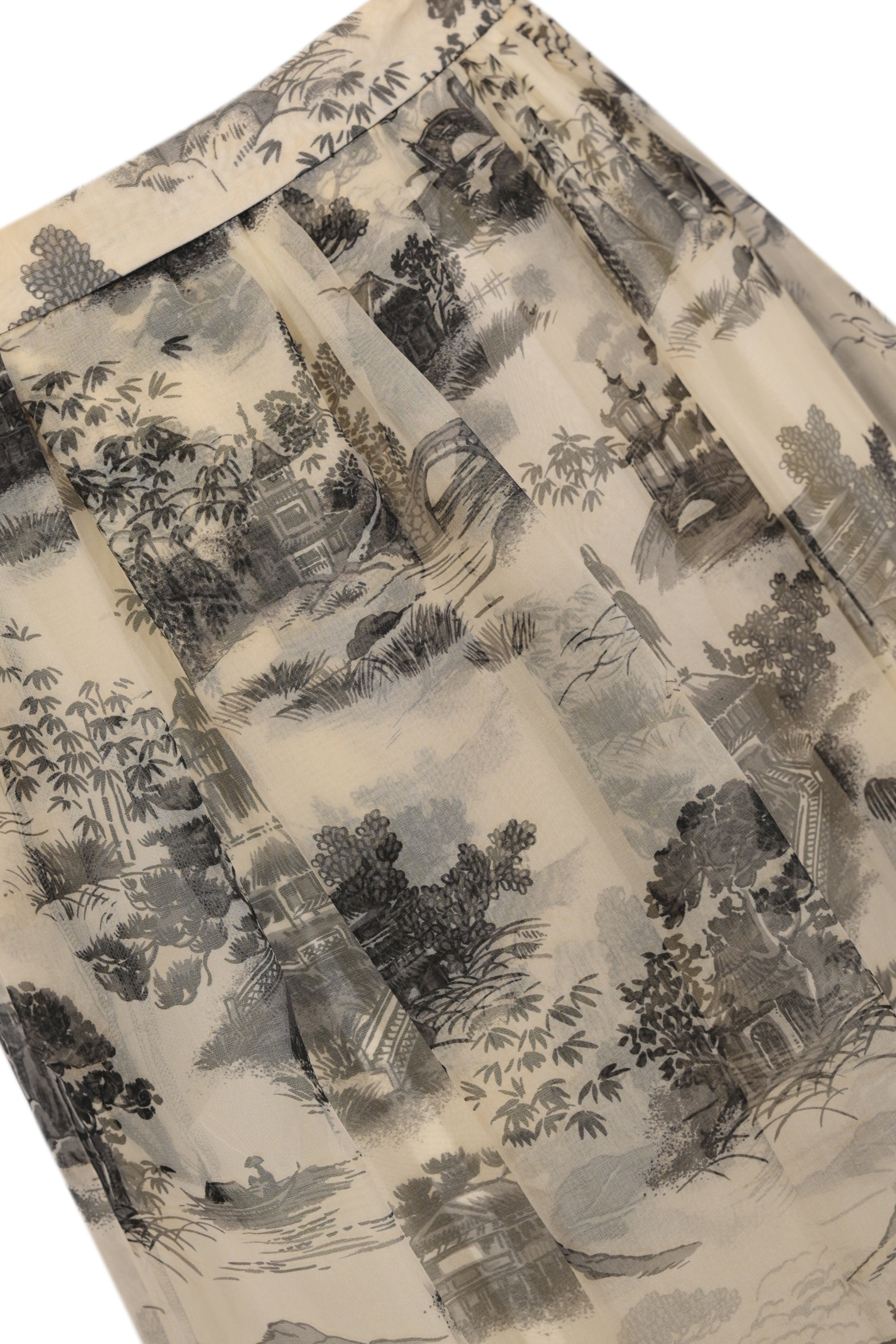 - Dettagli: pieghe frontali che creano volume e movimento, motivo stampato con paesaggi e dettagli architettonici, effetto semi-trasparente, linea ampia e fluida, costruzione elegante e raffinata