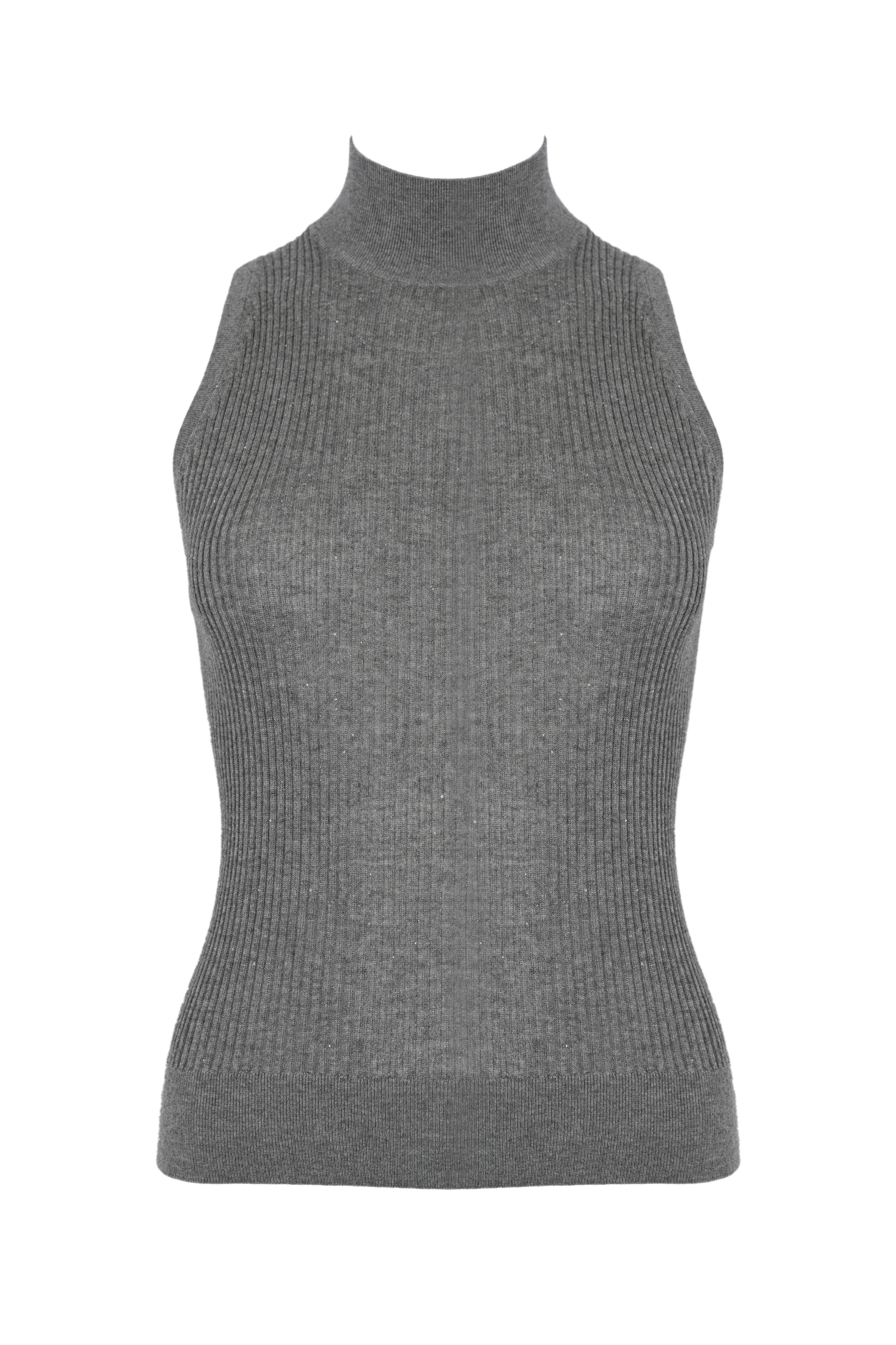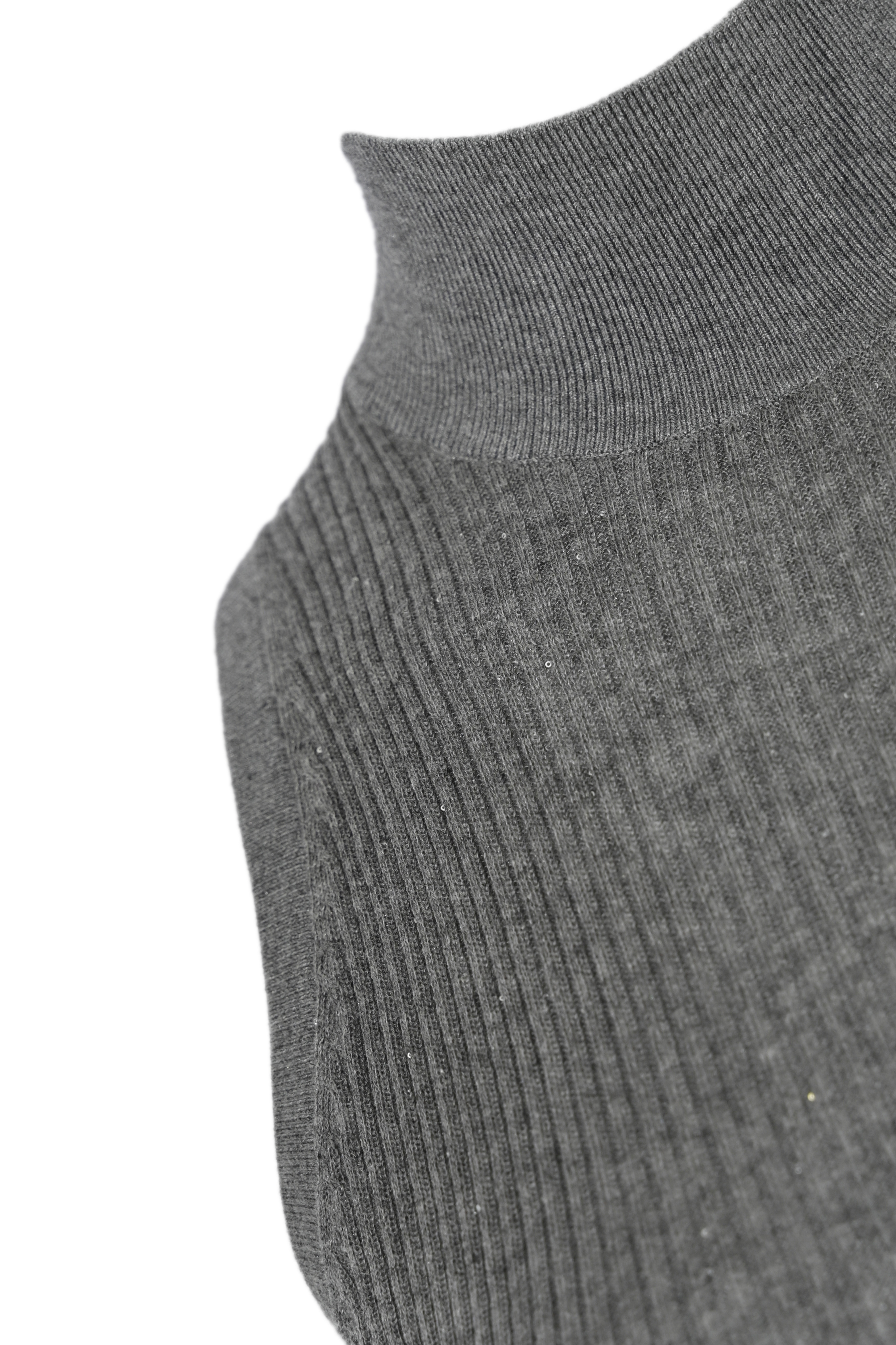 - Dettagli: lavorazione a coste verticali su tutta la superficie, orlo e bordo collo a costine più fini; linea essenziale e aderente