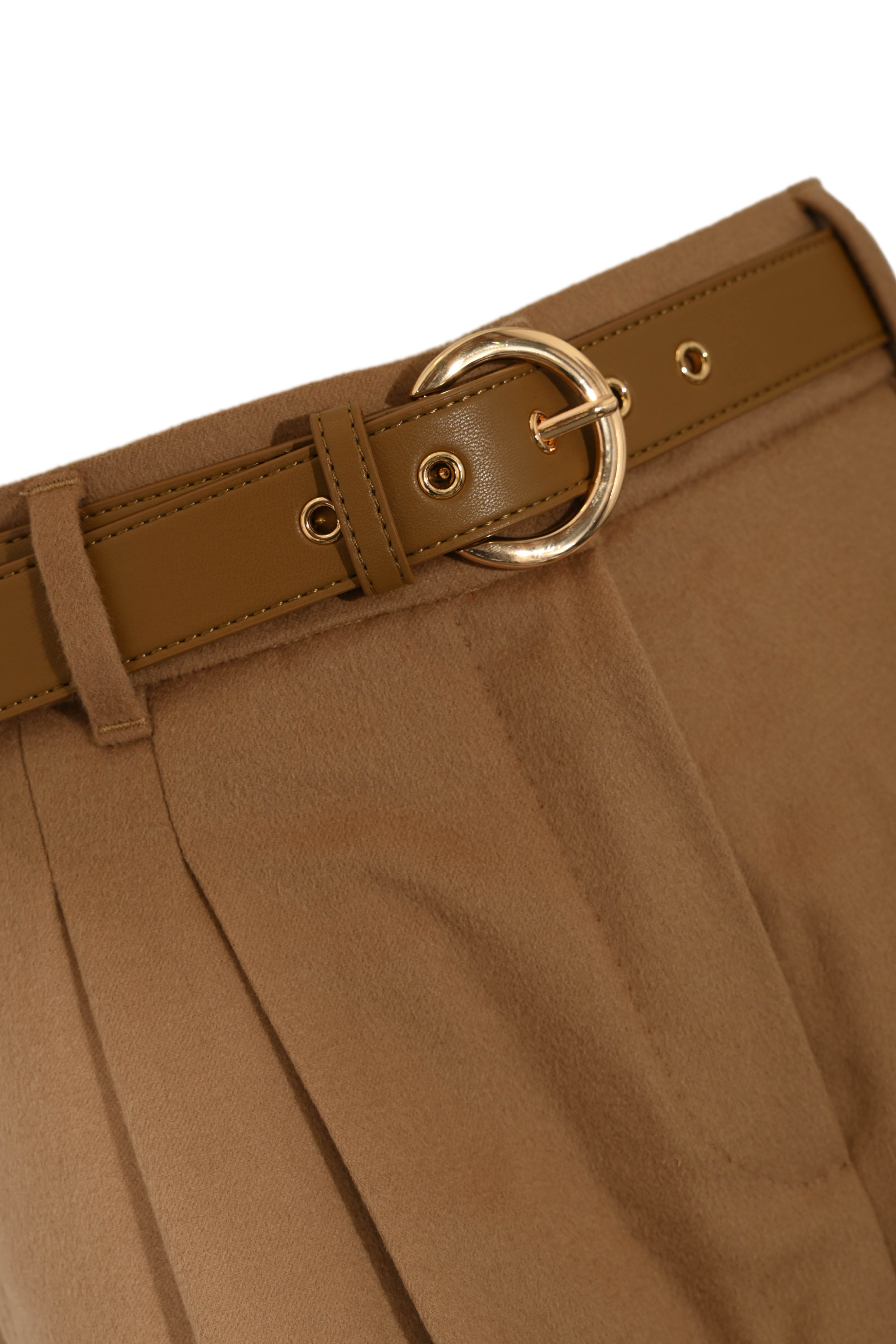- Dettagli: pince frontali, piega stirata centrale, cintura coordinata in pelle con fibbia dorata