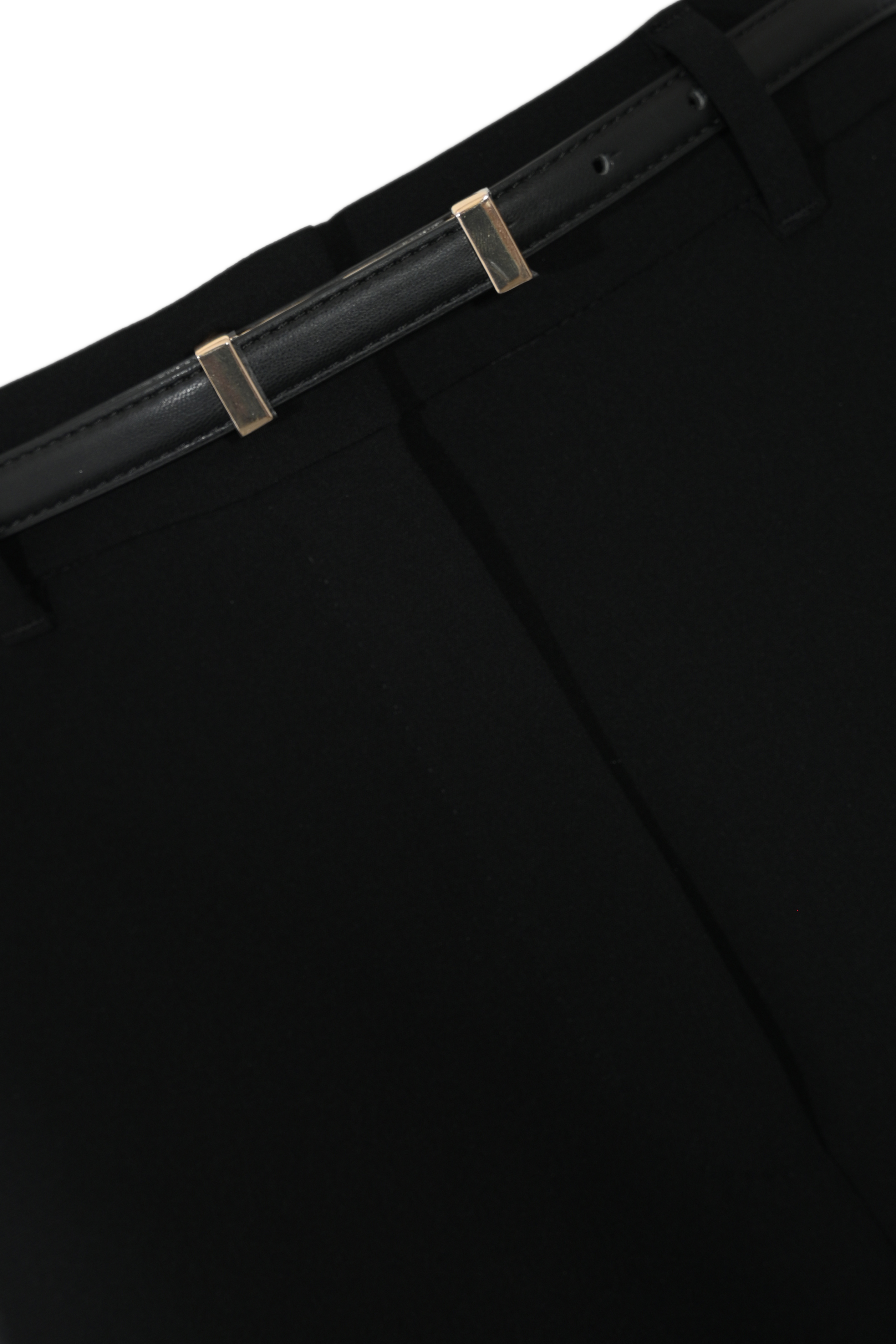- Vita: alta con passanti e cintura sottile in pelle con fibbia dorata