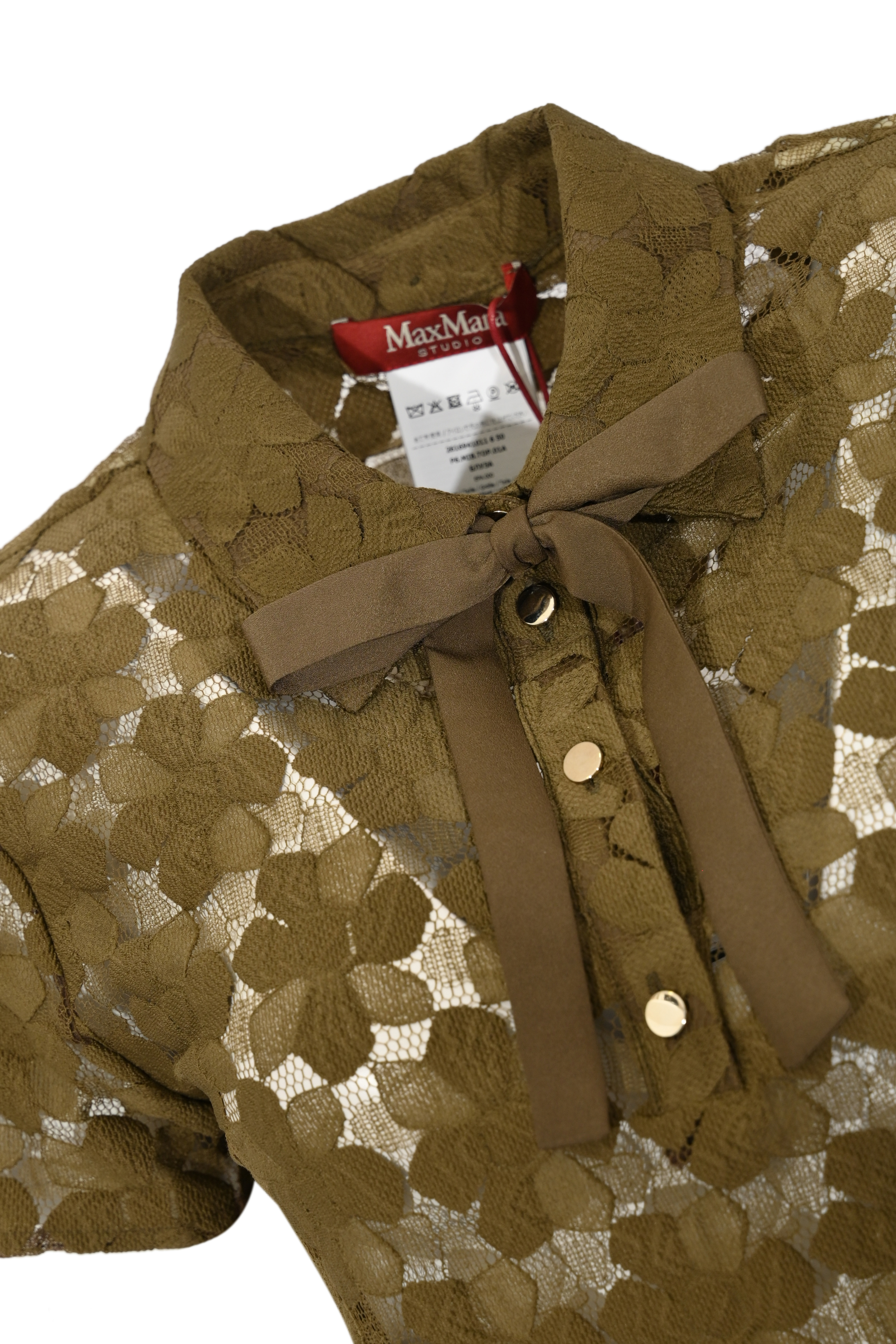 - Dettagli: fiocco in tessuto coordinato al collo, bottoni gioiello, lavorazione in pizzo semitrasparente