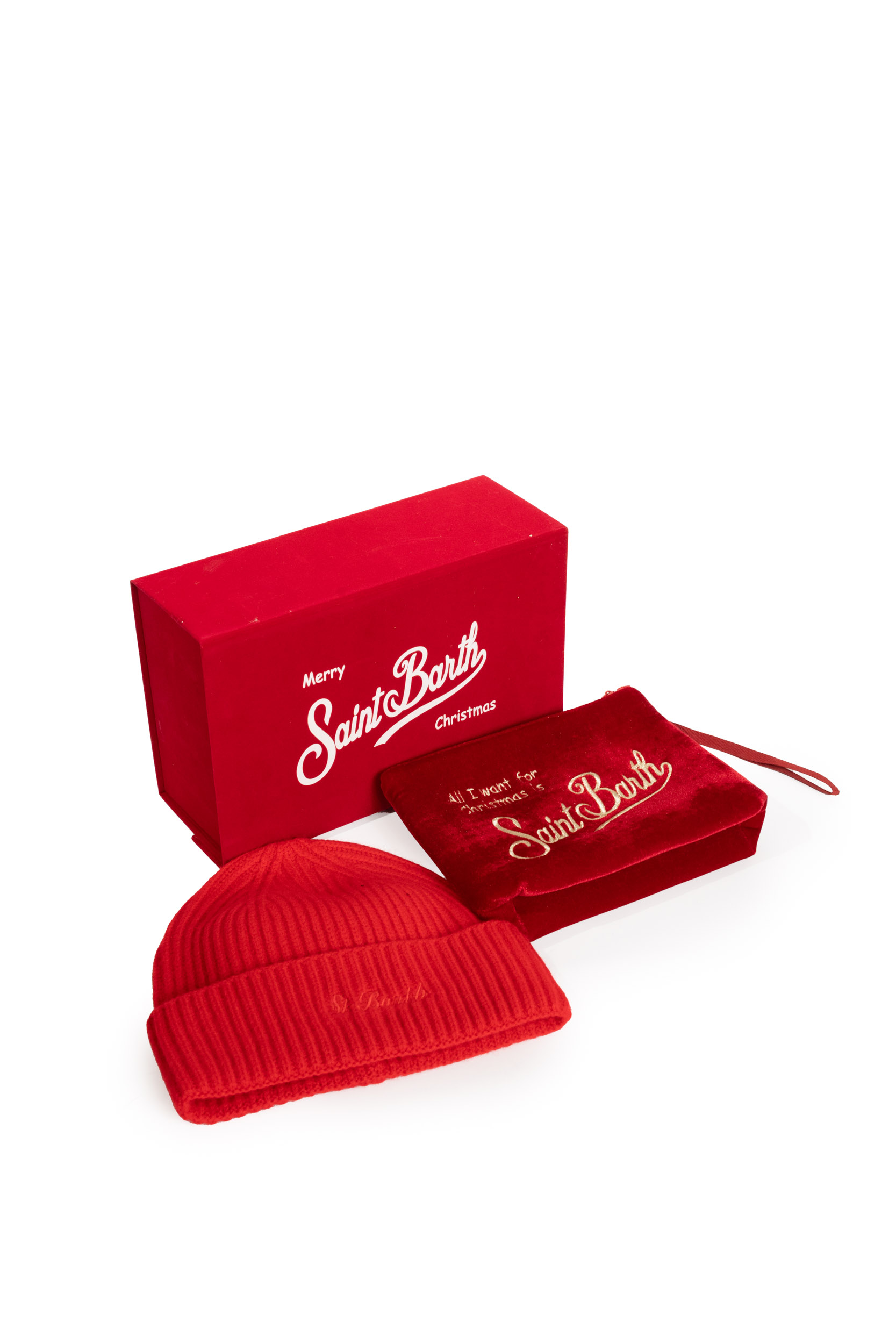 - Packaging natalizio rosso con logo Merry Saint Barth Christmas stampato in bianco