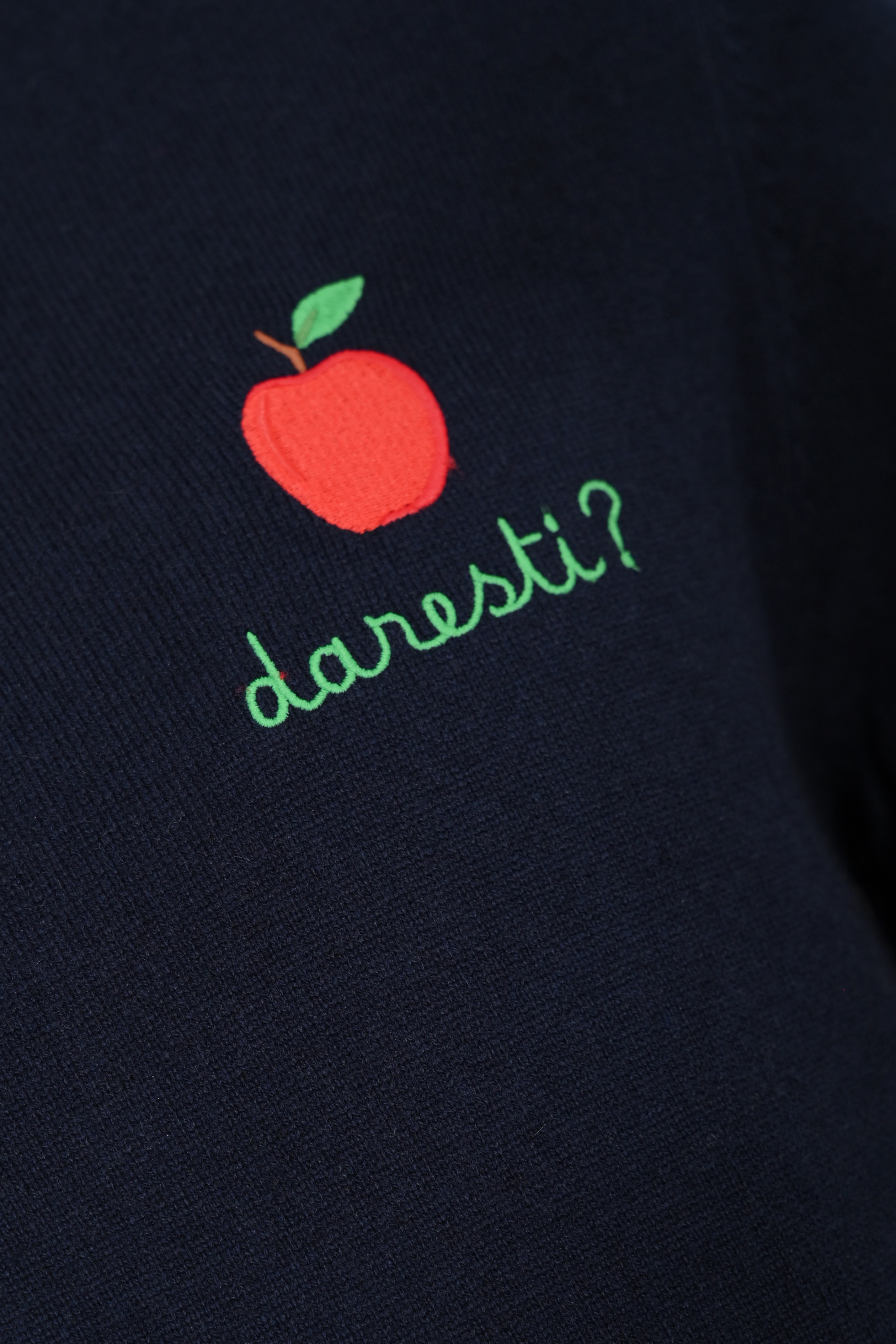 - Dettagli: ricamo con mela rossa e scritta verde sul petto, bordi a coste, finiture elastiche