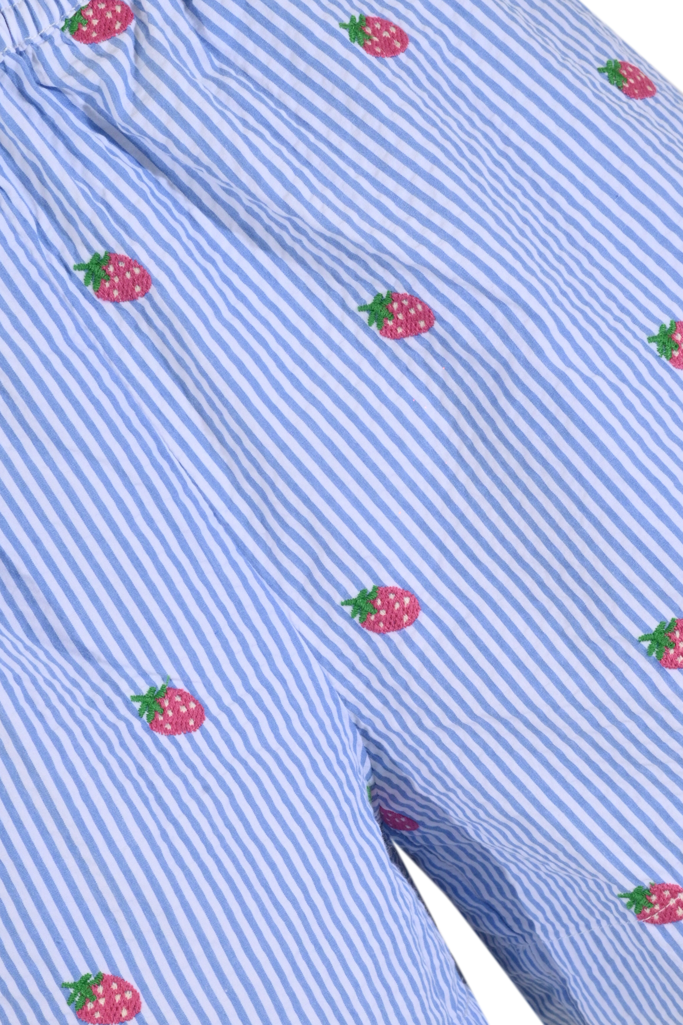 - Dettagli: ricami a forma di fragola su tutta la superficie, tessuto leggero e arricciato tipico del seersucker