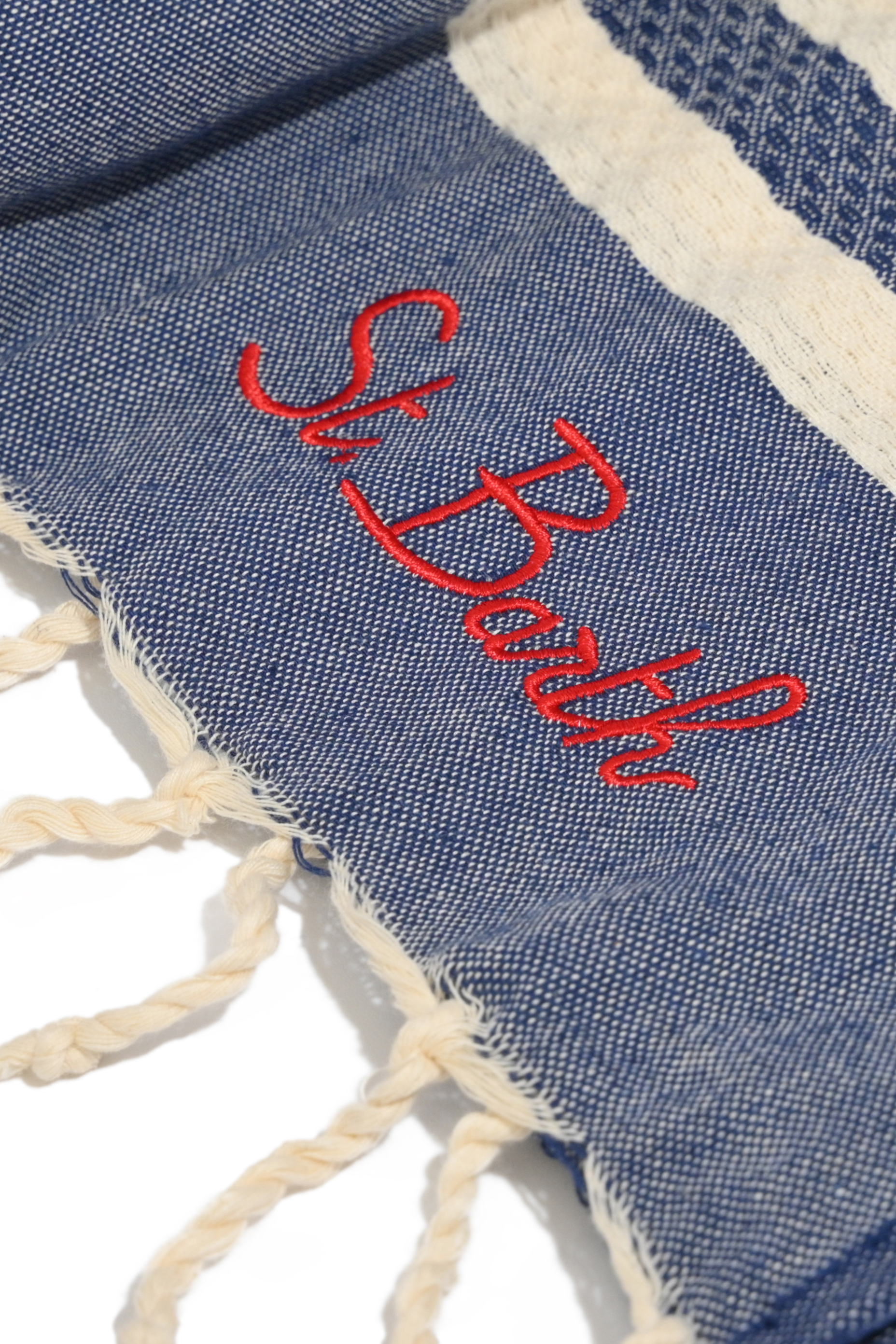 - Dettagli: logo ricamato a contrasto, bordi con frange annodate, texture leggera e traspirante