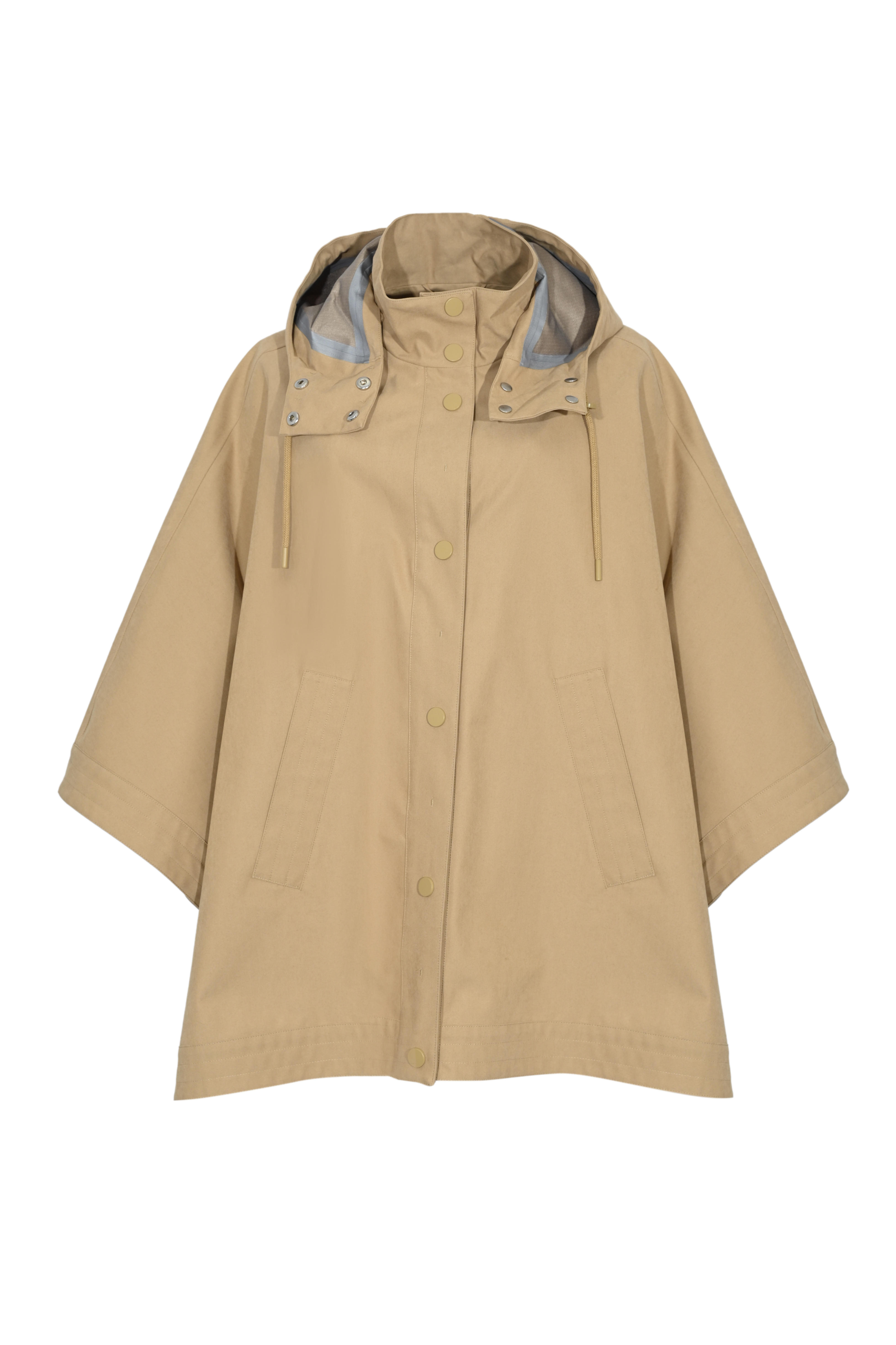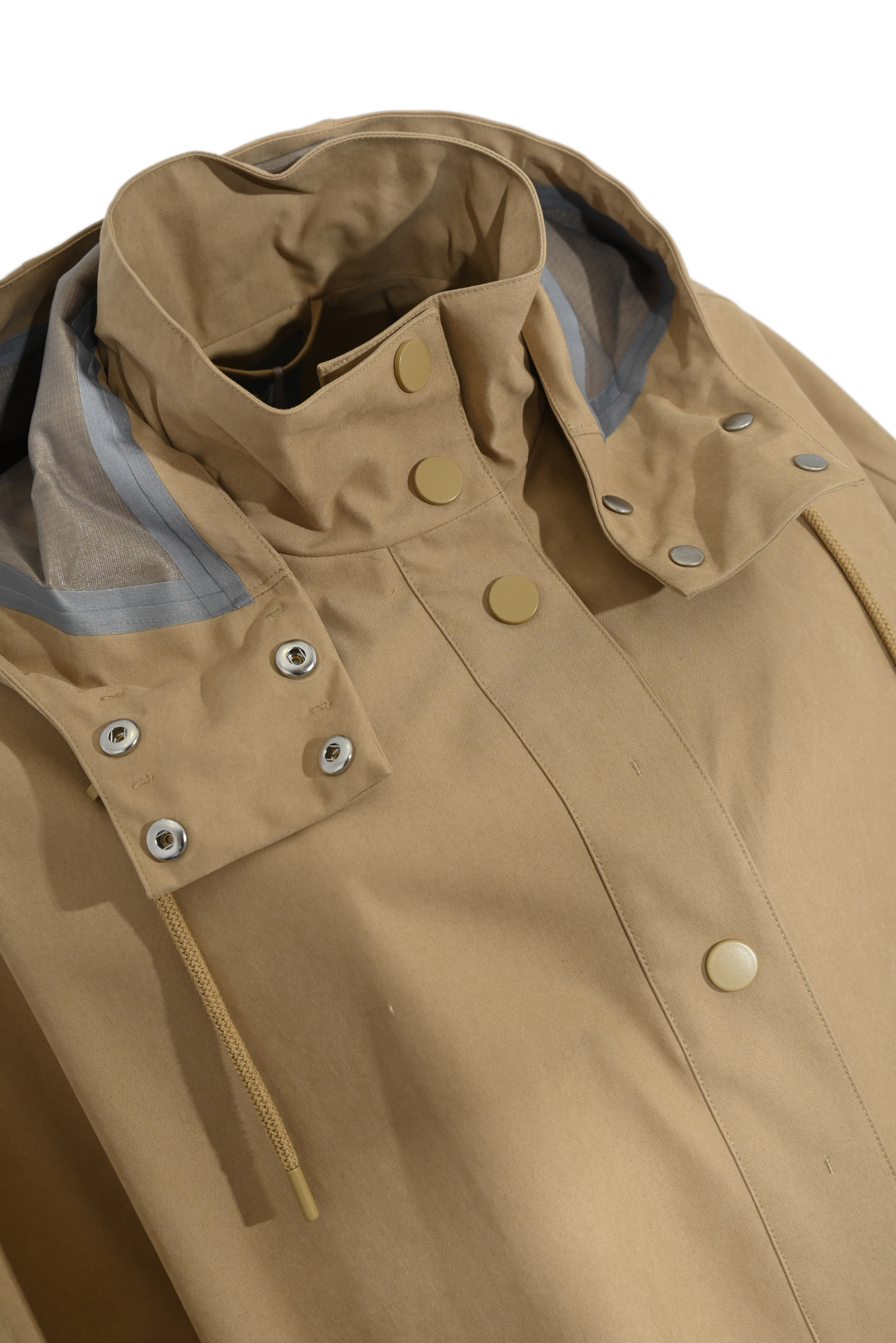 - Dettagli: taglio ampio a mantella, finiture interne impermeabili a contrasto, cappuccio con coulisse e bottoni metallici