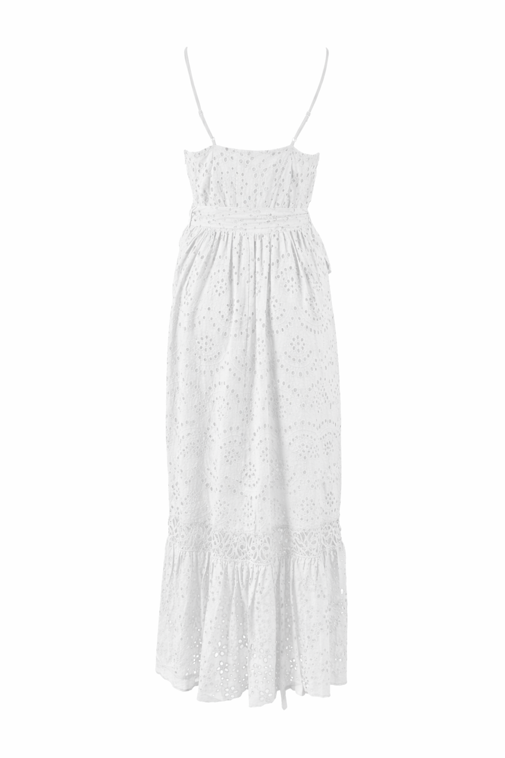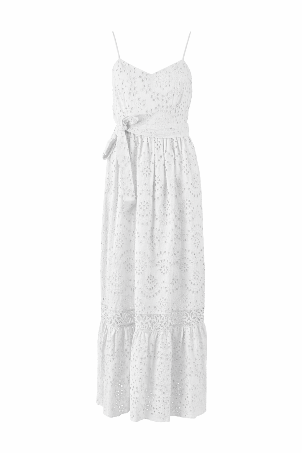 - Dettagli: cintura in vita con fiocco, vita elasticizzata, gonna a balze, inserto in pizzo sul fondo