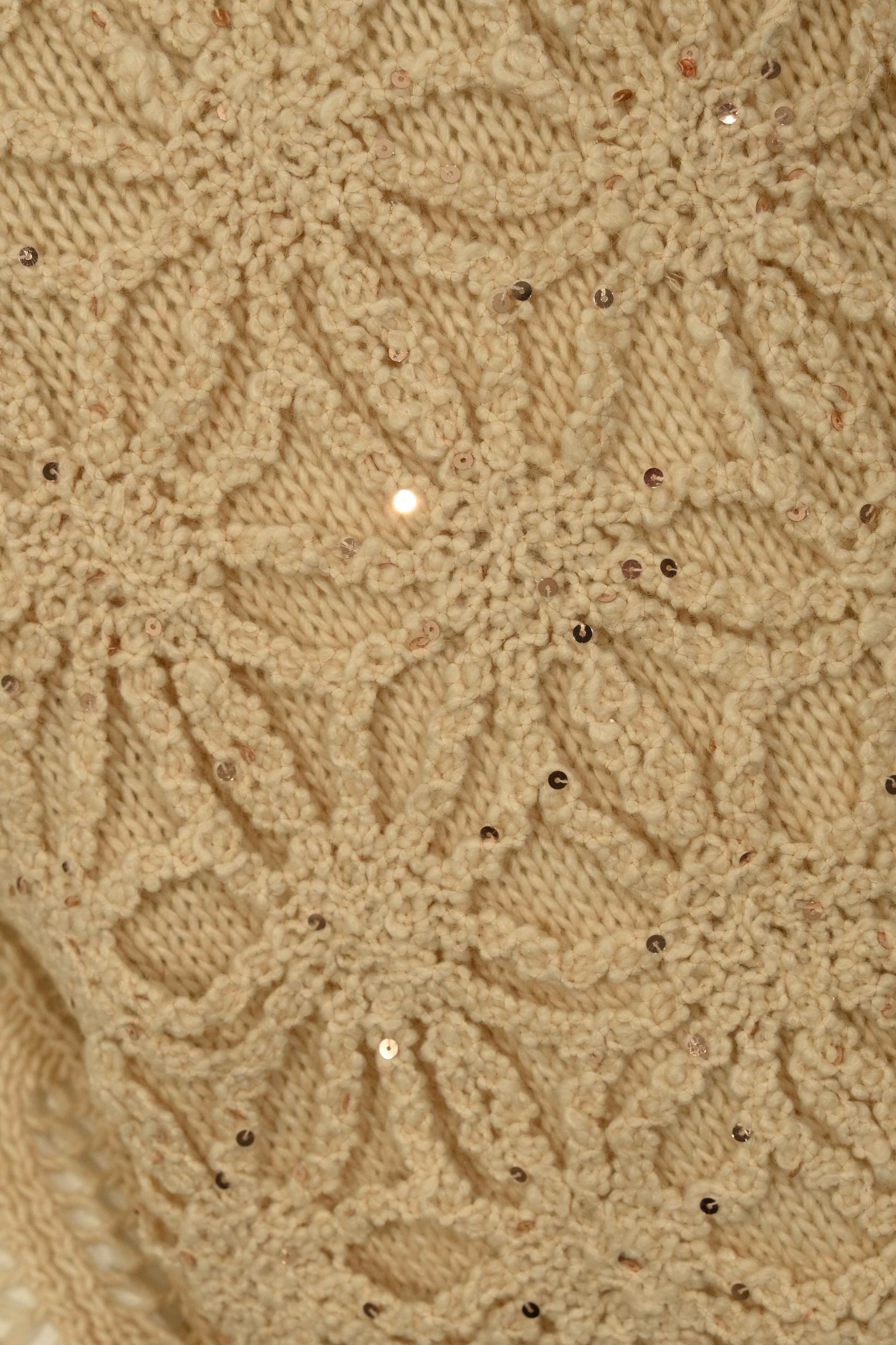 - Dettagli: lavorazione alluncinetto con disegno floreale, applicazioni di paillettes lucenti, bordi a costine su collo, fondo e polsi, stile femminile e luminoso