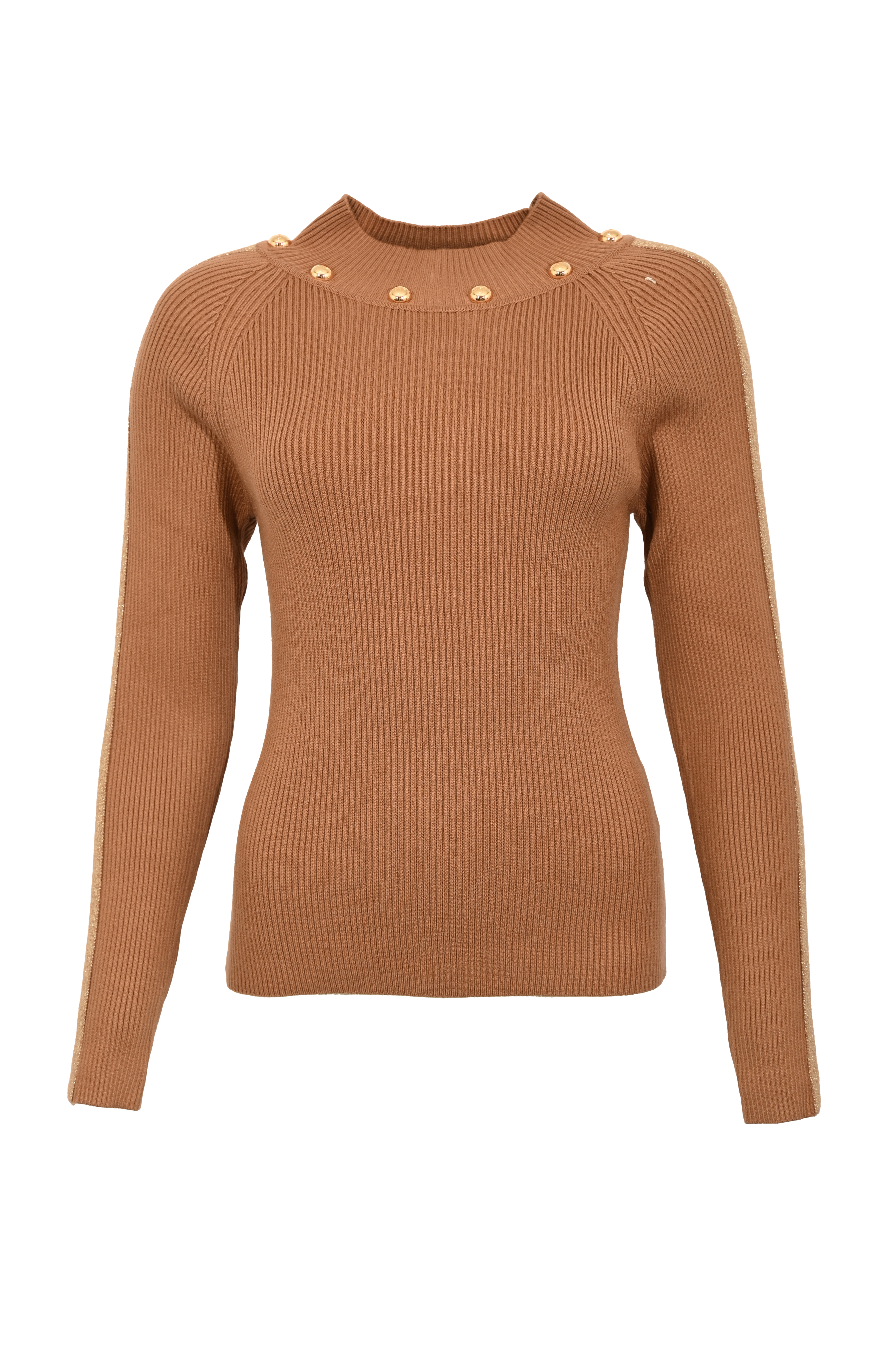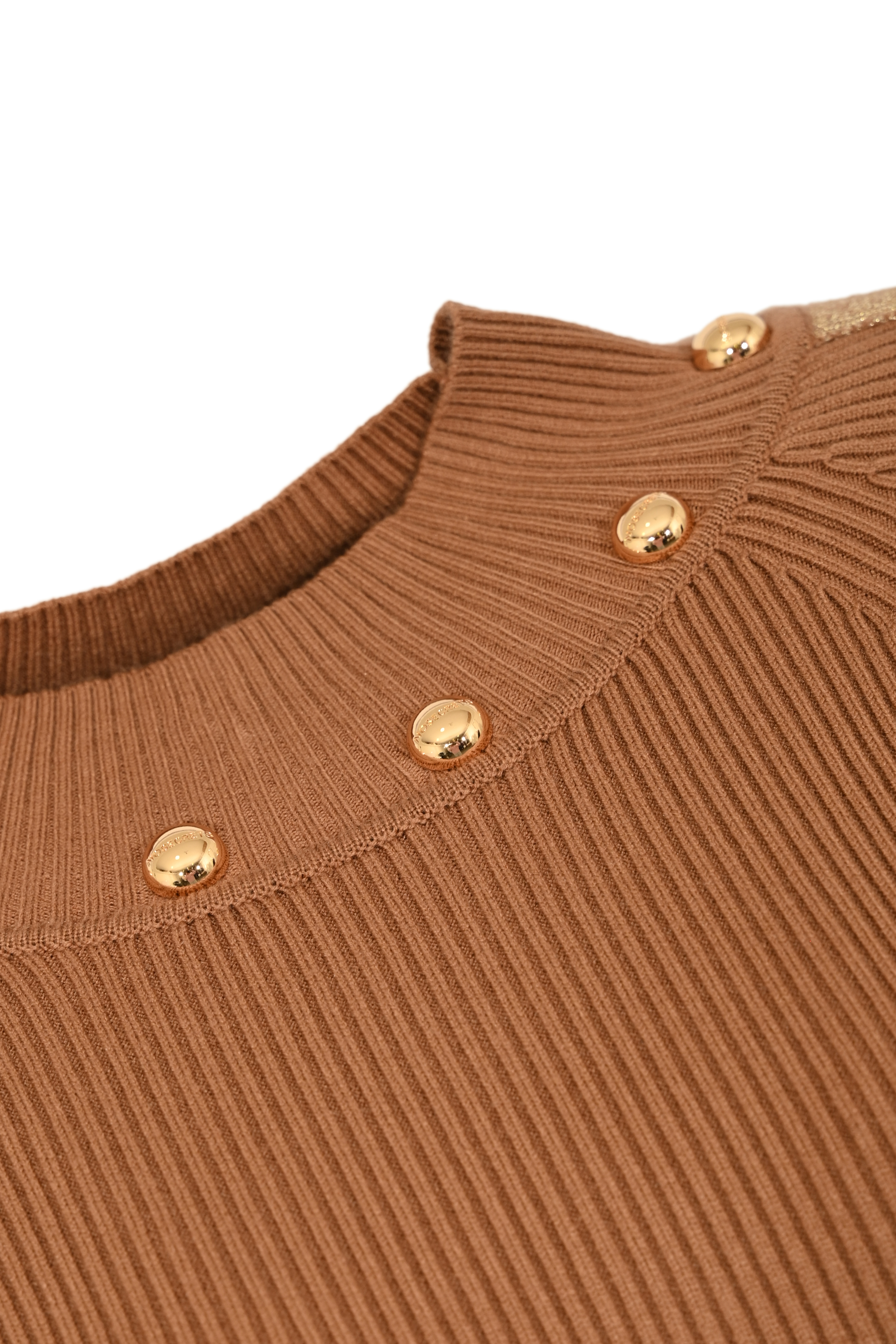 - Collo: dolcevita con dettagli di bottoni dorati
