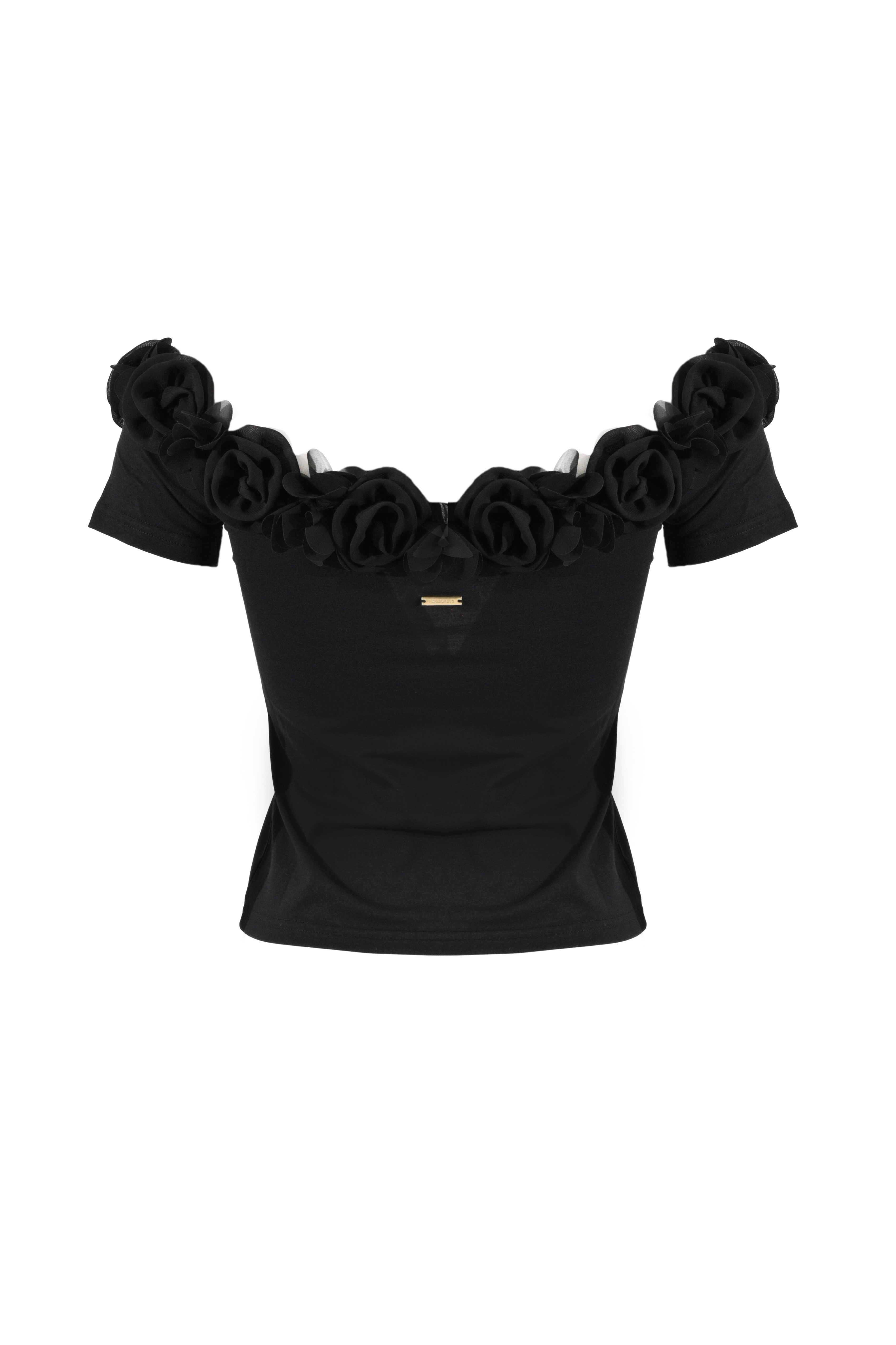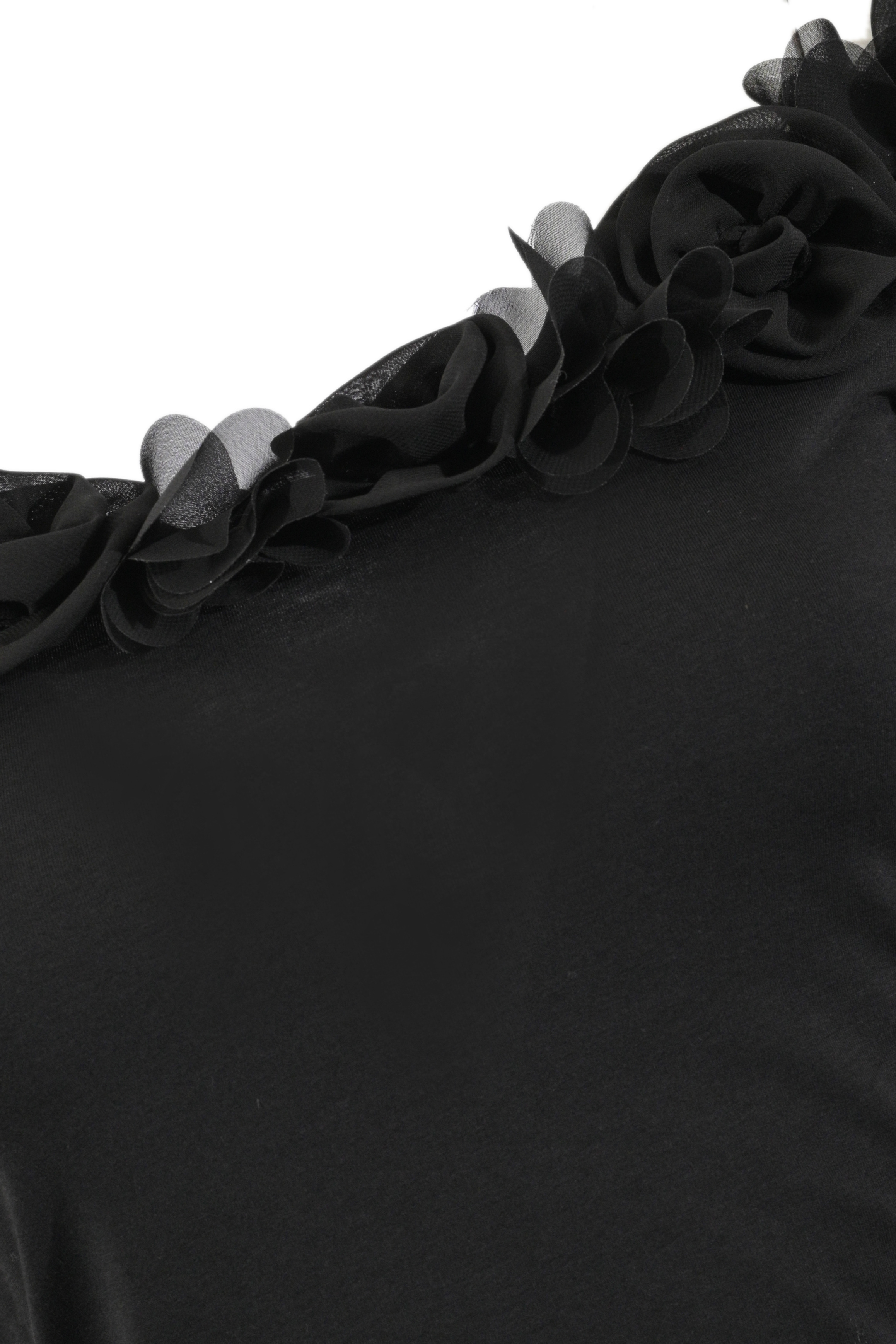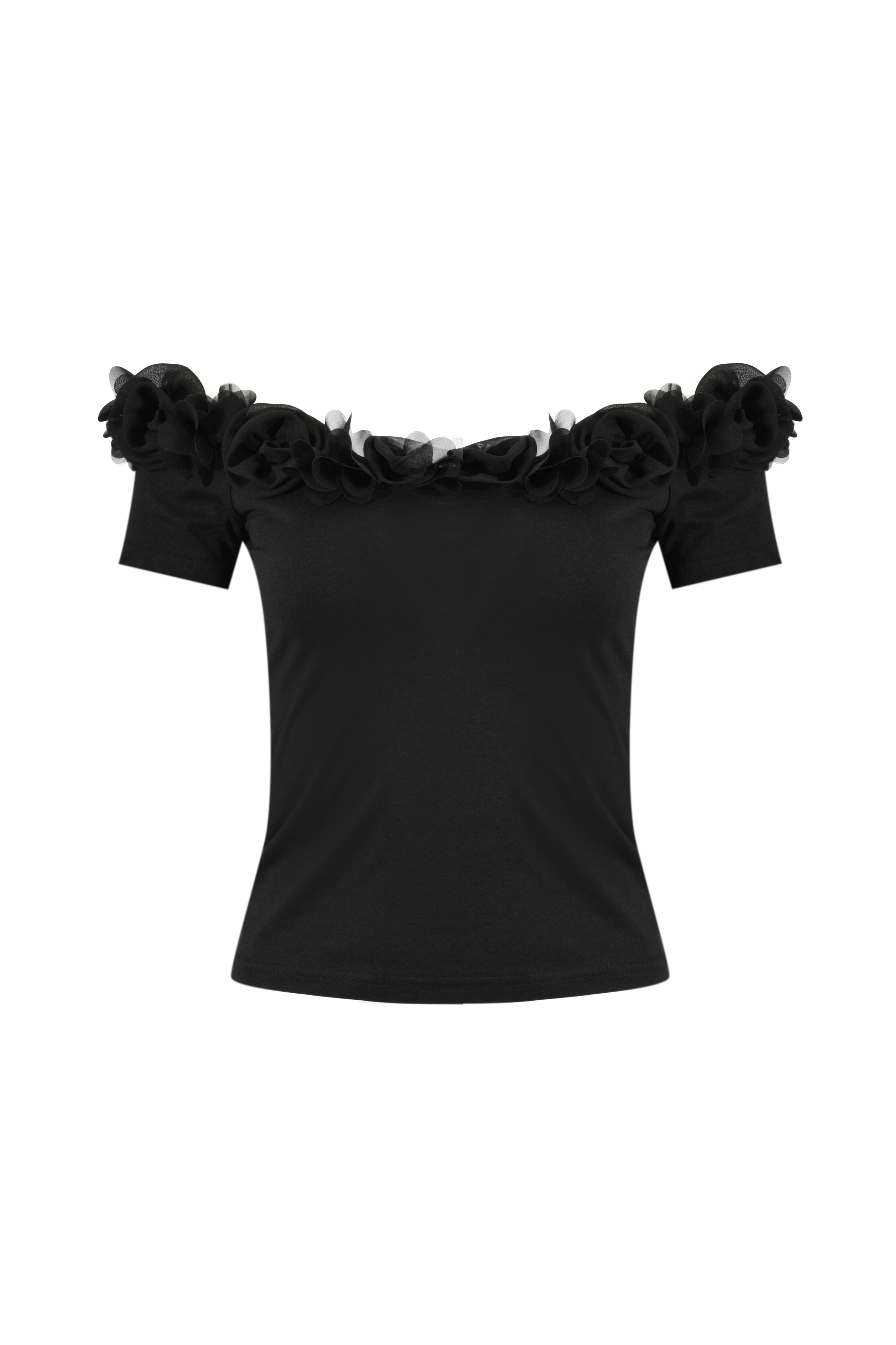 - Dettagli: applicazioni floreali tridimensionali lungo lo scollo, design off shoulder, linea aderente