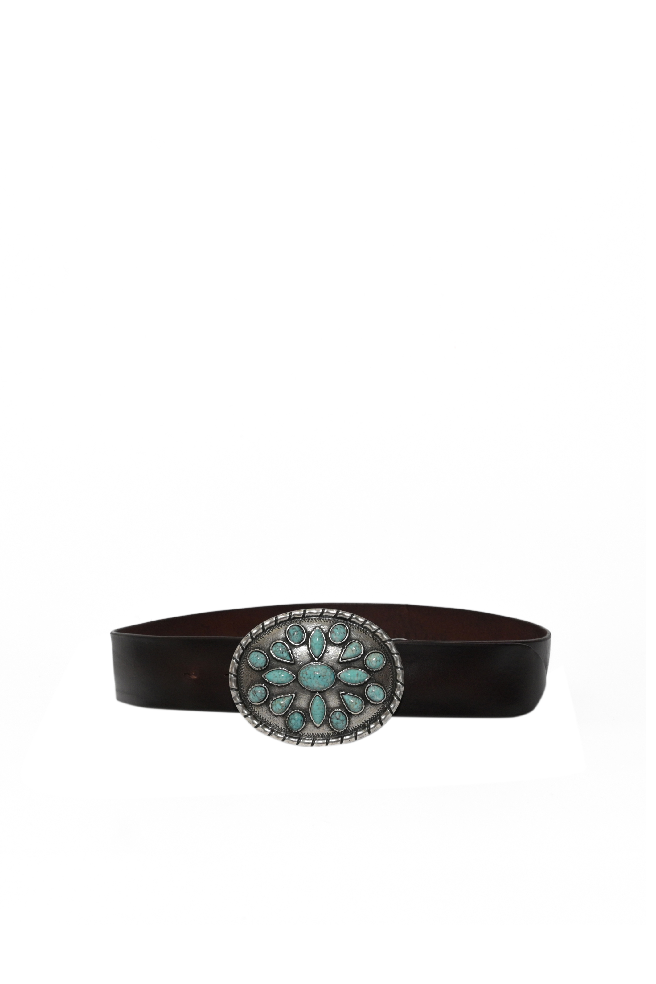 - Dettagli: maxi fibbia ovale in metallo con decorazione incisa e applicazioni effetto turchese, finitura leggermente vissuta, passante coordinato