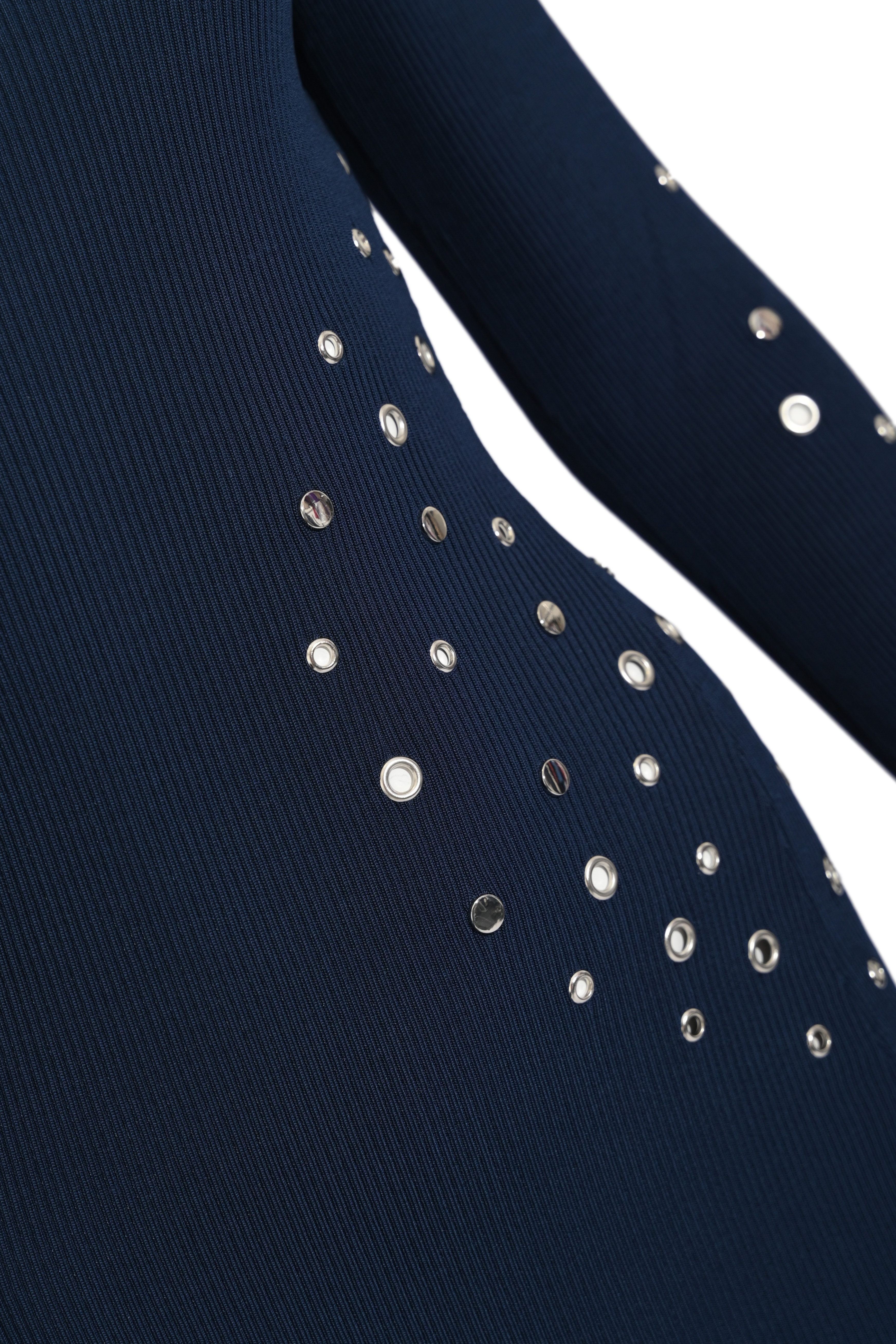 - Dettagli: applicazione di borchie metalliche decorative su maniche e fianchi, lavorazione a costine, placchetta logo sul retro