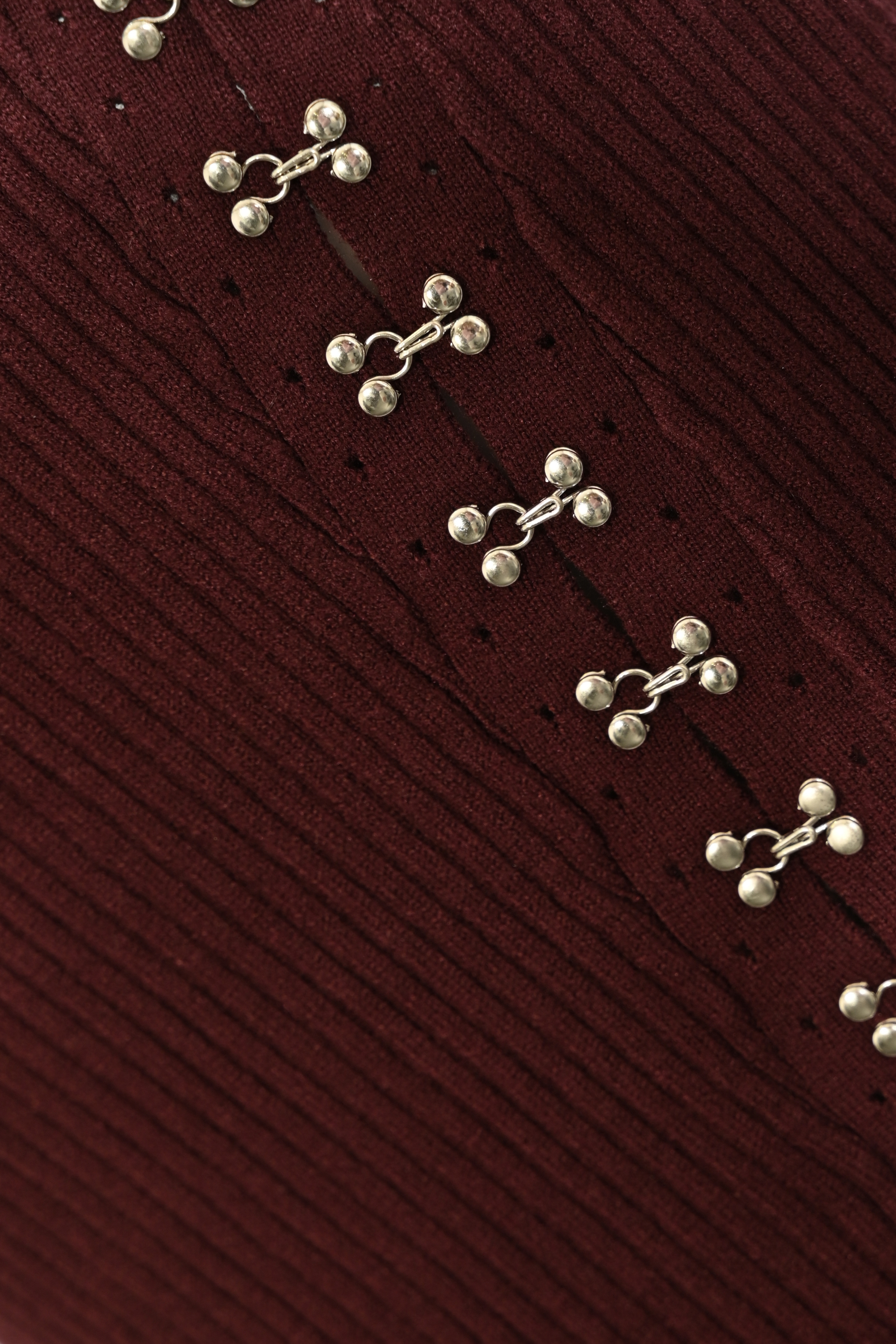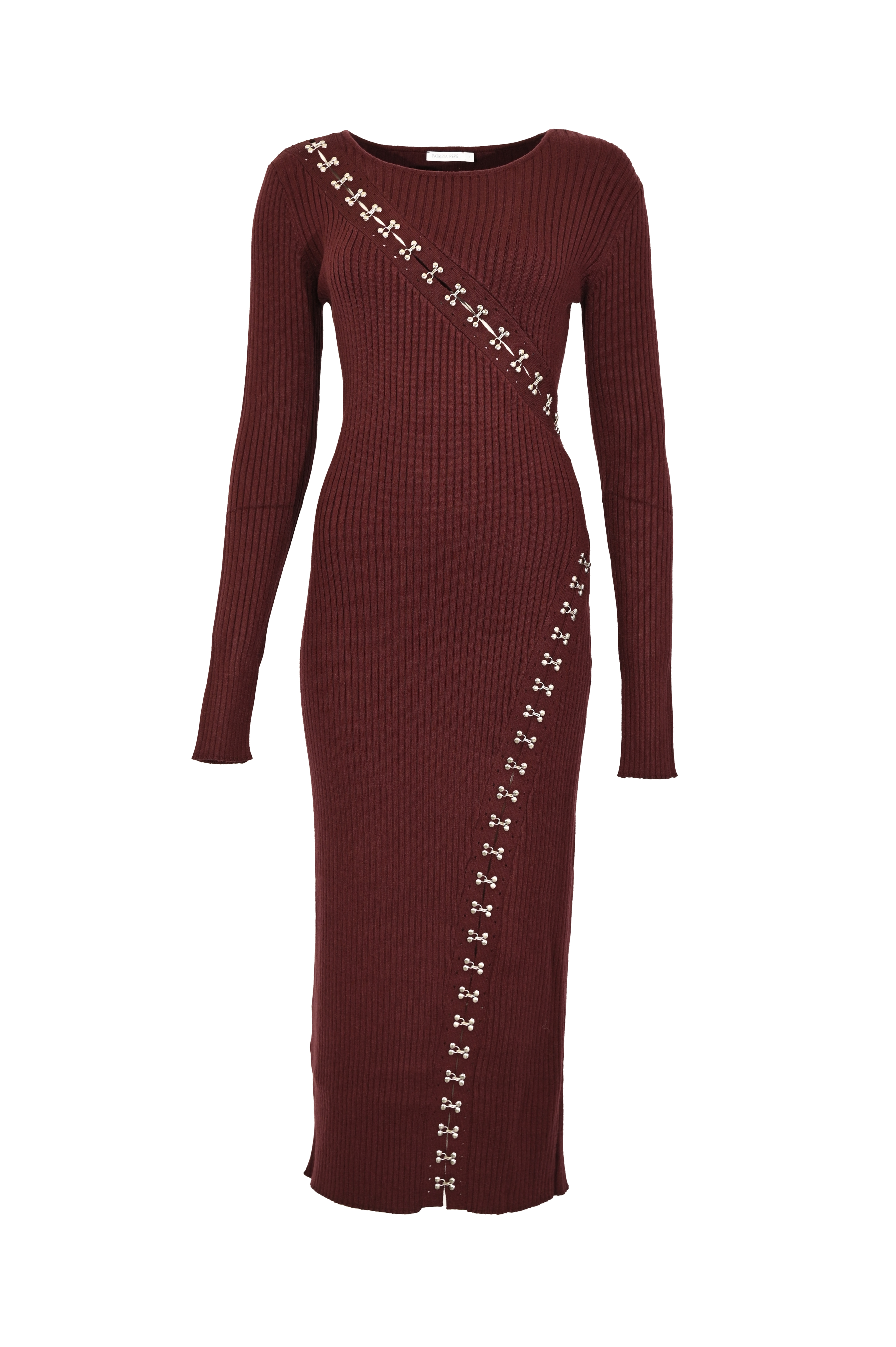 - Dettagli: lavorazione a costine verticali, applicazioni metalliche decorative a motivo diagonale, lunghezza midi, spacco posteriore