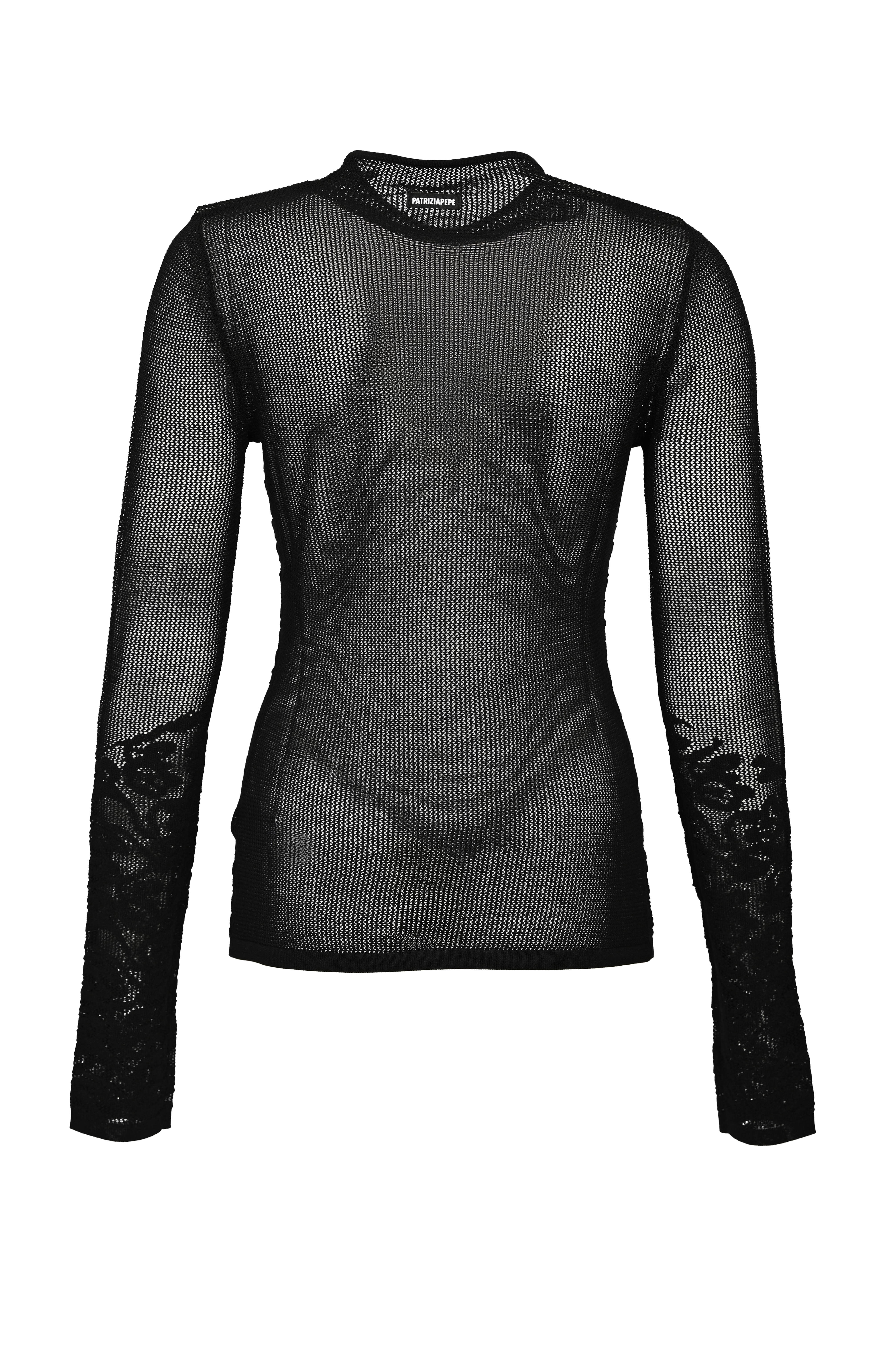 - Dettagli: trasparenze in rete, motivo pizzo tono su tono, taglio vivo sul fondo e ai polsi
